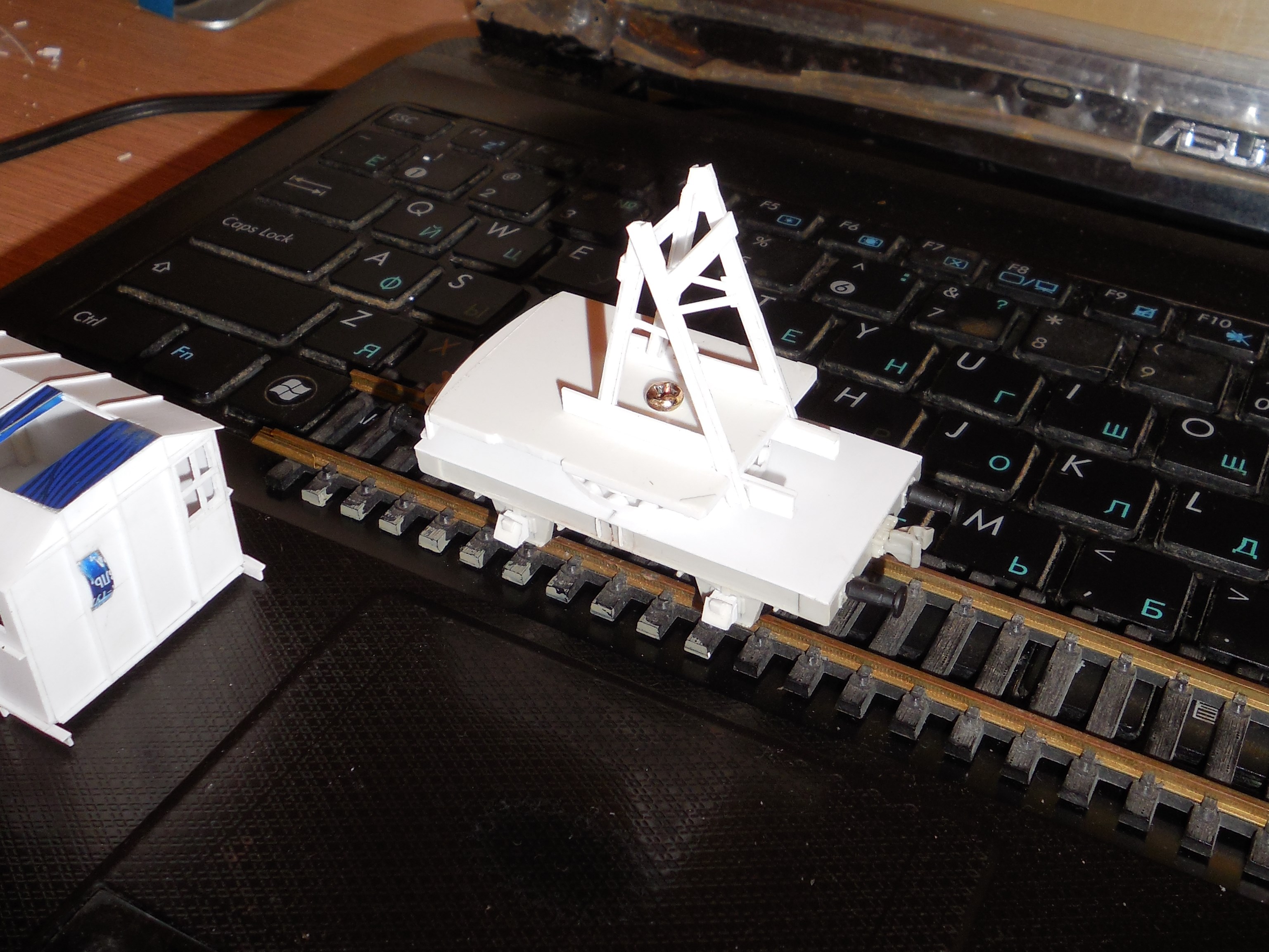 Башня закреплена на подшибнике, делаю стрелу, противовесы под башней сзади приклеил уже(на фото еще нету), фото потом в целом как будет готово.