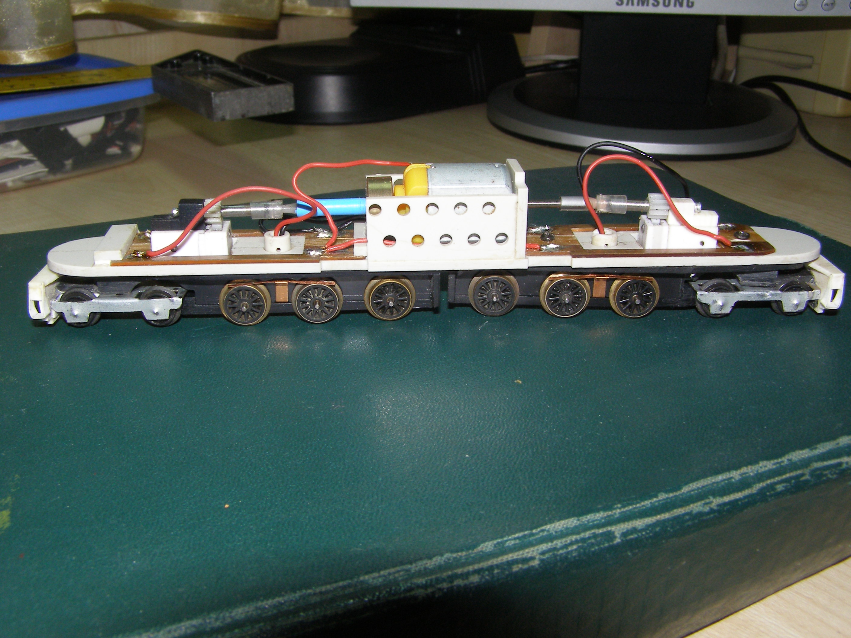 Здравствуйте! Наконец-то добрался до компьютера. Был на море, даче, в общем пляж, рыбалка, не до паровозостроения было. А перед отдыхом по электровозу доделал ходовую -устранил косяки с передними тележками, немного расширил в раме гнезда где стоят редуктора чтобы увеличить угол вращения основной тележки вокруг оси. Это сразу дало положительный результат - начал хорошо проходить повороты. В общем ходовая часть начала неплохо ездить. По маховичку получилась такая история. Изначально планировал ставить маховички. На заводе мне их наточили из бронзы, разных размеров под разные моторчики, а отверстия под валы двигателей должны были сделать такими чтобы маховик надевался на вал в "натяг", а сделали такими же как и вали и маховички на валу не держатся, прокручиваются. Теперь возникла проблема как их закрепить. Есть вариант - пайка, но пока не пробовал. Пока для пробы просто рассверлил отверстие побольше и натянул его на кардан, а кардан надел на вал двигателя. Все получилось довольно туго. На испытаниях все работало нормально, маховичок реально улучшил ход. Еще переделал токосъемы с колес, которые были сделаны тяп-ляп (временно) и черт знает из чего. Раздобыл медный тонкий лист и из него вырезал контакты. Конструкция осталась та же, исполнение лучше ( как мне кажется). Доработал корпус внутри,чтобы все умещалось и ничего не цеплялось. Вот что получилось.