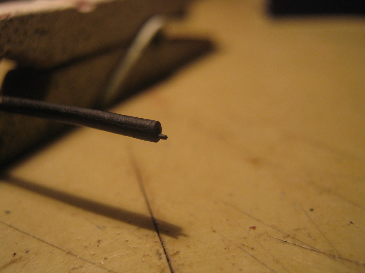1. Медная проволока 0,8 мм. На окончании делаем ступеньку. 2. Припаиваем проволоку 0,5 мм. 3. Затягиваем в кембрик. Делаем пару пшиков чёрной краской. Далее отрезаем нужную длину. Диаметр готового ствола 1,5 мм.