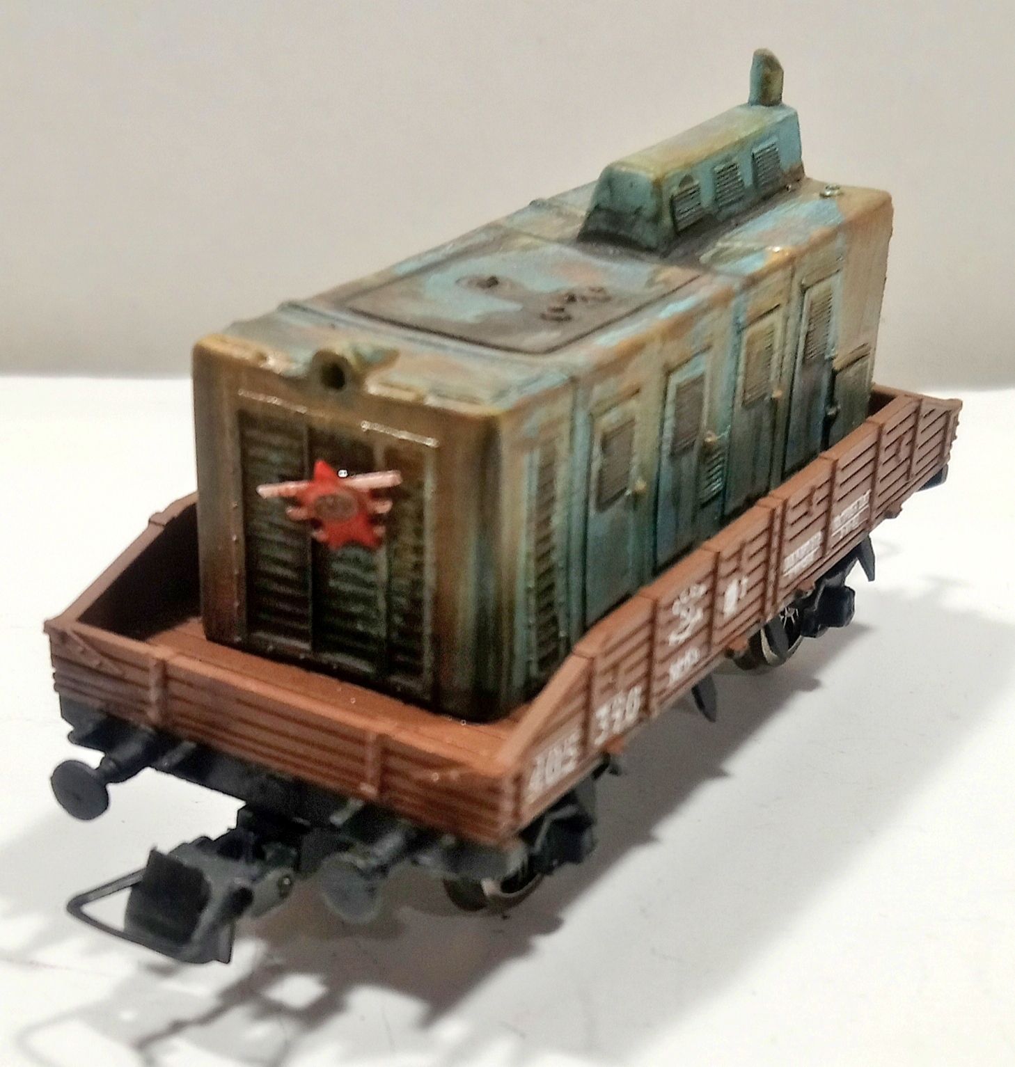 Слов нет - завазюкано класно , жаль я так не умею. Правда как груз для вагона не подходит - веса грамм ,а места занимает много - его бы порезали на куски , А вот приткнуть его в депо возле рем сарая или на задворках депо под забором -самое то.