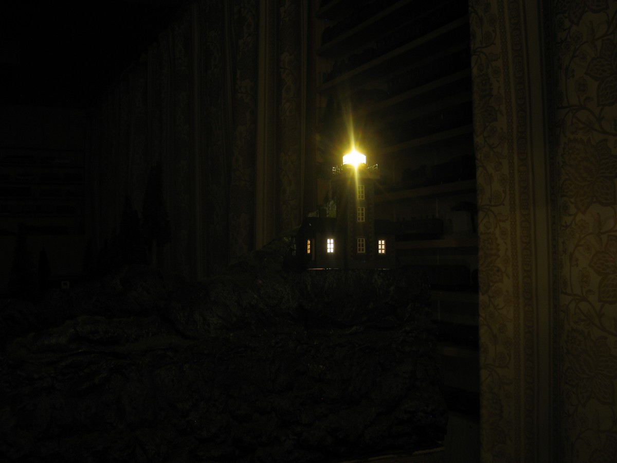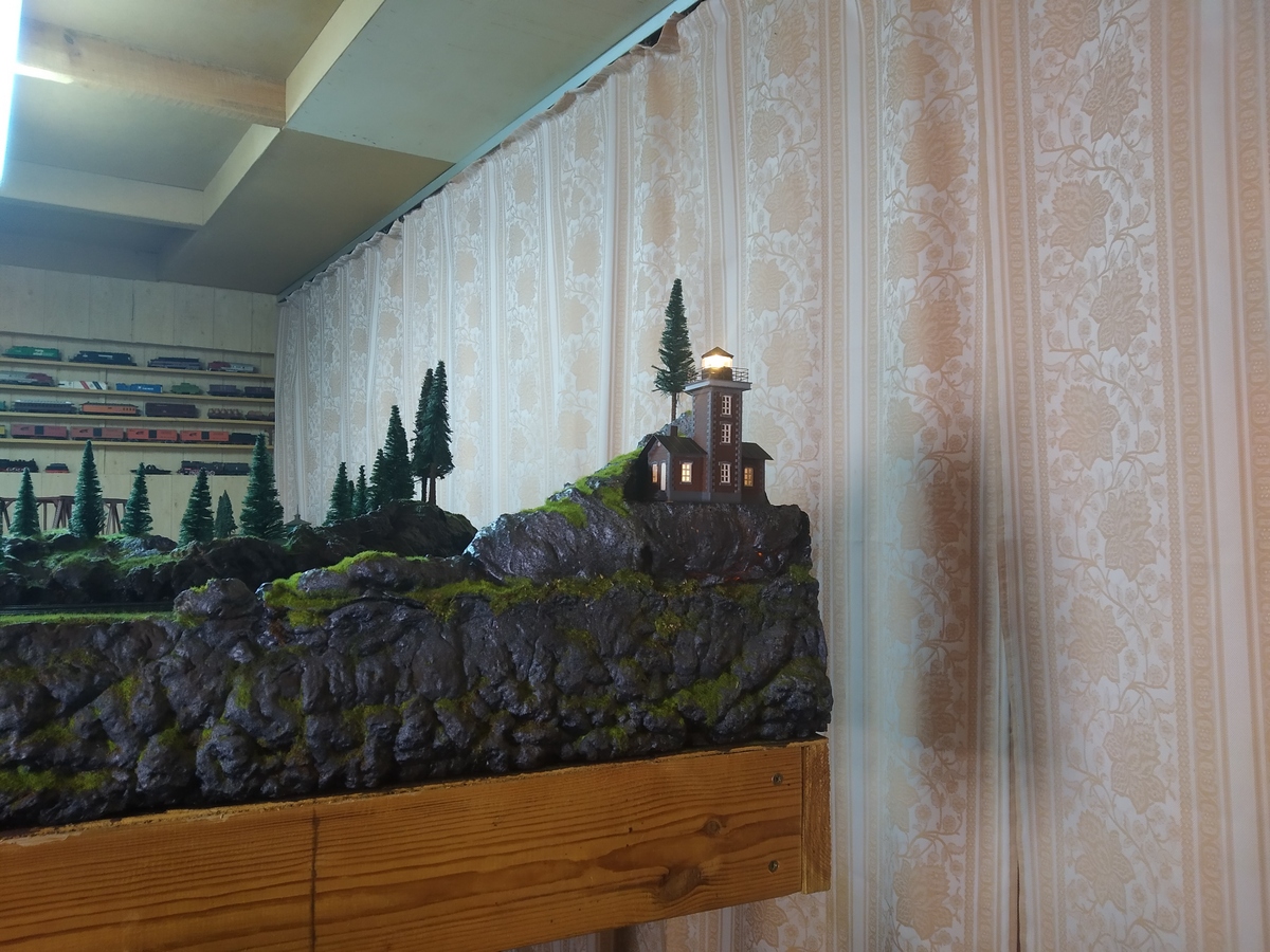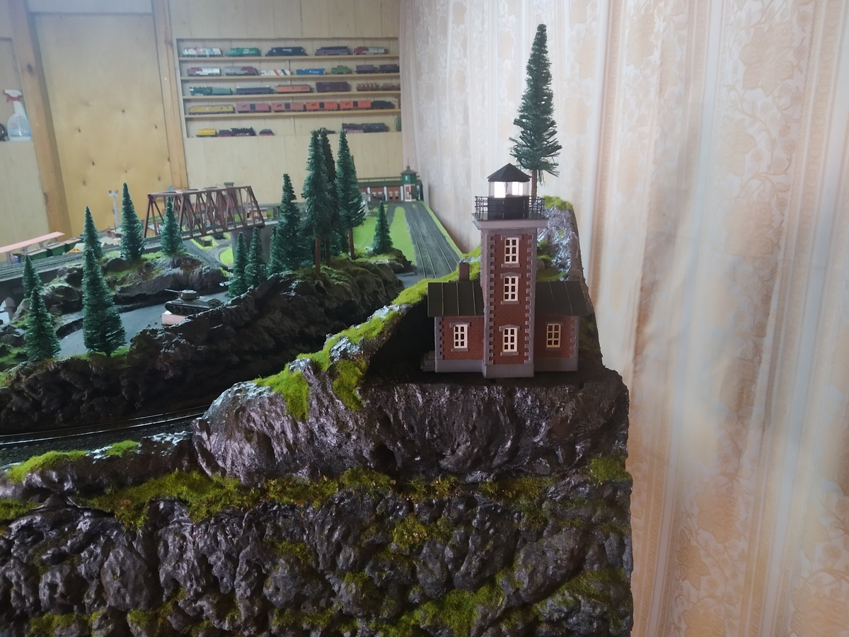 Работа с горой на макете подразумевает наличие маяка. Напомню, что с правого борта намечается модуль с паромной переправой.