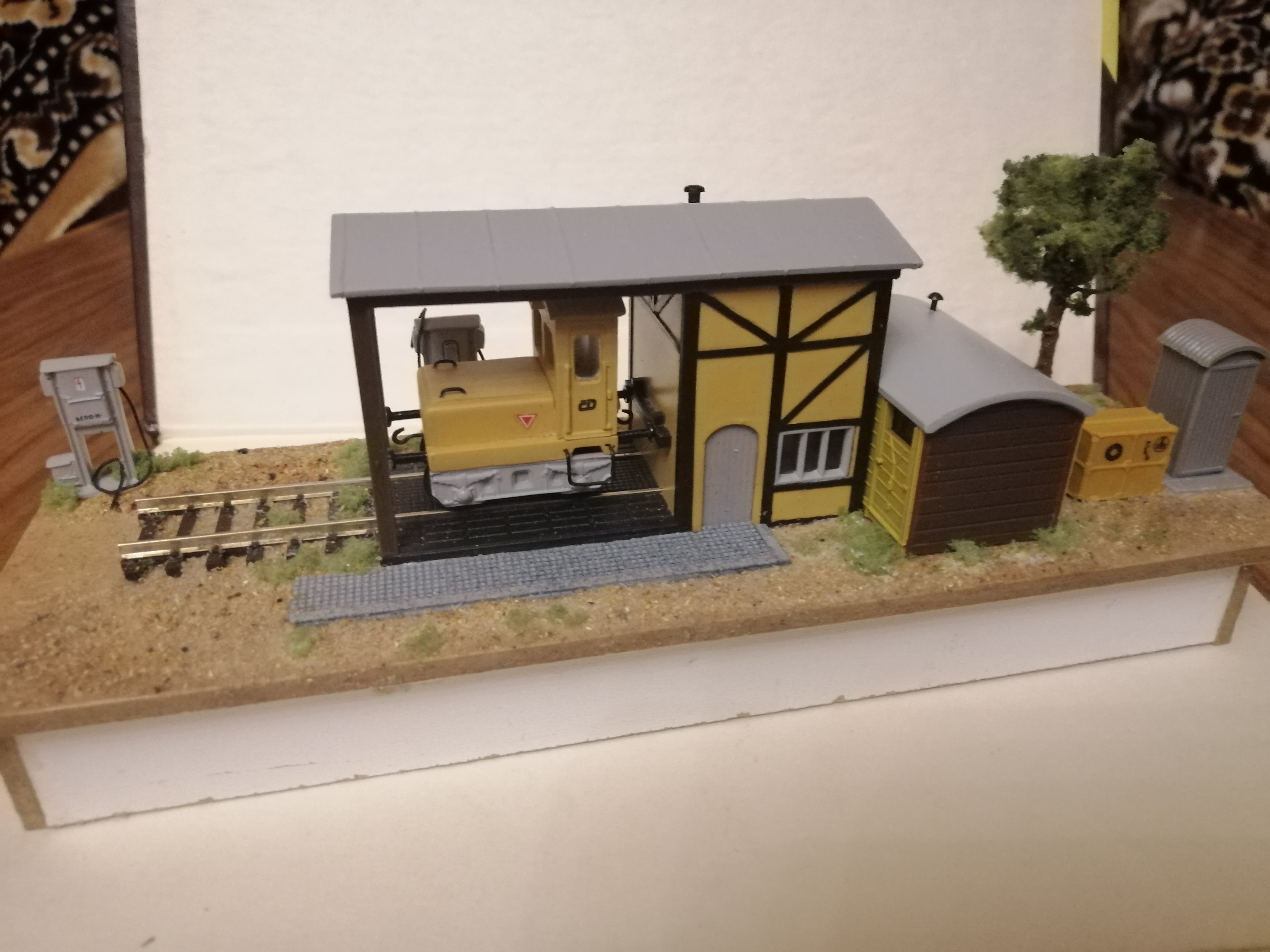 Доброй ночи всем . Выложил очередной запил. Собрал мини диорамку . Для навеса с мастерской сделал основу, приклеил навес и уложил немного брусчатки. Ну и отсыпал ,,под песочек,, и добавил немного травки. Не знаю как с натуральностью - я еще не сильно спец в этом - можете бросать ваши тапки. Запилил енергоколоночки для подключения аккулоков. Примостачил их возле навеса. "Профсоюз" обявил забастовку-им надо помещение для хранения запчастей и новых аккумуляторов. В закромах нашелся кусок корпуса вагона - точнее средина средина с отбитыми торцами. Подровнял остатки корпуса . сделал торцы под доску. отверствия приспособил под окна. Установил сарайчик возле мастерской - профсоюз отвалил , Ну и что б рабочим повысить удобств - присобачил рядом контейнер для муссора Ну и что б окончательно угодить работягам - соорудил им туалет из талефонной будки от MAMOSa -надыбал в закромах. А чтоб тубзик не нагревался на солнце -посадил дерево. Пришлось потратить еще пол-часа и пучек проволки, но чего не сделаеш ради своих работяг. P.S. Белая масса у корней дерева- клей не высох после посадки. Вобщем такая вот диорамка для будущего депо. Можете бросать тапки.