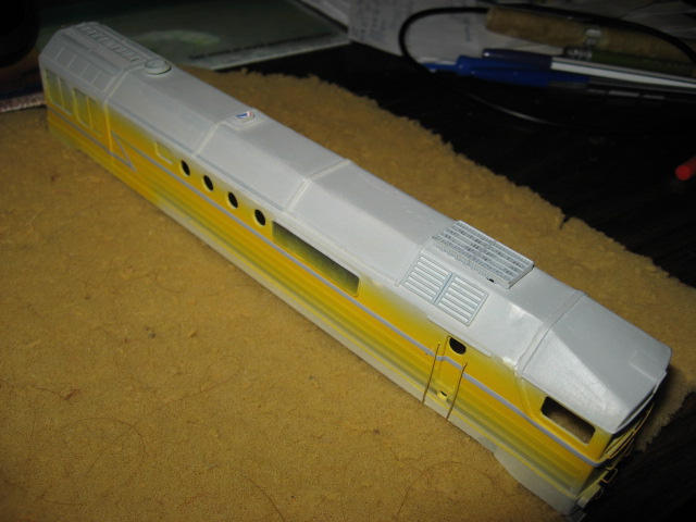 Загрунтован, дошкурены основные проблемные места. Замаскирована желтая полоса, дальше покраска основным цветом.