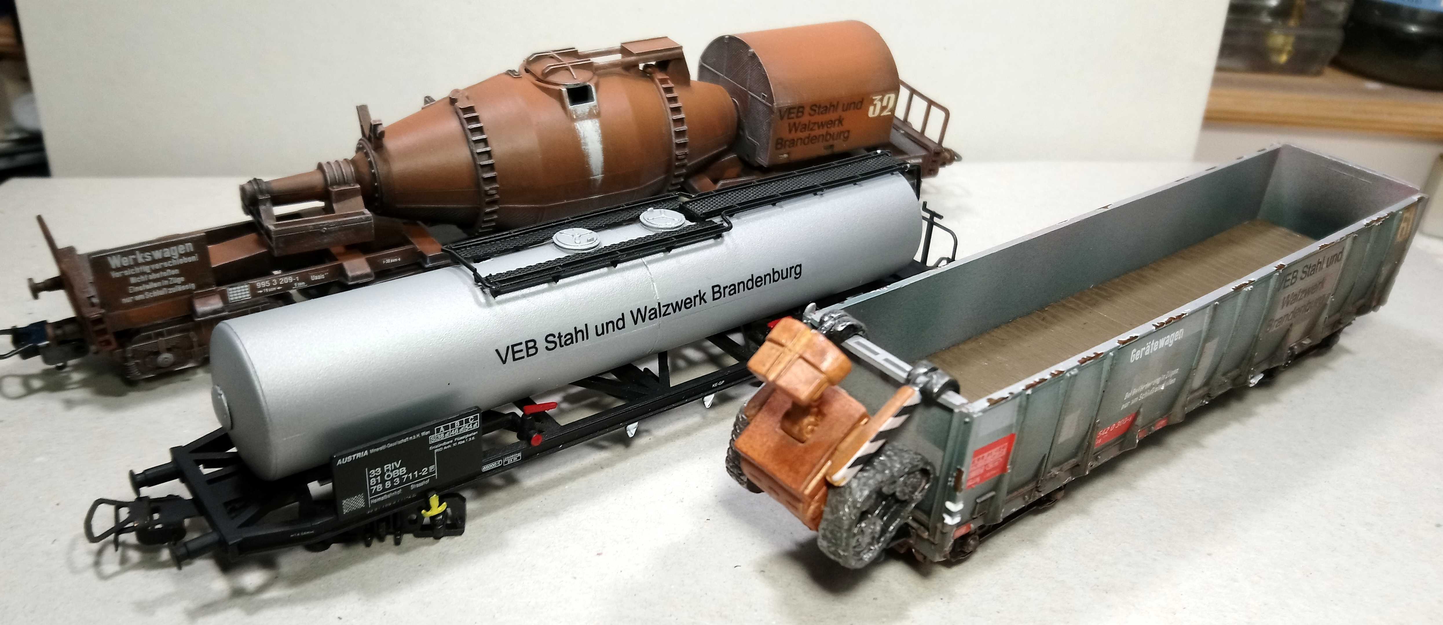 Здесь видно три метода.Слева направо по каждому вагону:сухая кисть,заливка серой краской,аэр.