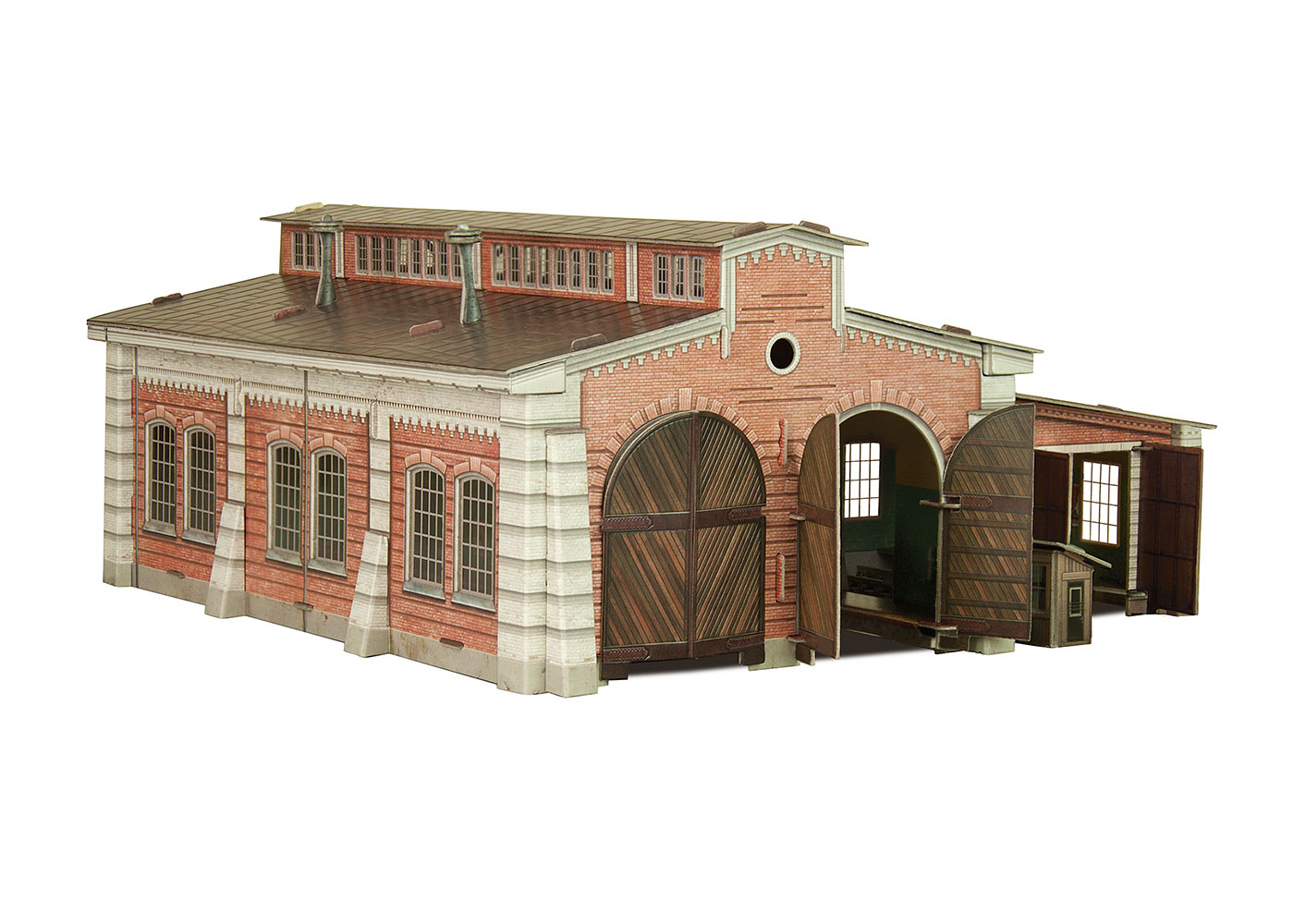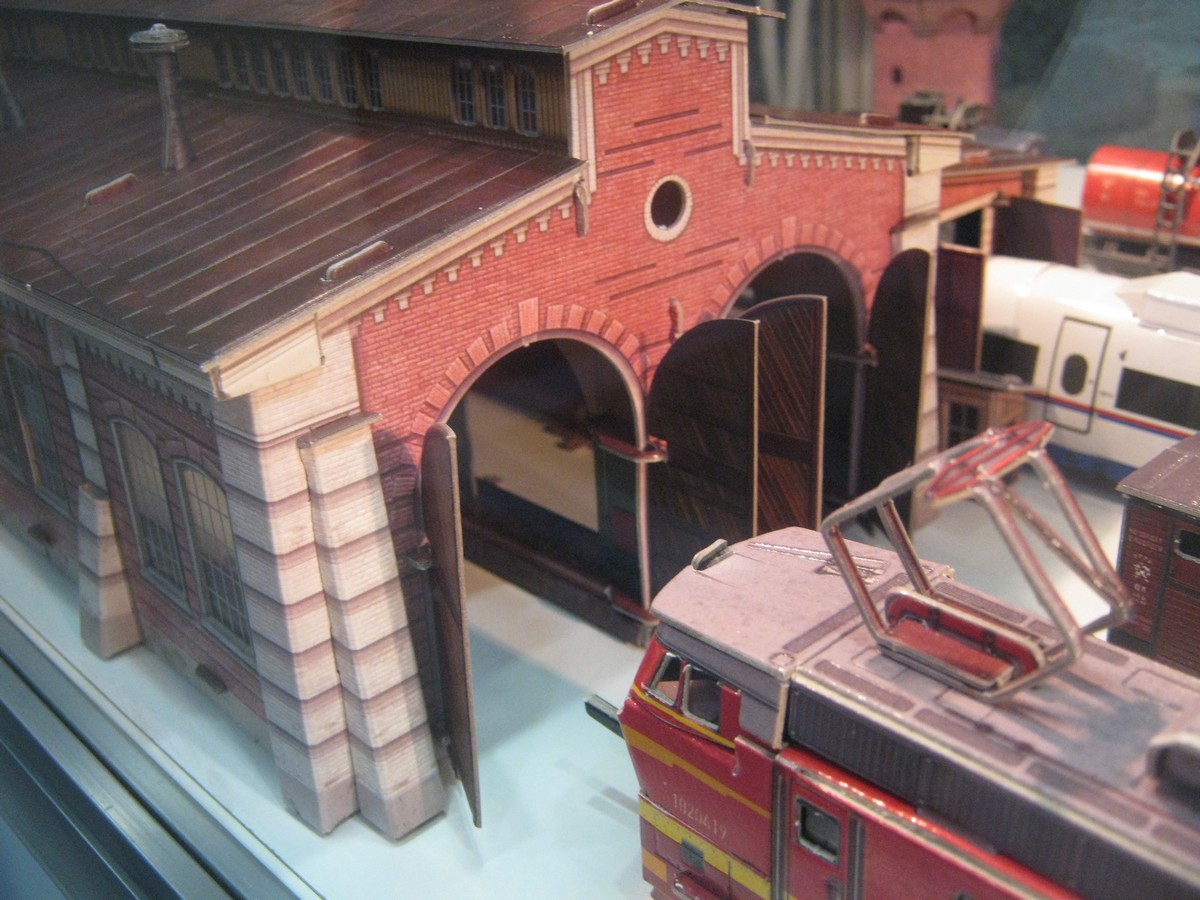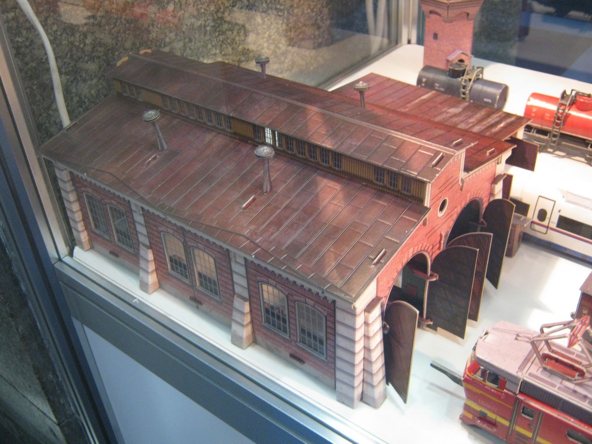 Депо тоже рассматривал долго. И мне его тоже пытались продать. Сделал пару фотографий, насколько позволило витринное стекло. Имею в планах подобное строение, но в своём исполнении. Место на макете предусмотрено и позволяет расположиться без проблем. Фасад с воротами уже давно сделан.