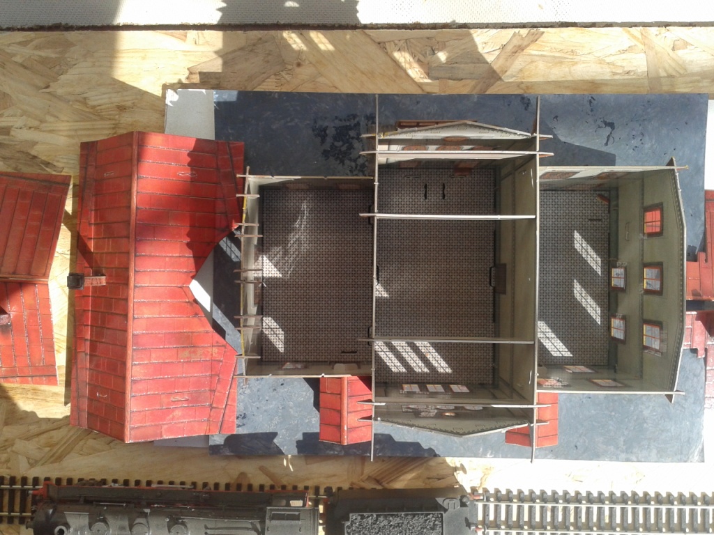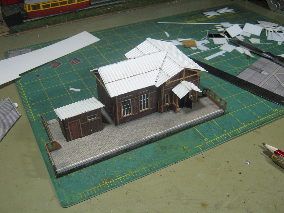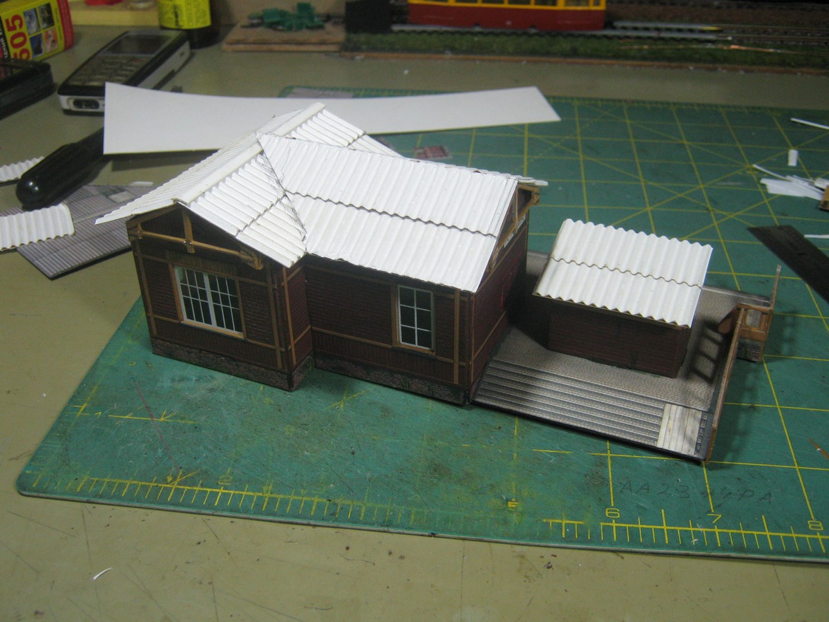 Собрал вот такую конструкцию. Далее закрасил гуашью все торцы, задул матовым лаком, вставил окна и приступил к крыше. Не знаю, как должна сойтись фирменная кровля, но мои заготовки, сделанные в точном соответствии с размерами оригинала, не сошлись и пришлось повозиться со сведением. Собрать полностью не успел да и курить надоело.