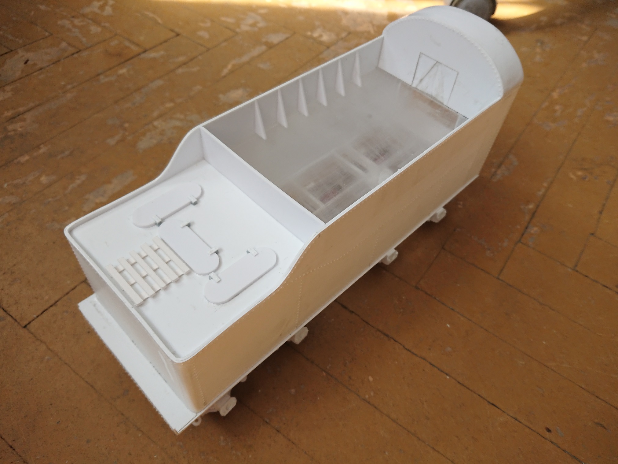 По ходу создания подвижного состава мы практически не делали полноценных фото. У нас сохранились только рабочие снимки и то не всех этапов процесса. Состав номер два: паровоз серии Э, два 14-ти метровых пасвагона, платформа и НТВ.