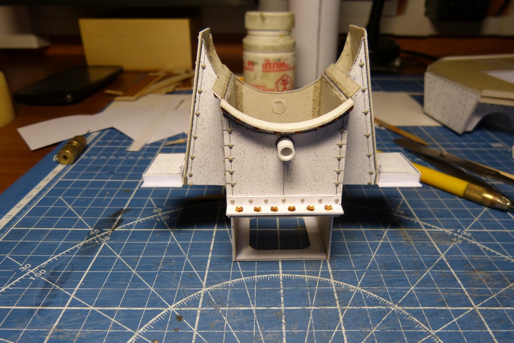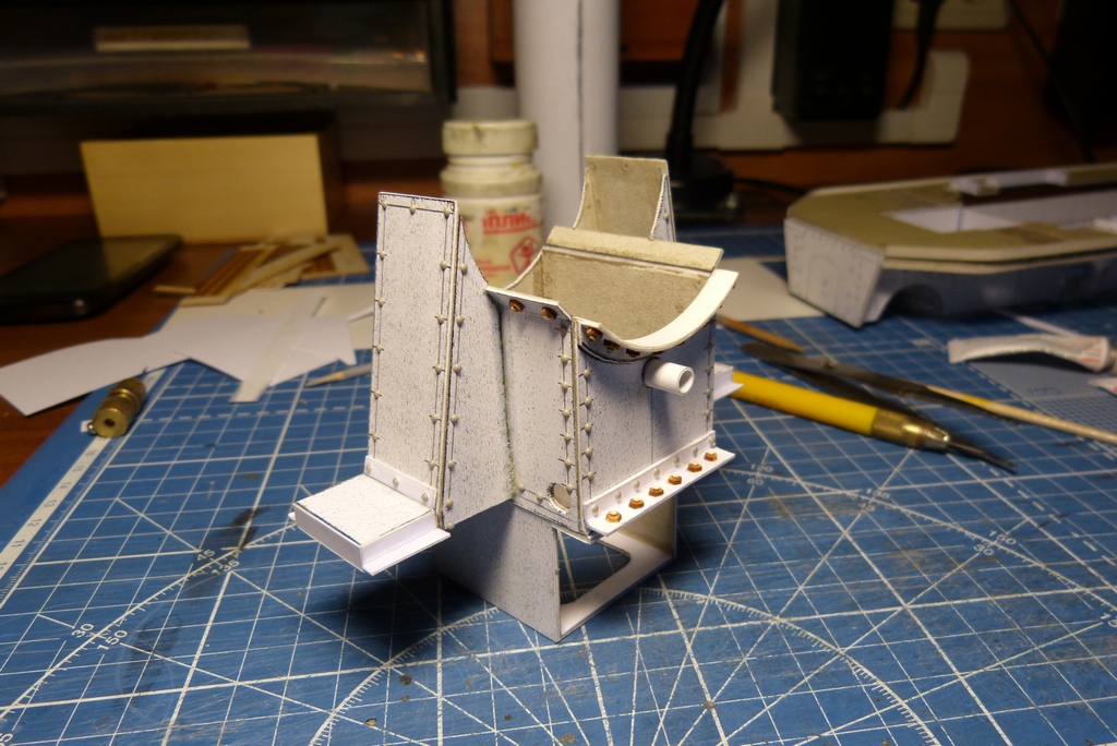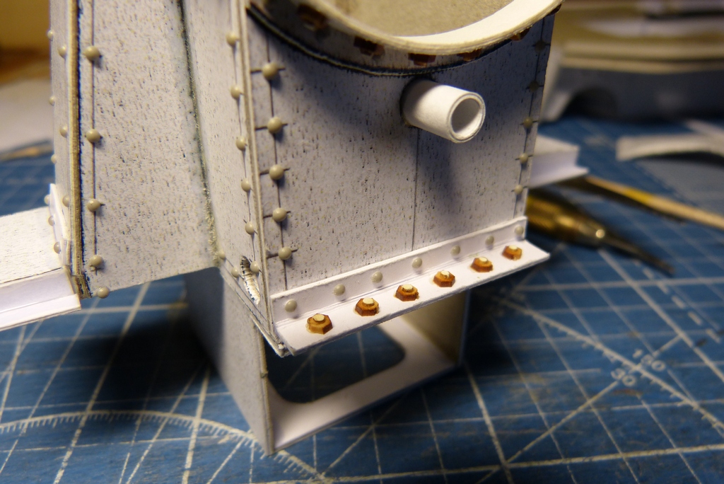 ну и собрал подбрюшину котла,кожух встал как надо,кожухи паровых труб и крышки масленых горловин паровой машины.Заклепки Мастер клуб 1.6мм , гайки резка 2мм и сделал имитацию торчащих болтов 0.8мм,пробойник из иглы для капельницы