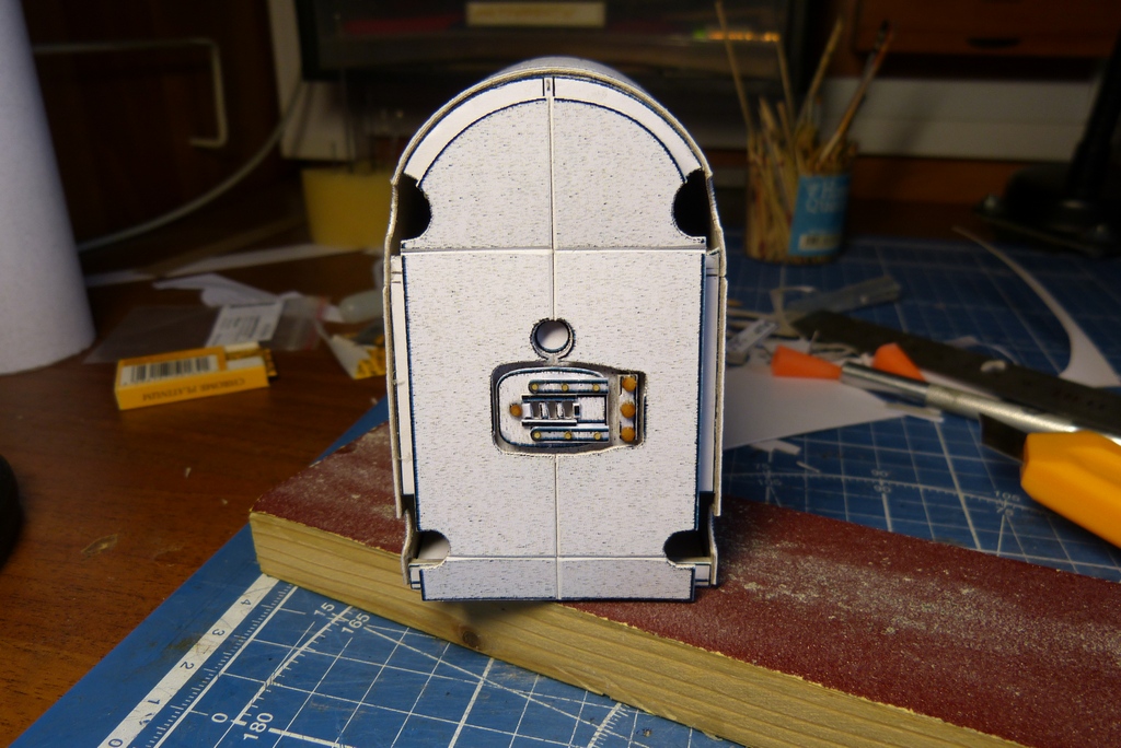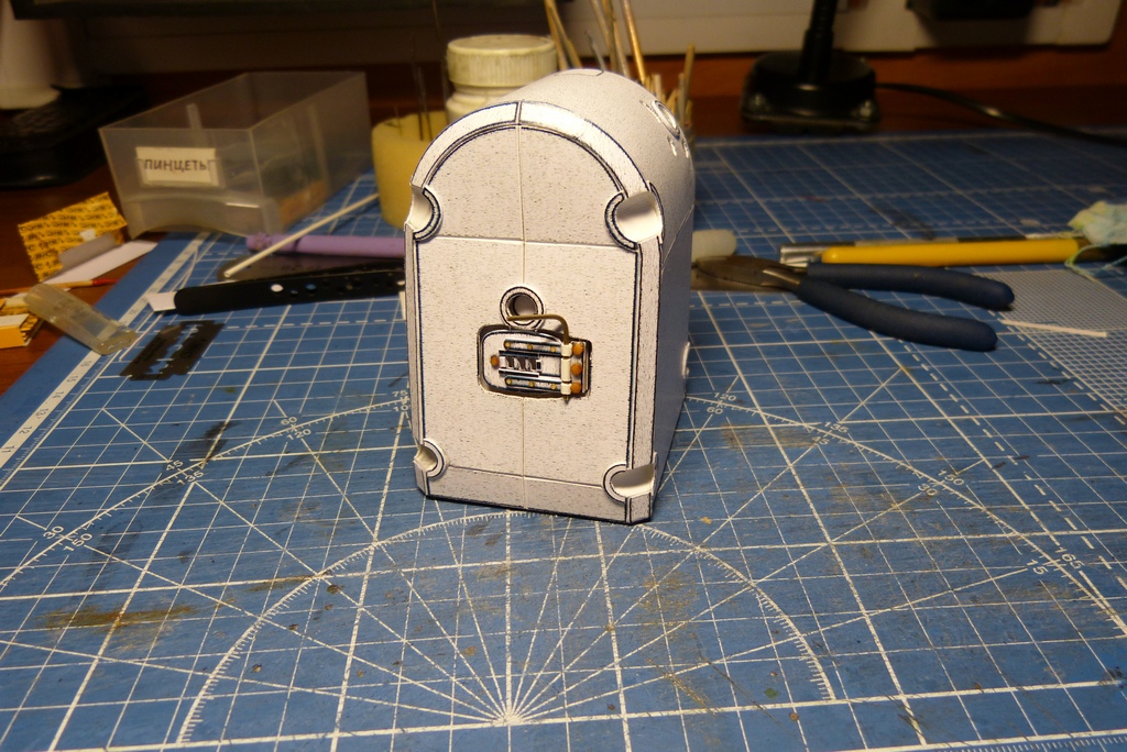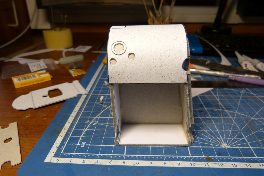 начал сборку кожуха жаровой коробки,детали обшивки даны целиковыми,но зная конструкцию этого узла раскроил верхний и лобовой листы,чтобы швы были после грунтовки и покраски хорошо читаемы немного бруском снял фаску с граней ну и собрал,так как жаровая коробка находится внутри кожуха и окно топки находится на корпусе жаровой коробки и она должна смотреться утопленой сделал имитацию углубления,ну короче вот