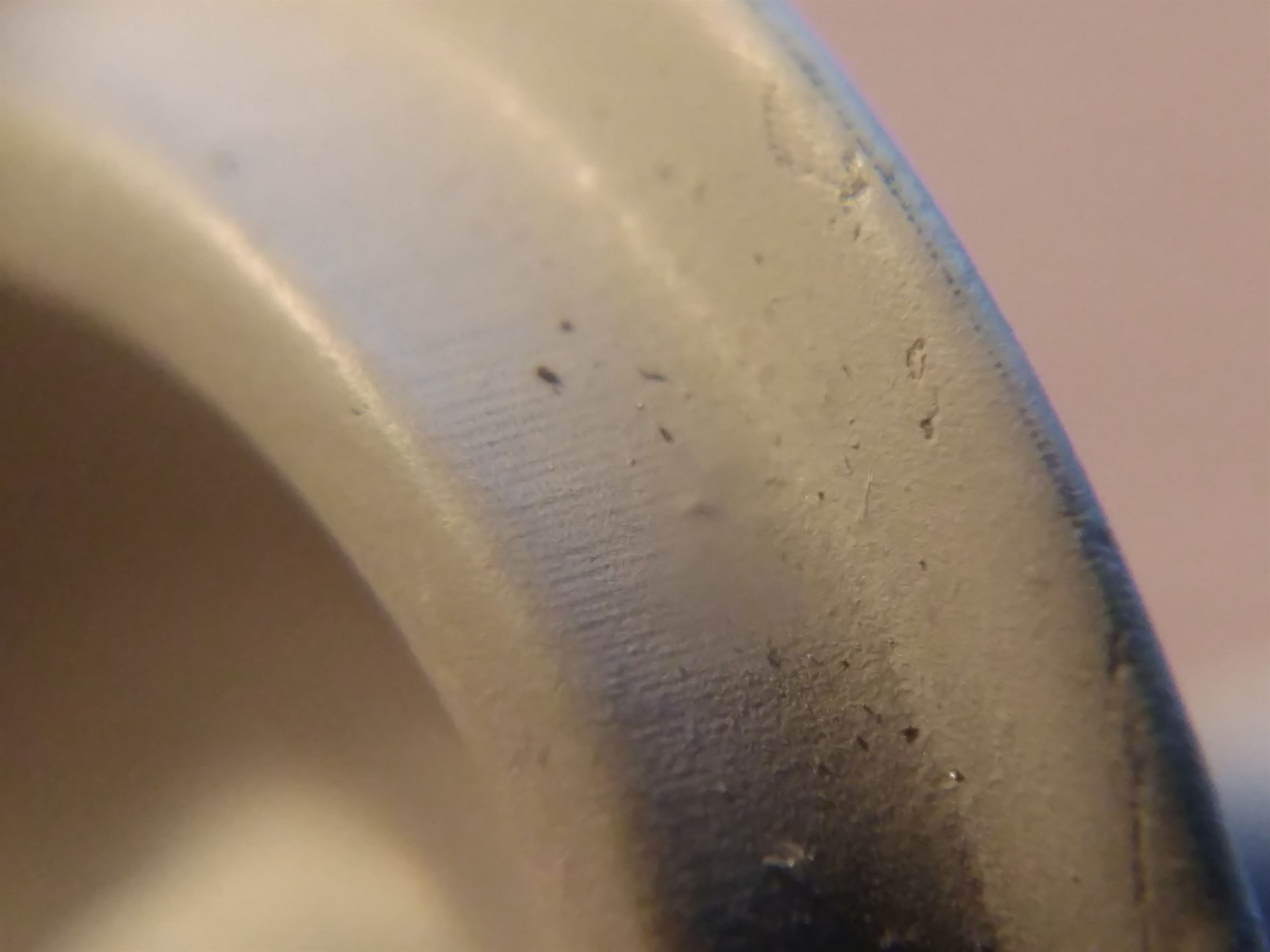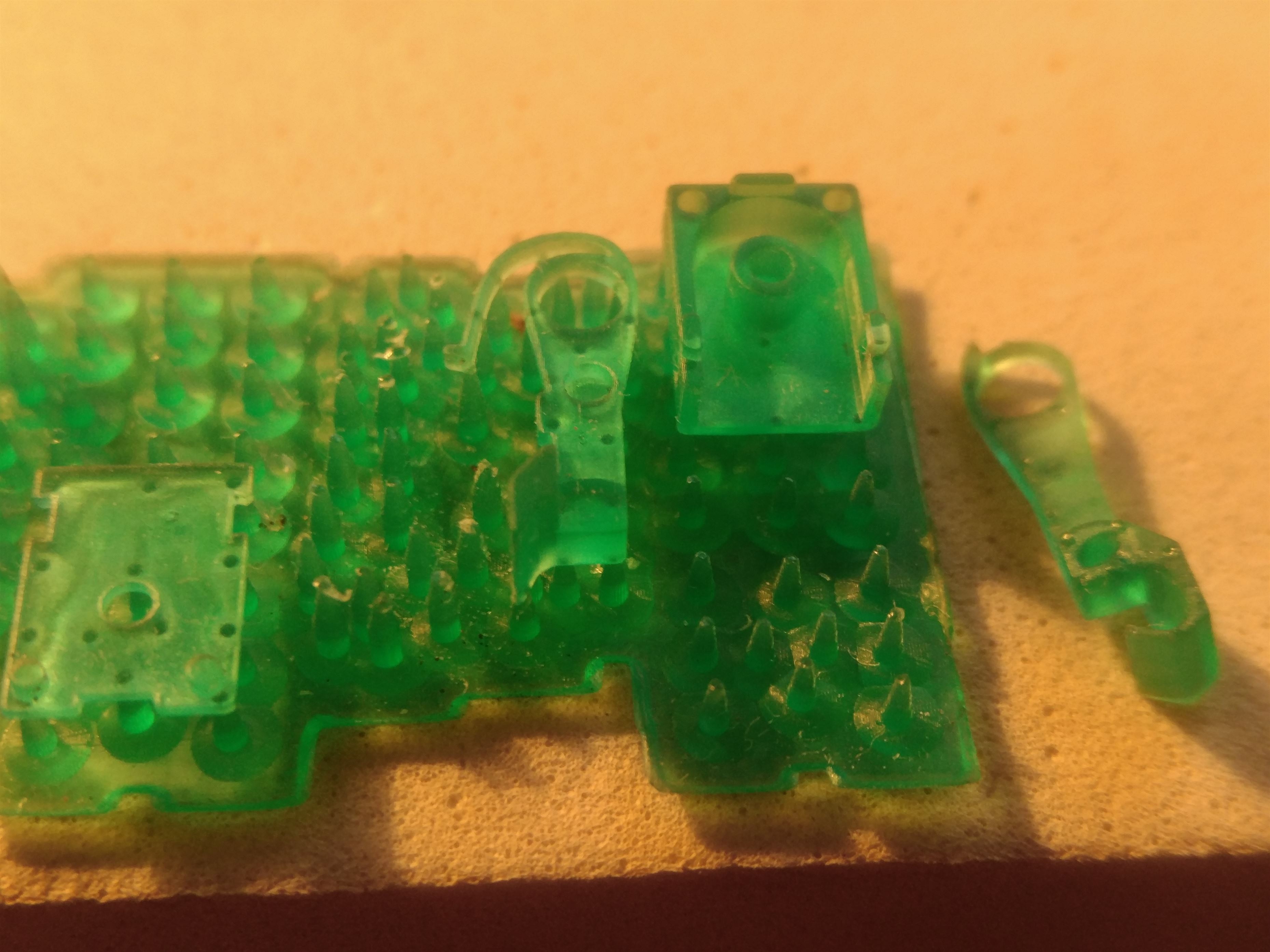 Грязные пятна - это попытка покрыть грунтом, который не держался на фотополимере. Грунт отмыл, мелкие пятна остались. Она же в грунте.