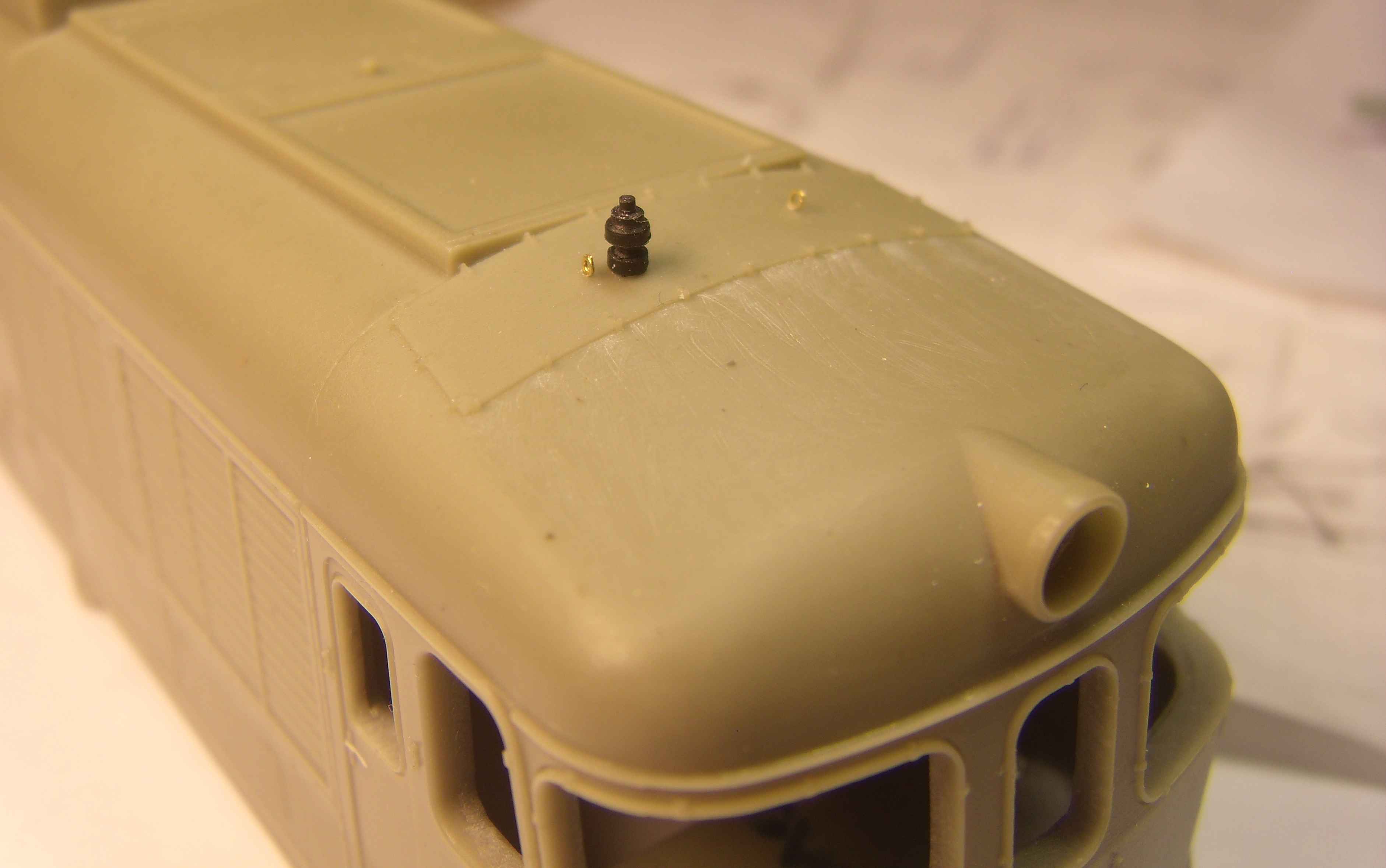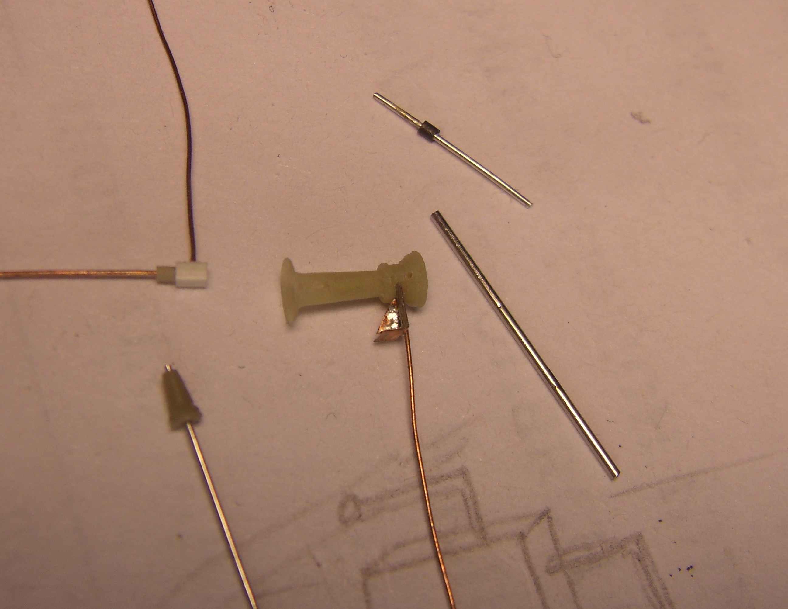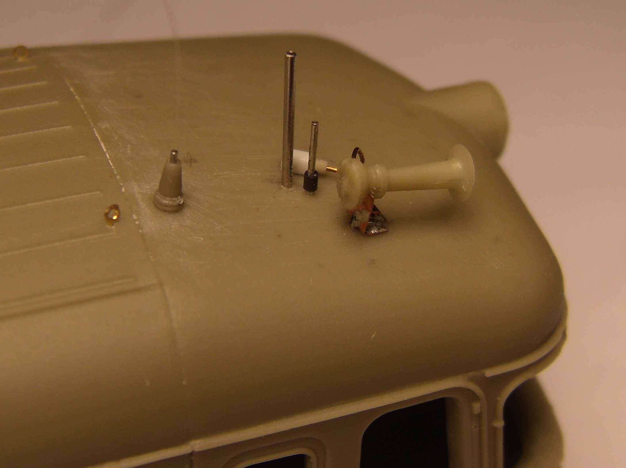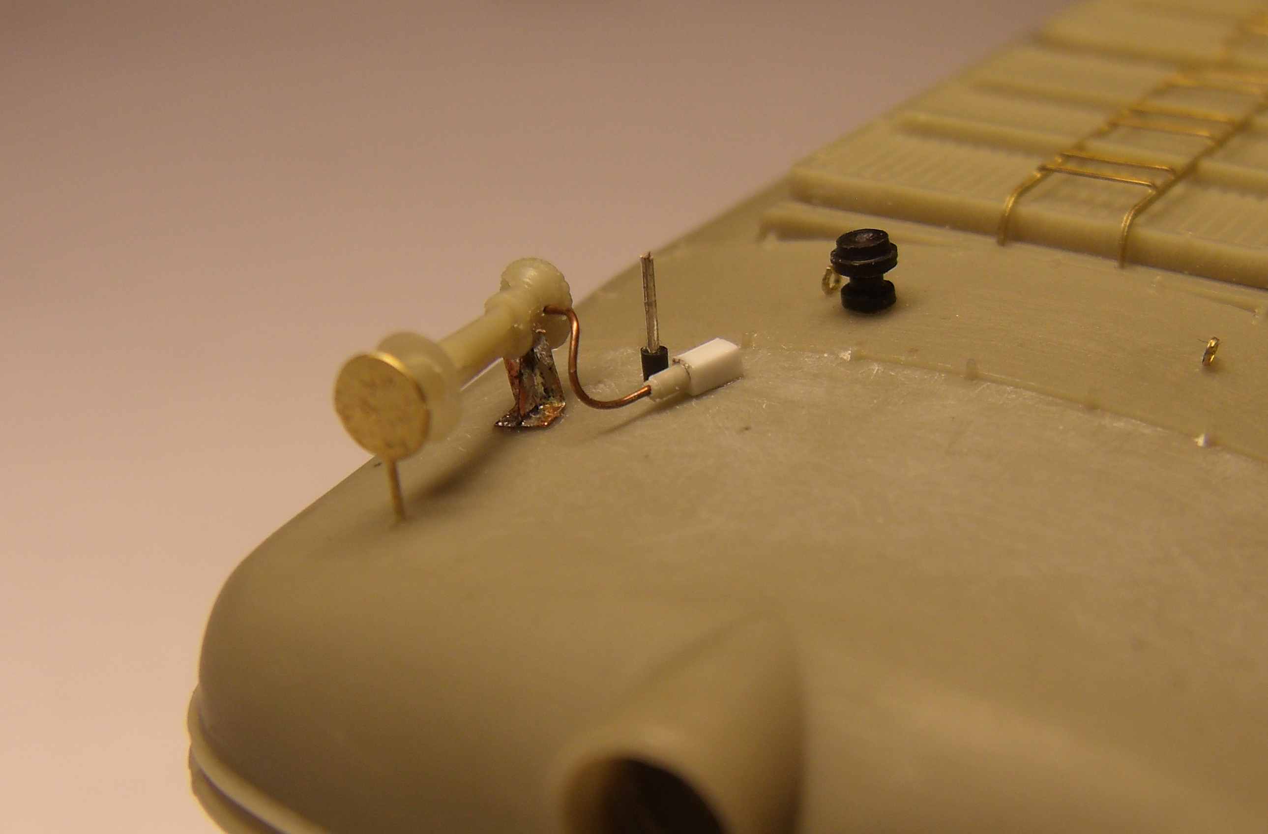 Изготовил надкабинную мелочёвку, а именно: сделал стойку антенны из иглы от шприца, выточил изолятор антенны, крепление для тифонов, и имитацию свистка...