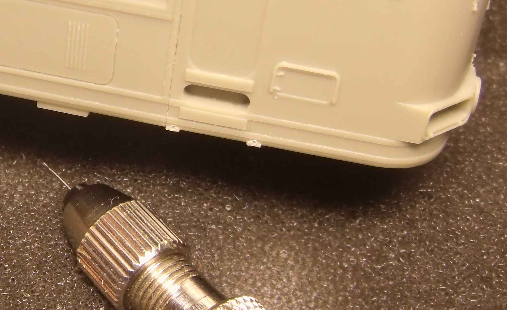 Насверлил отверстий под все поручни, 0.3мм.... Поручни будут устанавливаться после окраски кузова, так сказал делать Леонид (Leonid Popov), который уже прошёл эту тропинку, окраску кузова. Причина, поручни мешают сильно клеить маски и декали, а их в этом наборе очень много 8-) , и сложные :? .