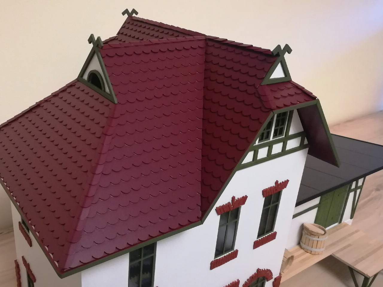 После поклейки кирпичей и фахверка занялся кровлей крыши