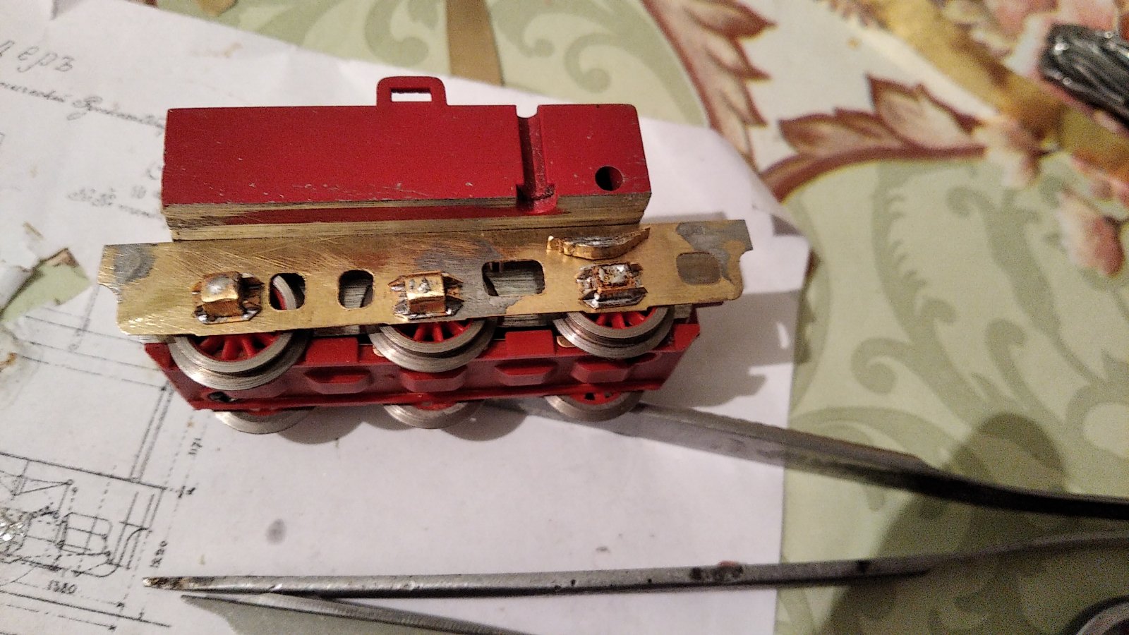 На паровозах более позднего выпуска они уже были в будке, в частности в Ов. Скорее всего на данном паровозе нечто вроде инжектора жиффара или может быть его модификации или нечто подобное. Но в любом случае управление паровозом было очень сложное. Пример современной колонки. В последствии они стали намного проще. Ну та ладно не отвлекаемся. Сделал буксы и провел примерку. Были вопросы, почему все в припое. Ответ прост, стал паять кислотой, а она заливает все. Имхо чистить будем потом. Сперва все должно быть прочно ибо в процессах примерок, можно все по двадцать раз ломать и делать.