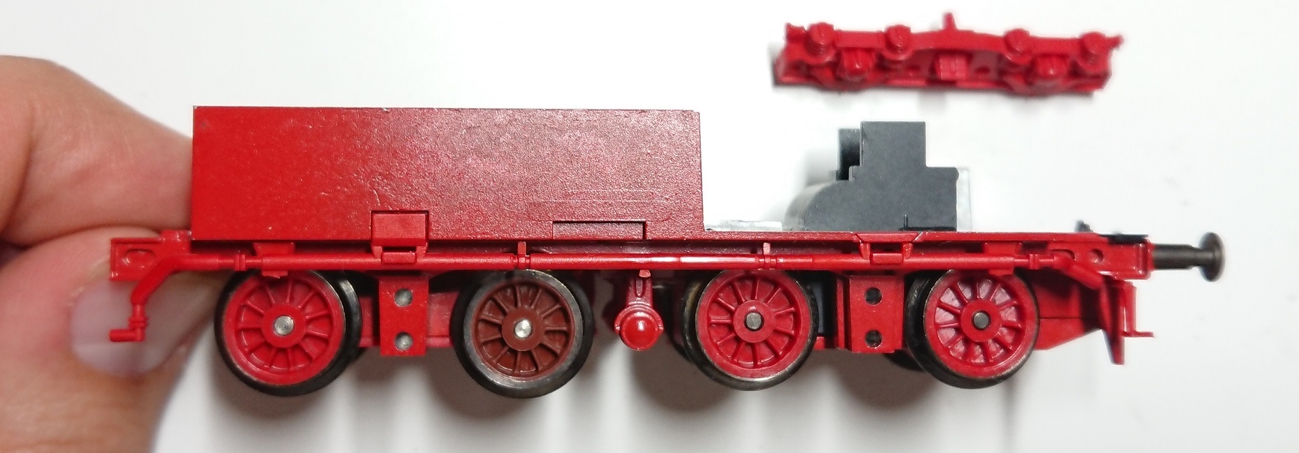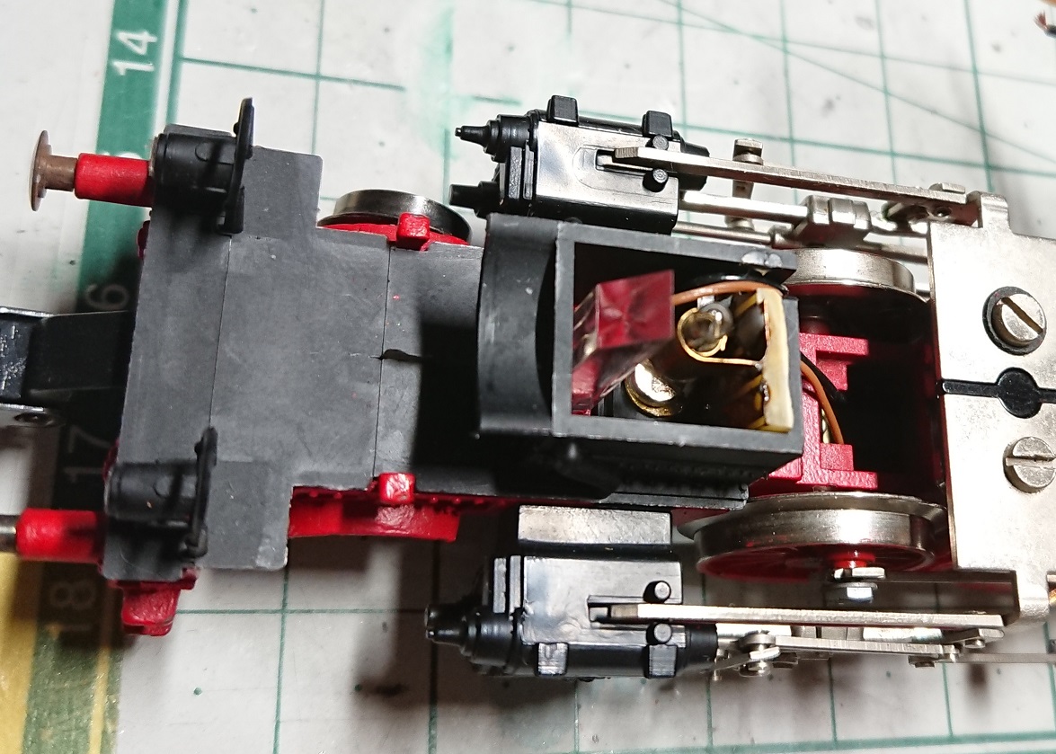 Так как тут постоянная сцепка тендера с паровозом, то пружинку ставить не обязательно - вся эта сплотка на прямом участке выровняется сама собой. Хотя можно было и пружины пристроить - лишними они не будут.