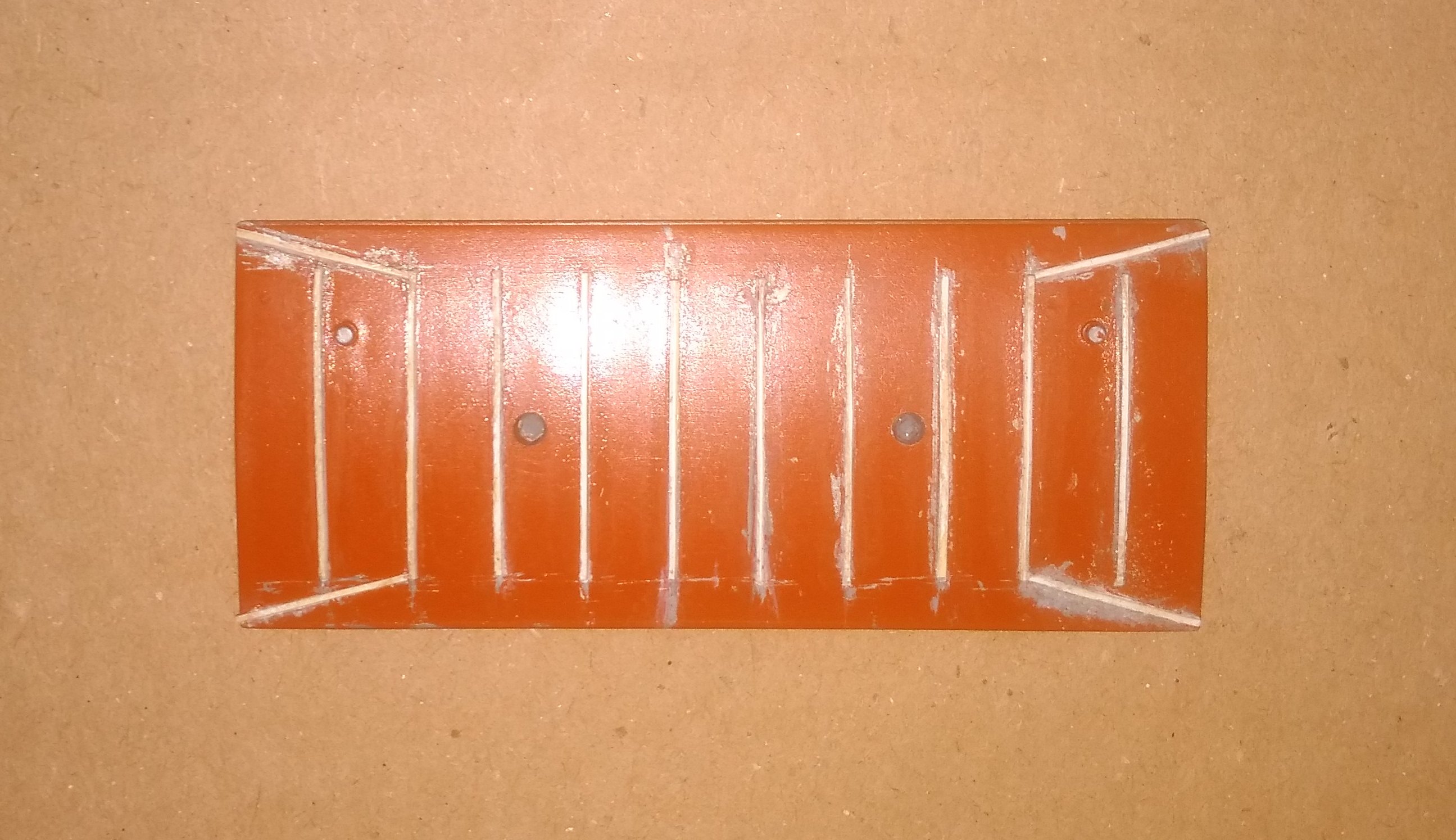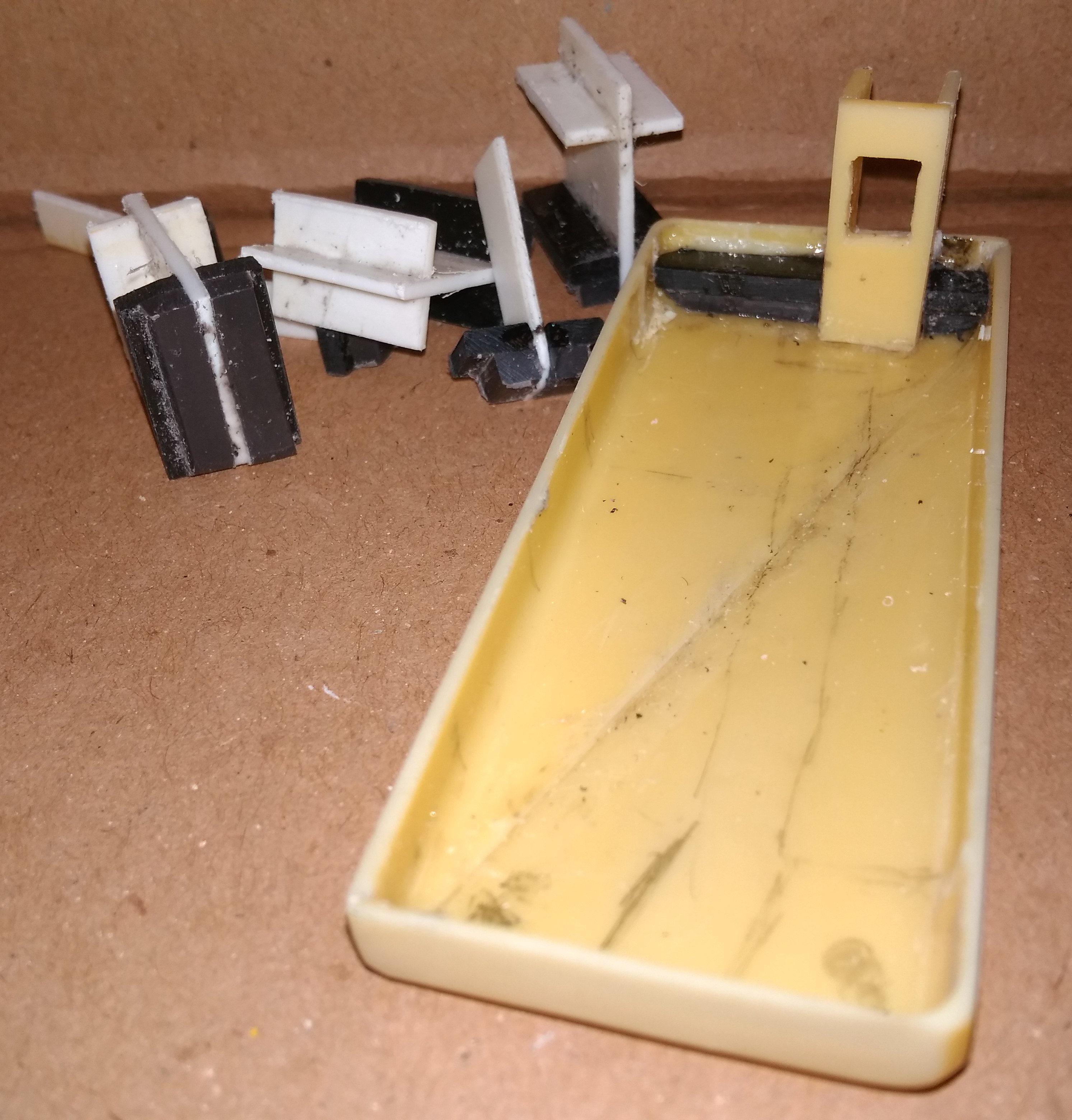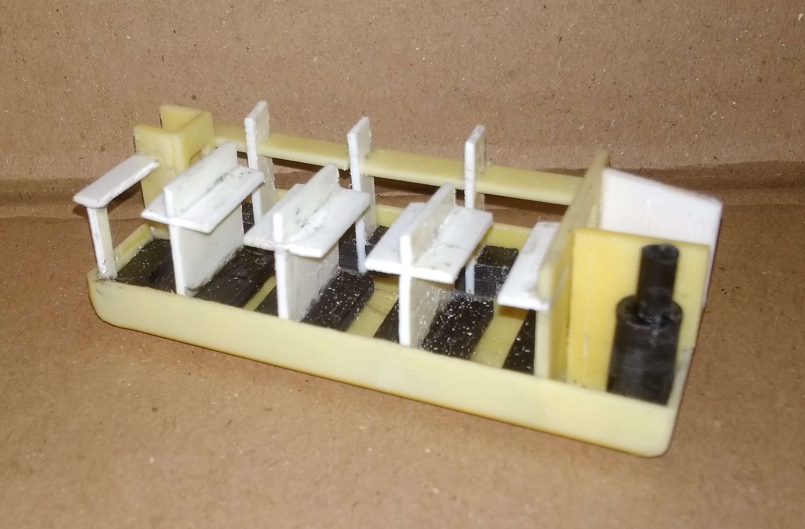 Использовал пластик от советских микросхем - самых больших микросхем в мире! Микросборки ТТЛ-логики, как объясняли аксакалы. Понабирал, когда чистили кладовку от устаревшей аппаратуры. Пластик толщиной от 1 до 1,3мм. Цвета встречаются разные (голубой, желтый, красный, розовый), но в основном белый или "слоновая кость". Последний довольно хрупкий, колется при откусывании. Другие спокойно режутся ножницами. Из двух обрезанных половинок склеил "ванну" для интерьера, в которую и будут вклеиваться все детали. Тут показана уже с вклееным тамбуром. Из этого пластика и решеток вентиляции от телевизоров делаются лавки с полками.