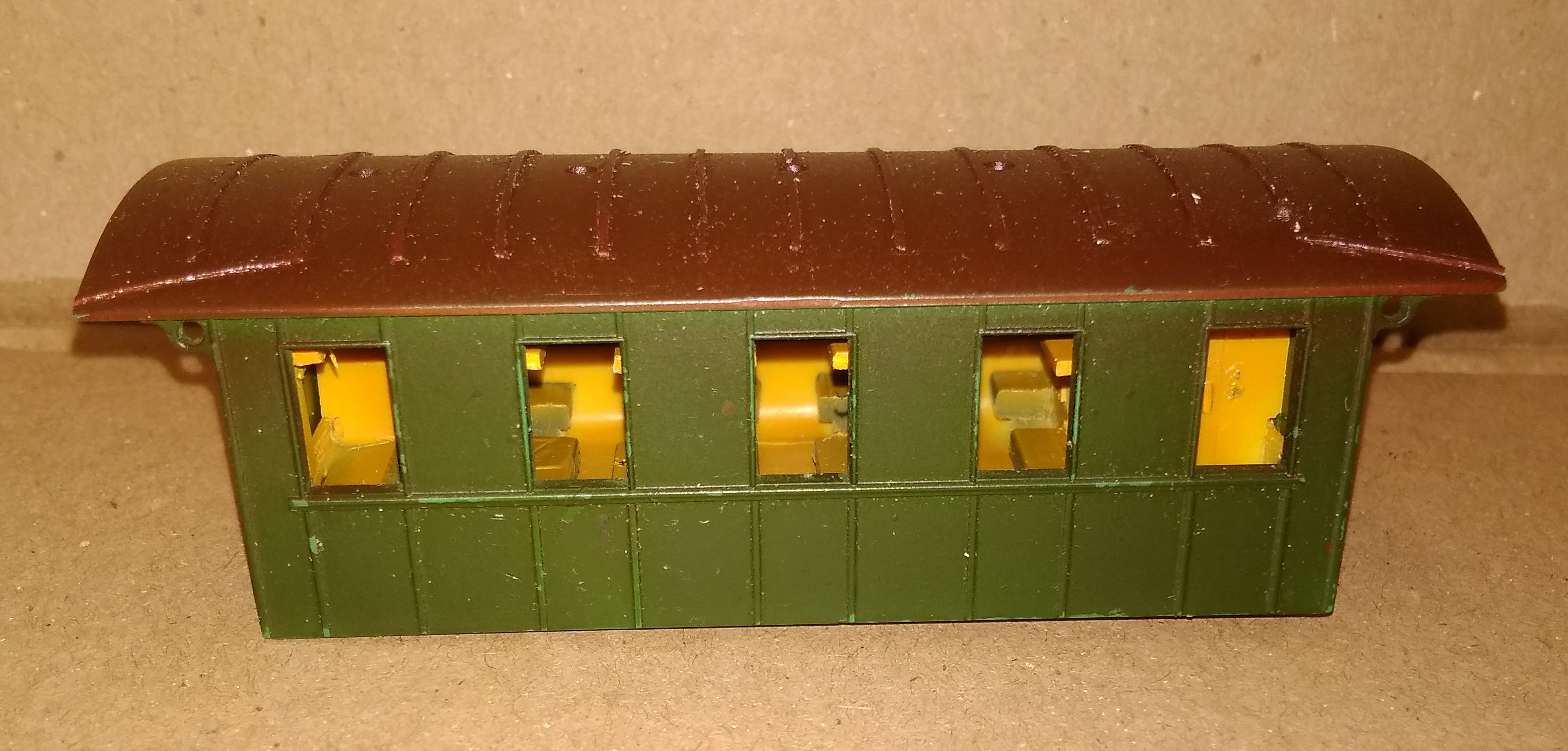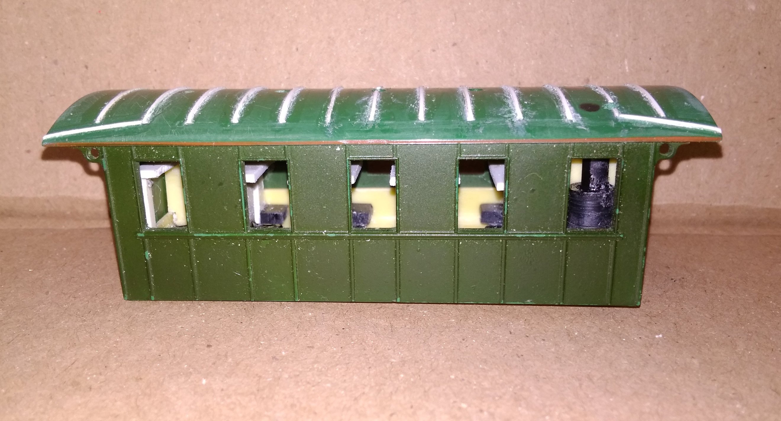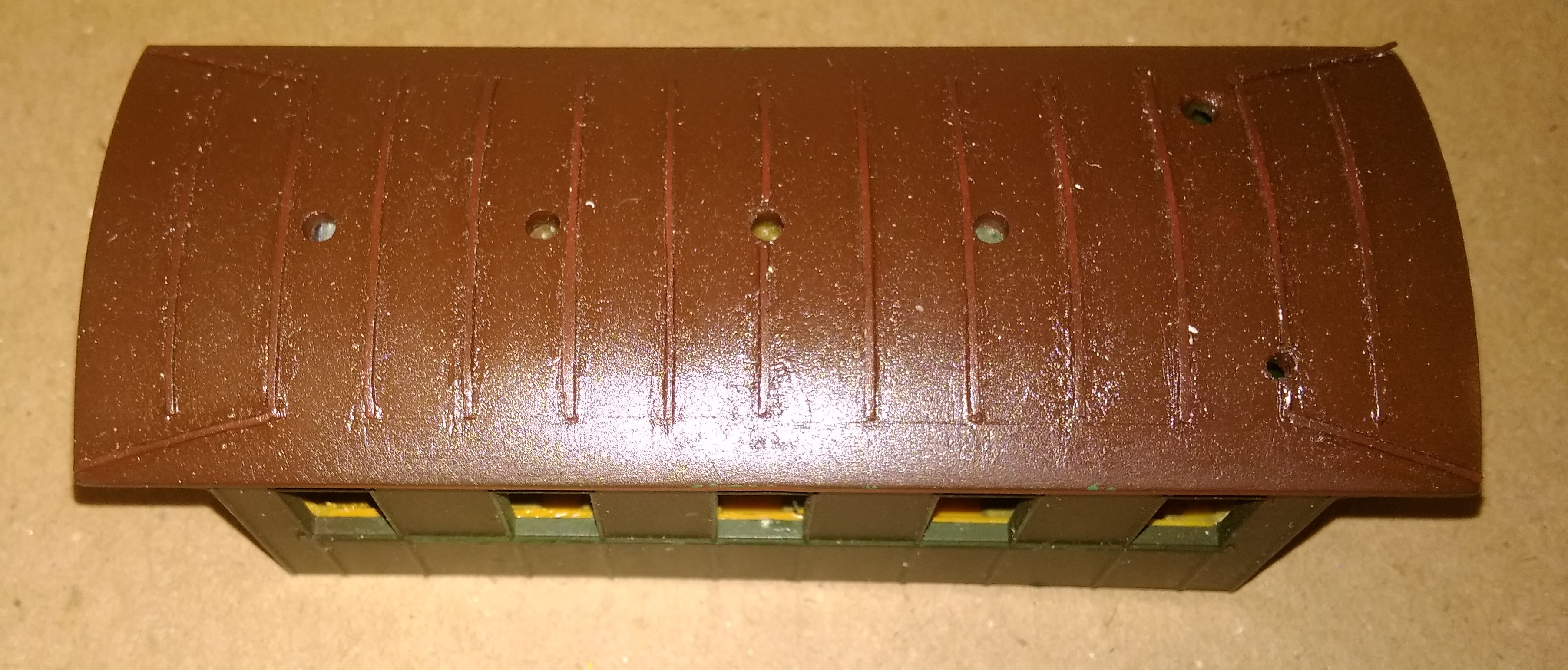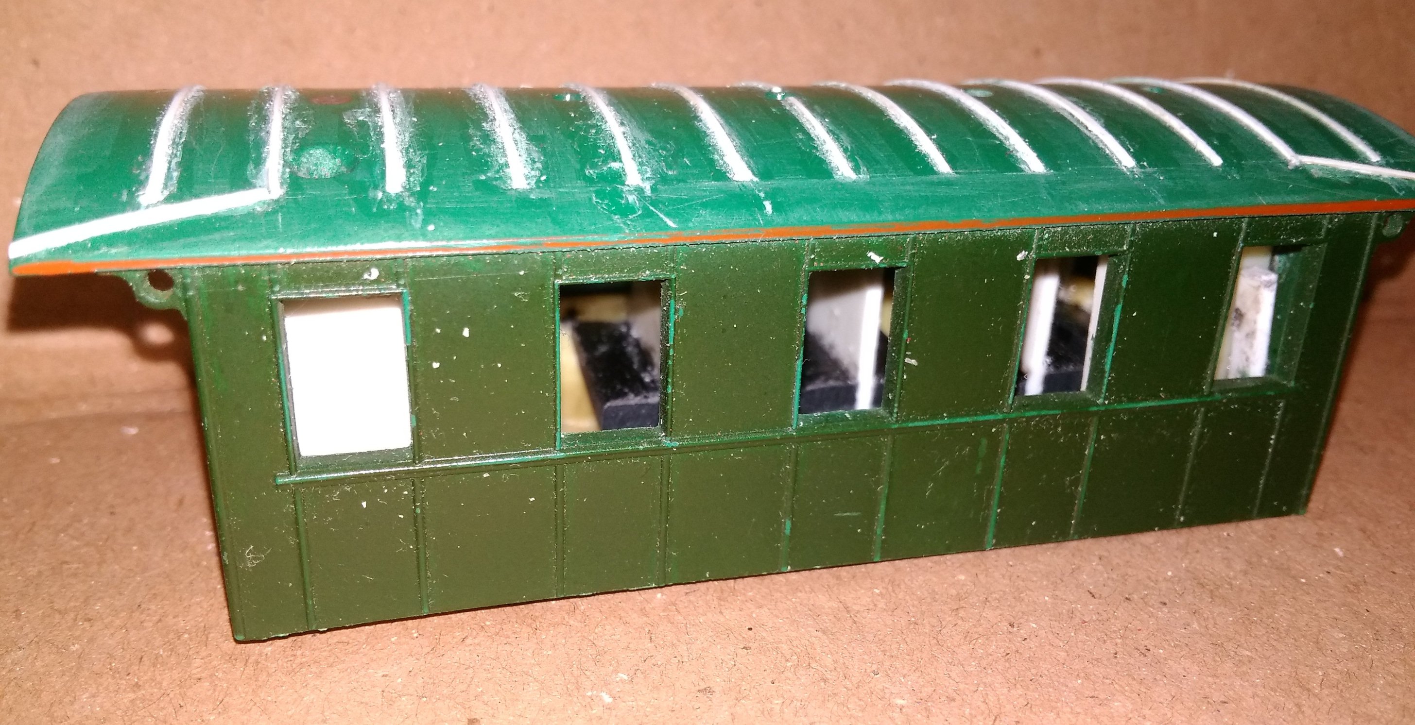 Собрал по временной схеме покраску. Решил. что крыша должна быть потемнее, чем раньше. Заодно задул интерьер тёмно-желтой краской. Вроде неплохо получилось. Думаю, стенки вагона покрасить более яркой краской, не такой темо-зеленой.