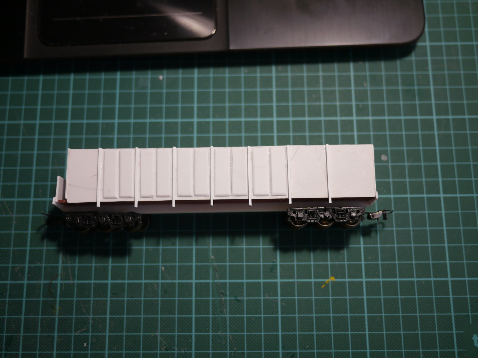 На "хребет" посажена обточенная дремелем и распиленная американская гондола (торцевые "двери", коричневые на фото, как раз от нее). Поверх этого наклеены борта, буферный брус и т.п.