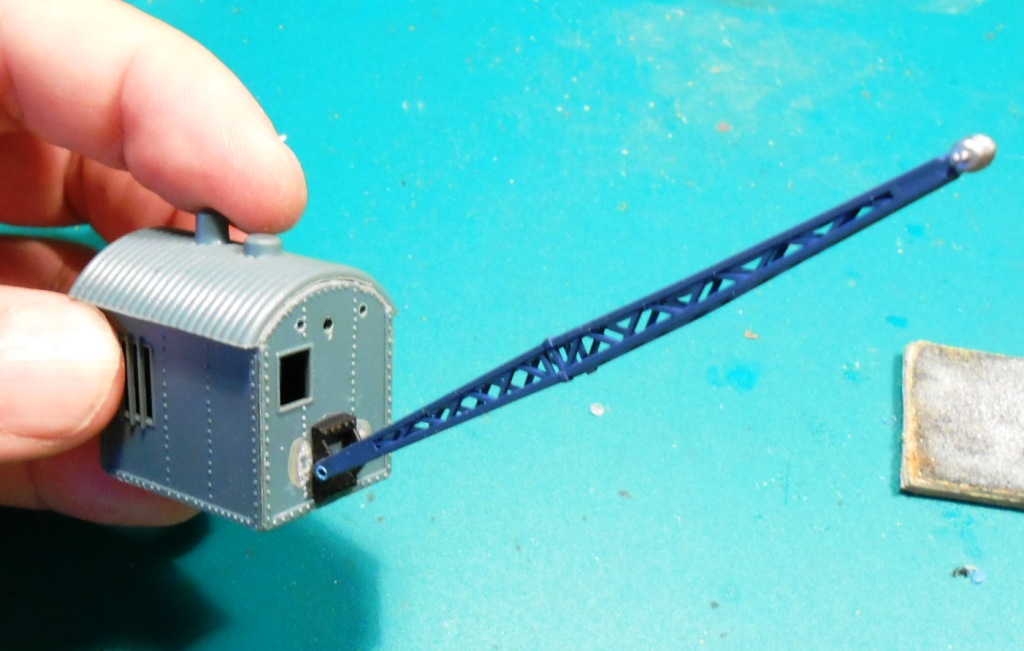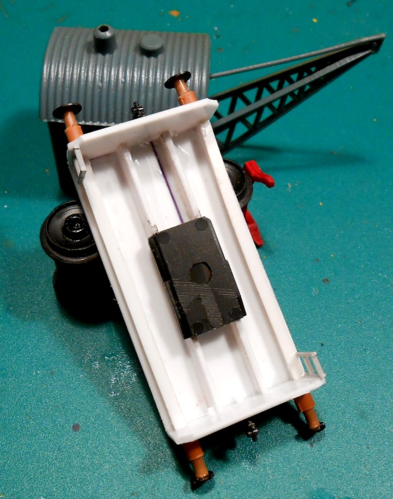 На тележку поставил колеса и выпилил раму крана из полистирола.