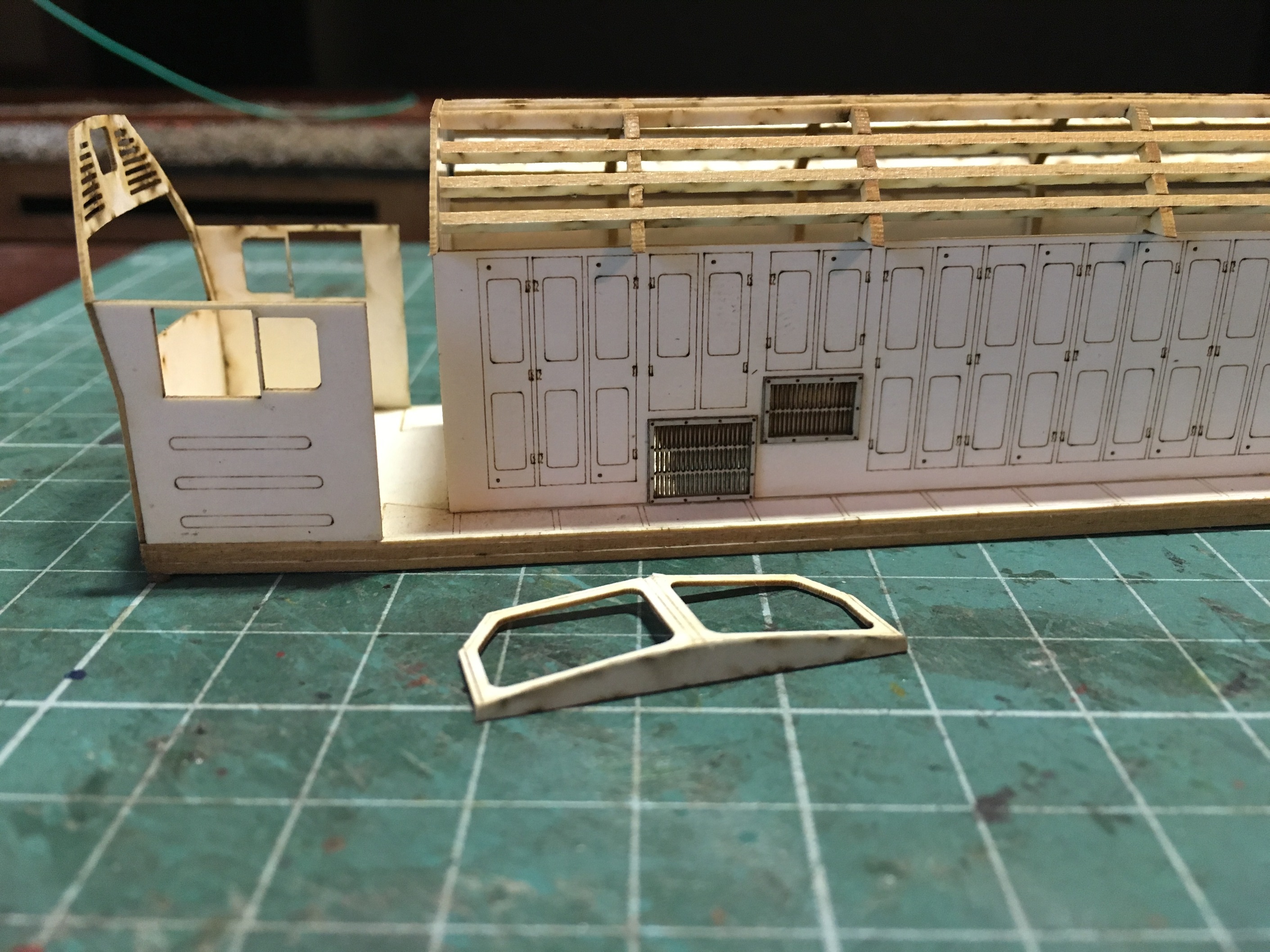 Теперь по проделанной работе. На раму не обращайте внимание. Если всё ок, зашкурю и зашью боковыми накладками. Бутерброда не будет видно. Не просто с кабиной. Лобовой лист не плоский, а радиусный. Лобовые стёкла идут под углом вперёд и стенка выше стёкол так же радиусная и под углом. Далее, тёмный момент с нишами за кабиной. С обеих бортов, там угловые ниши и по одной дверце. И момент с окончанием капота, где жалюзи. Что рама, что стенки капота, сужаются под углом 1,5-3 градуса. Крышу решил выводит по внутреннему каркасу. И прочнее, и легче собирать потом. В начале капота и перед сужением, поставил глухие переборки. Это убрало любую косину и гуляние стенок кузова. Поработал с решёткам и жалюзи вентиляции. Не делал бы сейчас, но там надо закрывать капот крышей в районе жалюзи и потом, снизу кузова, этим неудобно будет заниматься. С обоих бортов, пара жалюзи будет приоткрыта, пара закрыта. Вроде ничего не упустил в рассказе. Ну и очень будет нужна критика и советы. Собственно, модель по очень плохим мотивам. Чертежей и прочего нет в принципе. Но постарался просчитать все двери на бортах капота, разметку под ручки, размещение жалюзи, старался максимально соблюсти, как в оригинале.