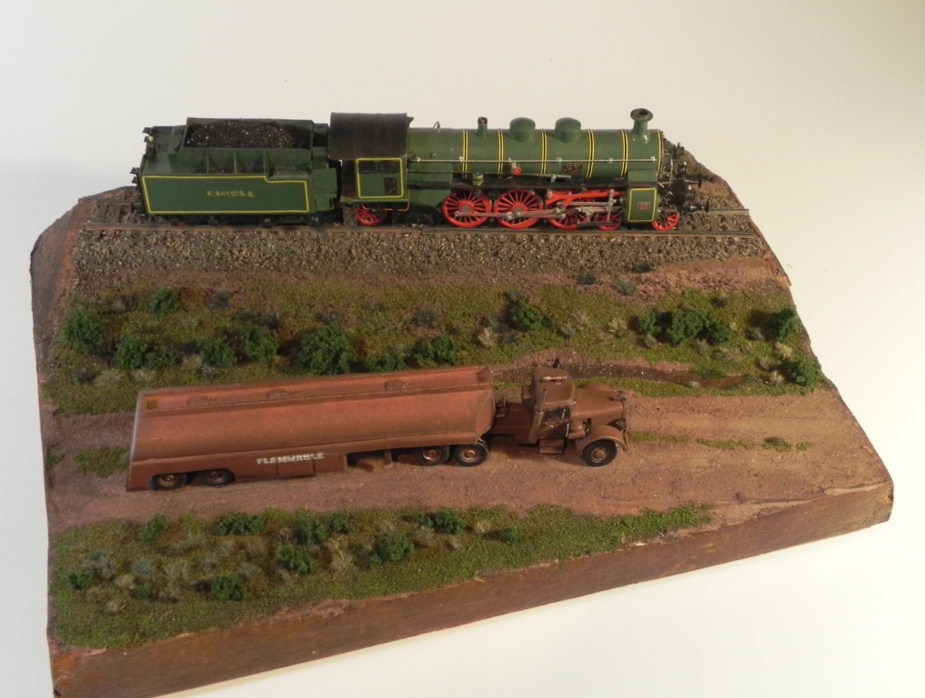 В роли грузовика-убийцы - Peterbilt 281. Жертва - паровоз Bavarian S3/6. Автономера на бампере грузовика сняты с его «жертв». Модели построены со сканов бумажных издательств, уменьшенных до 87 масштаба. Материал: картон, ватман, офиска, медная проволока. Практически все детали переделаны по два-три раза. Кое-что получилось переразмеренным (например, фары, надписи, пр.), но это от несовершенства моих технологий. Окрашено: нитроэмаль, акрил, цапон-лак.