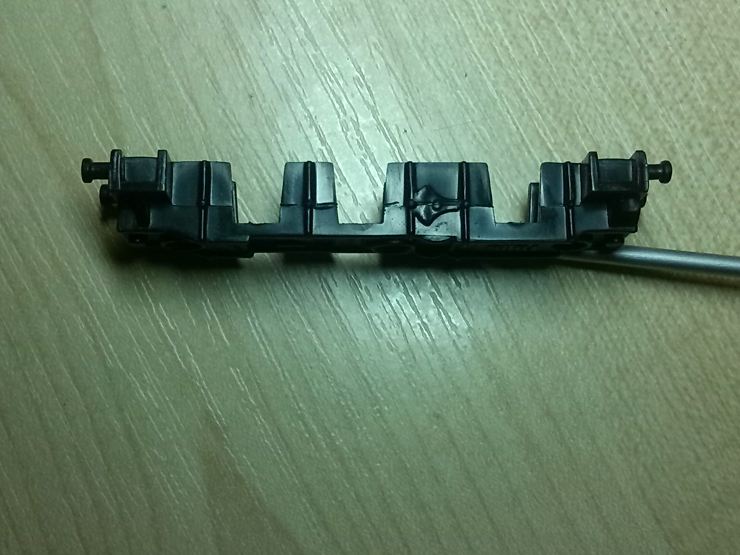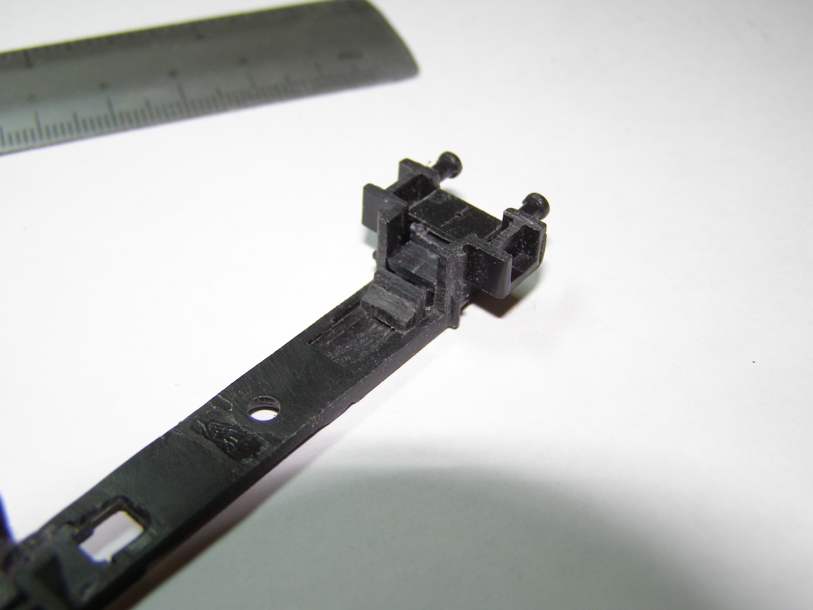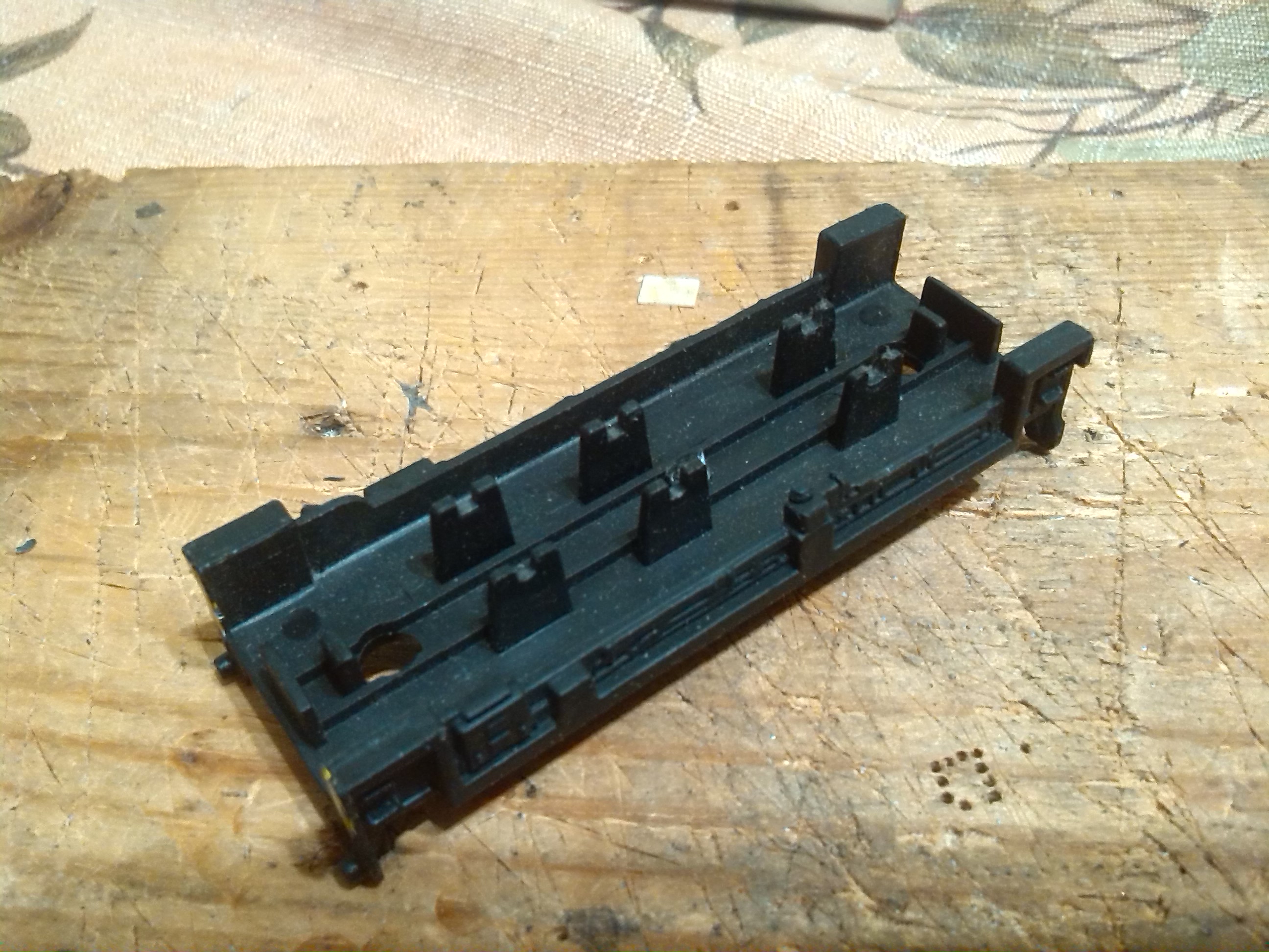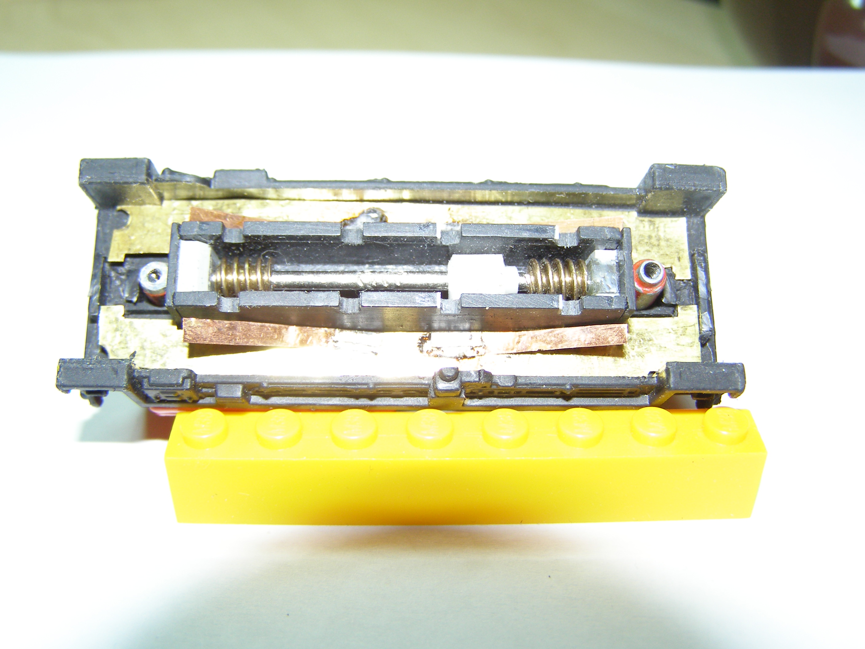 Из-за того, что рама локомотива сделана из поливинилхлорида, который дихлорэтаном ничем не клеется, пришлось в ней вырезать отверстие для установки тележки, на которой будет крепиться двигатель, редуктор, привод на колеса, контакты. Еще одна причина - сохранить текстуры рамы.