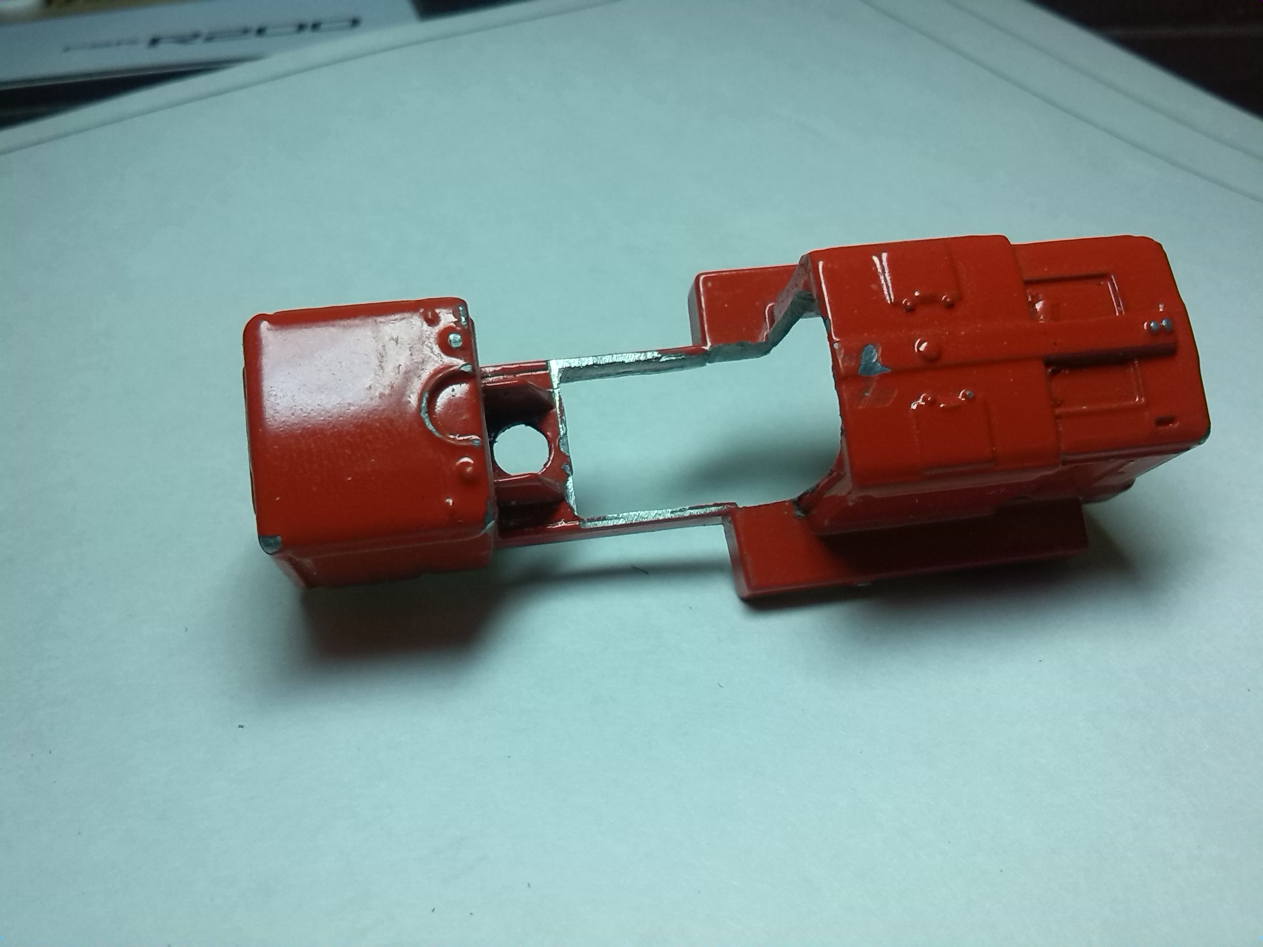 Кабина была прикручена к корпусу двумя шурупчиками снизу. На 3 фото видно отверстие для крепления кабины, второе - с правой стороны вместе со стенкой правой части корпуса уже выпилены. Это нужно для установки внутри корпуса мотора.