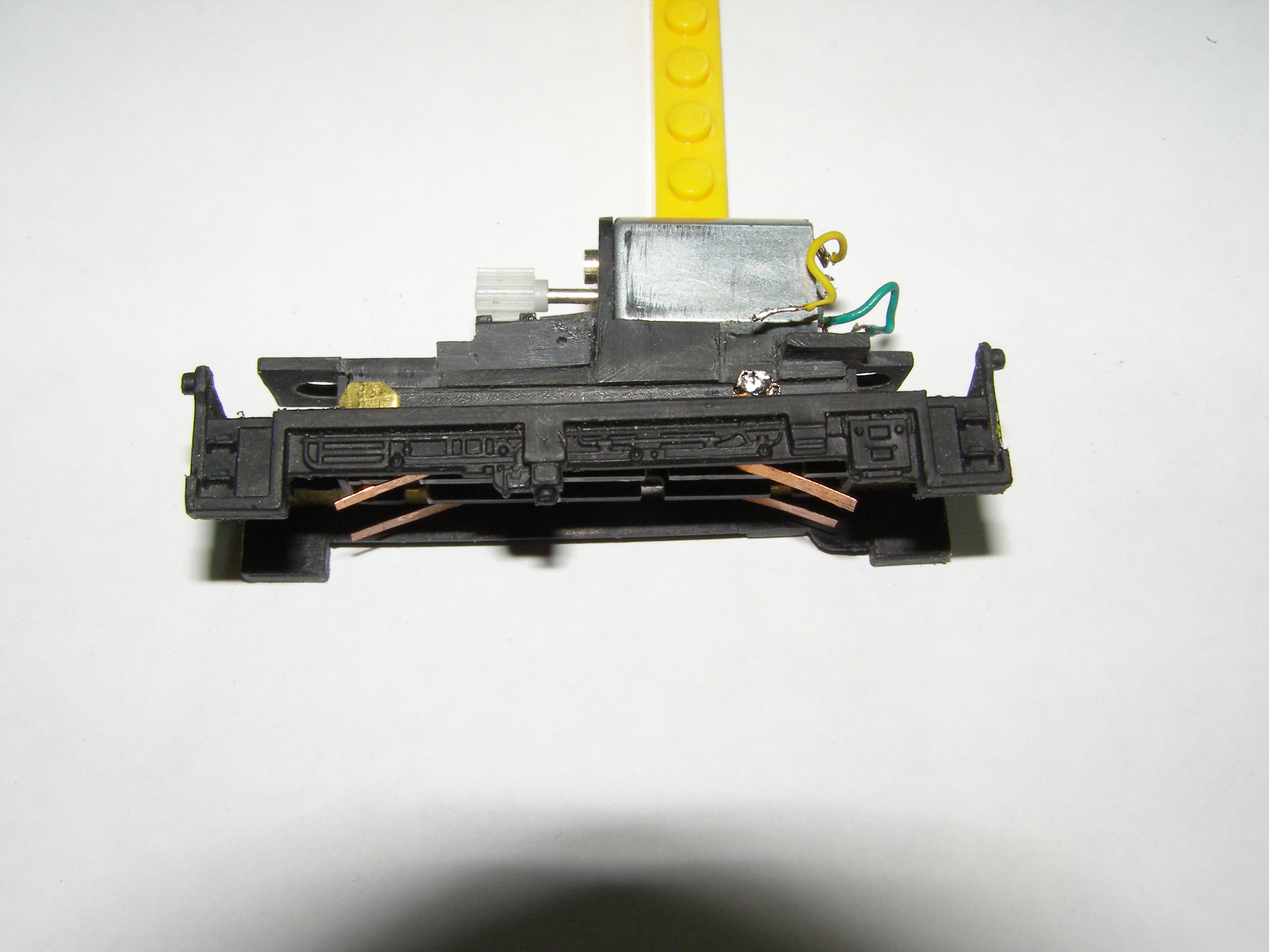 Закрепляем контактные платины на тележке, загнув широкие концы и припаиваем провода от мотора