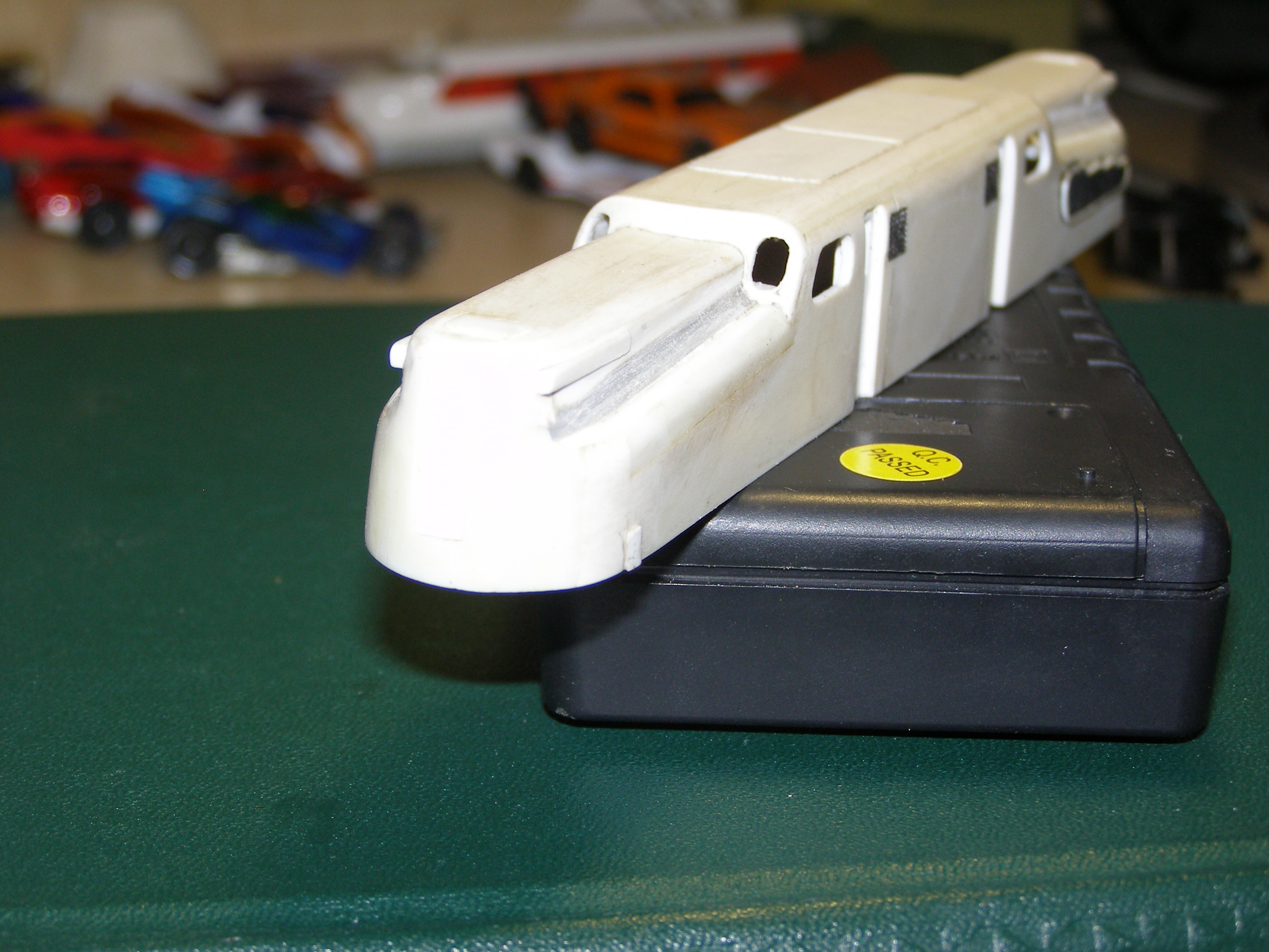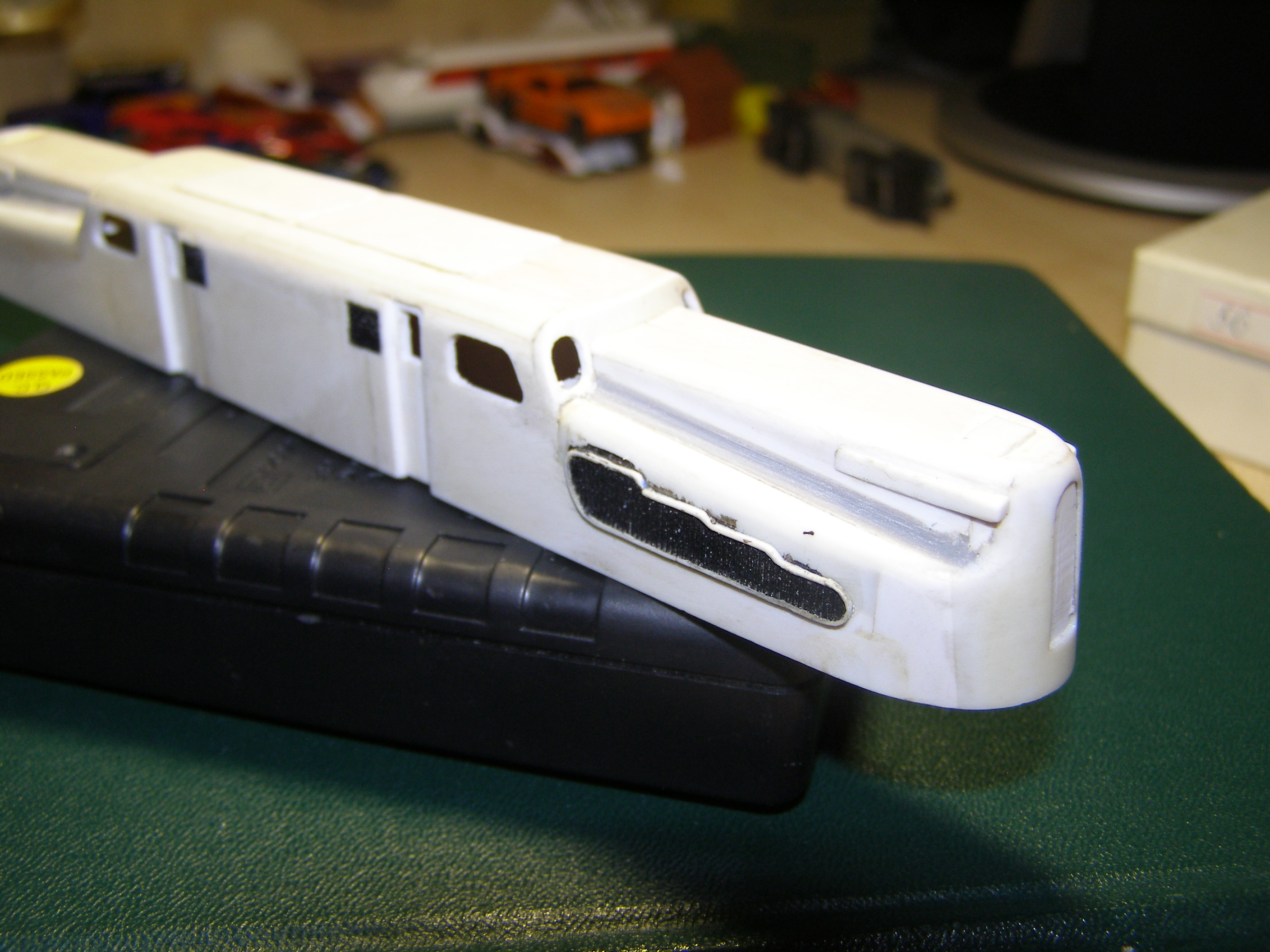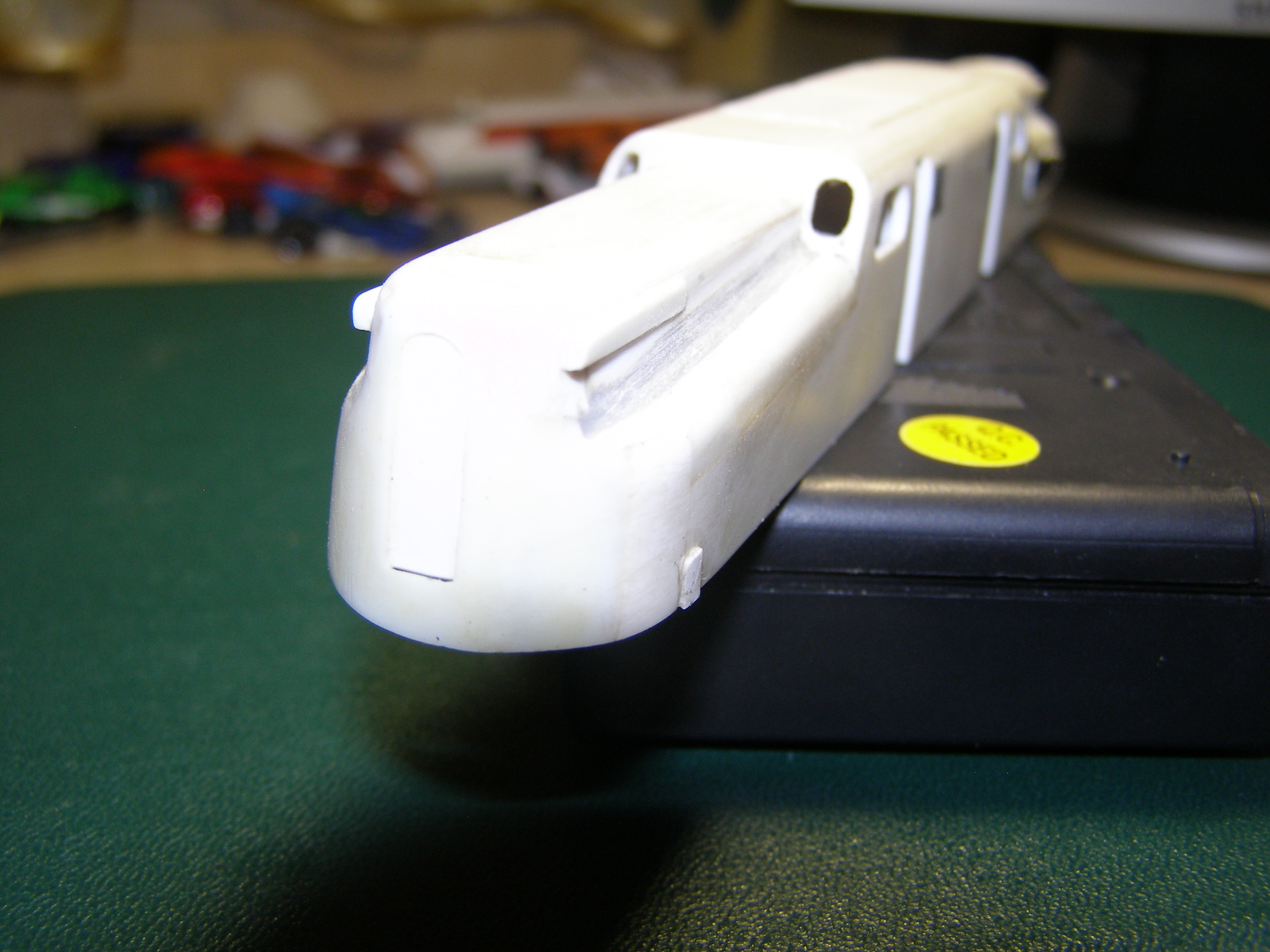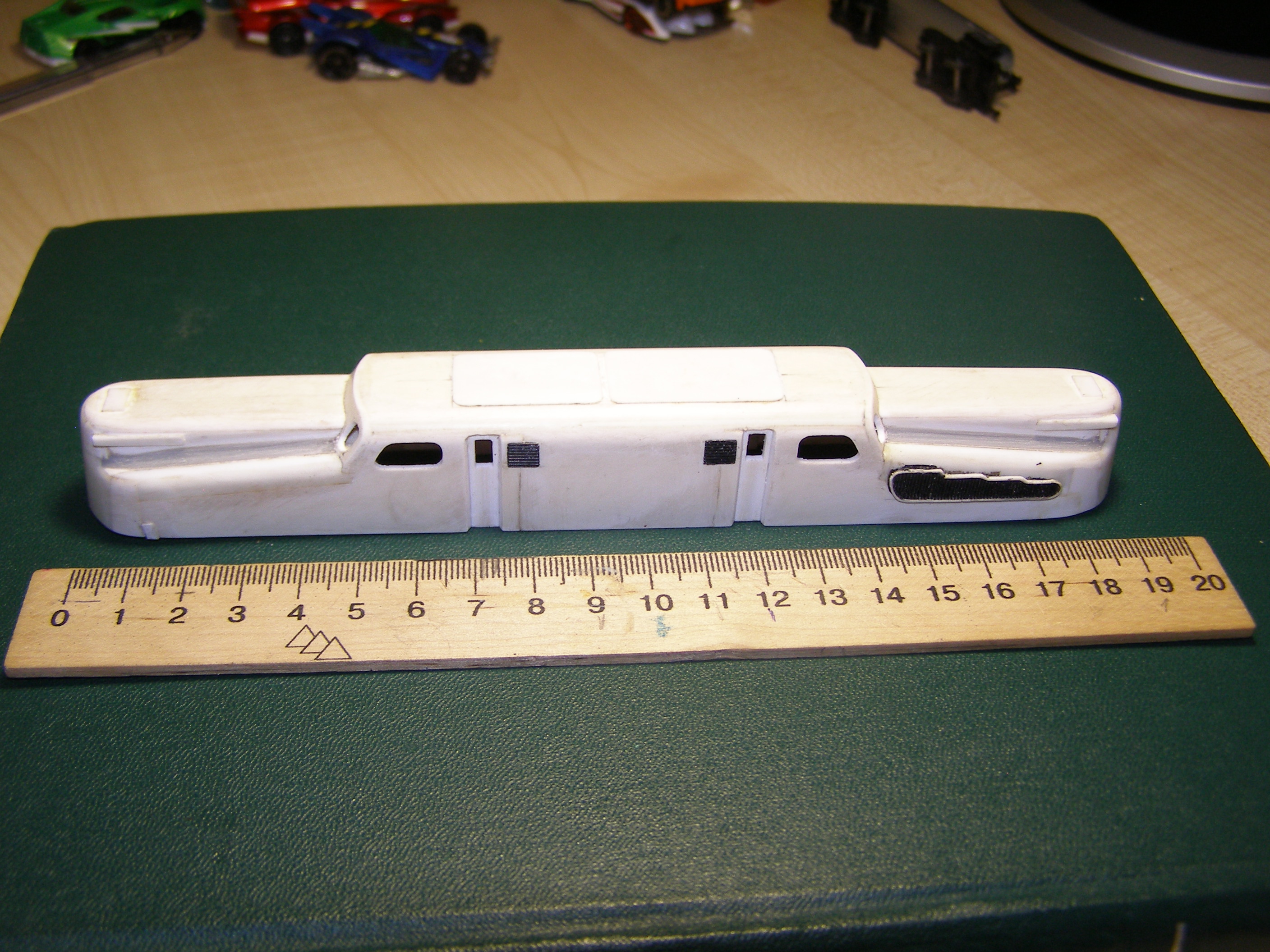 Корпус делал изполистирола. С ним особых затруднений не возникло. Корпус разбил на три части: основная - это бока и крыша и 2 части, назовем их капотами, где расположены пантографы. Вырезал соответствующие детали и склеил отдельно эти части. Детали клеил под прямым углом, в результате в профиль они выглядели в виде буквы П. Дополнительно в углы вклеил по всей длине шва полоску полистирола квадратного сечения для того, чтобы при стачивании углов, т.е. придания им округлой формы, детали держались. Потом вклеил лобовые части в основной корпус и приклеил к нему капоты. Торцевые части клеил из полистирола который был уже изогнут (внутренняя часть двери от холодильника - там есть такие изогнутости для полок). После всего обточил напильником и зашкурил. К сожалению сам процесс не снимал. Вот что получилось: