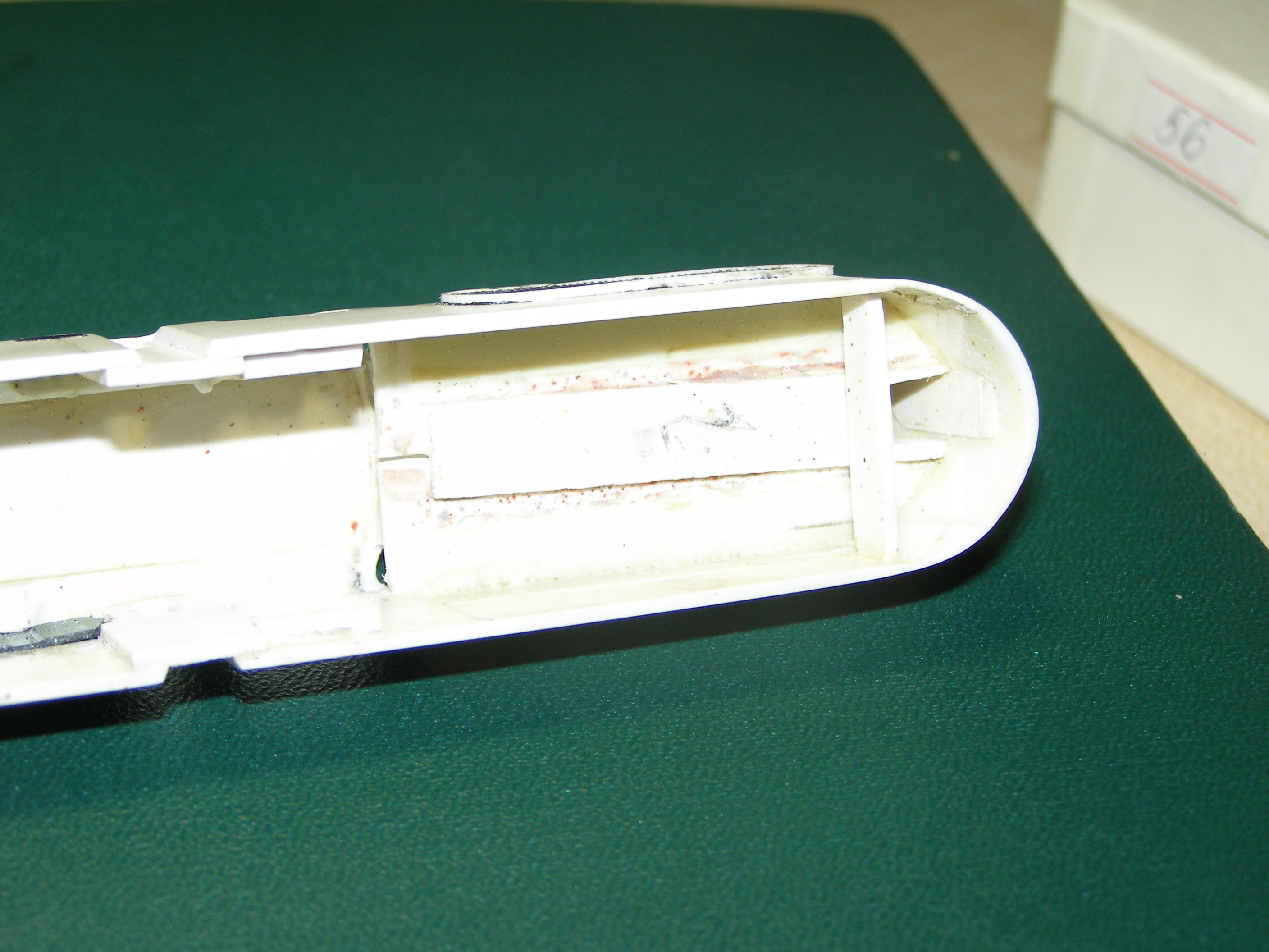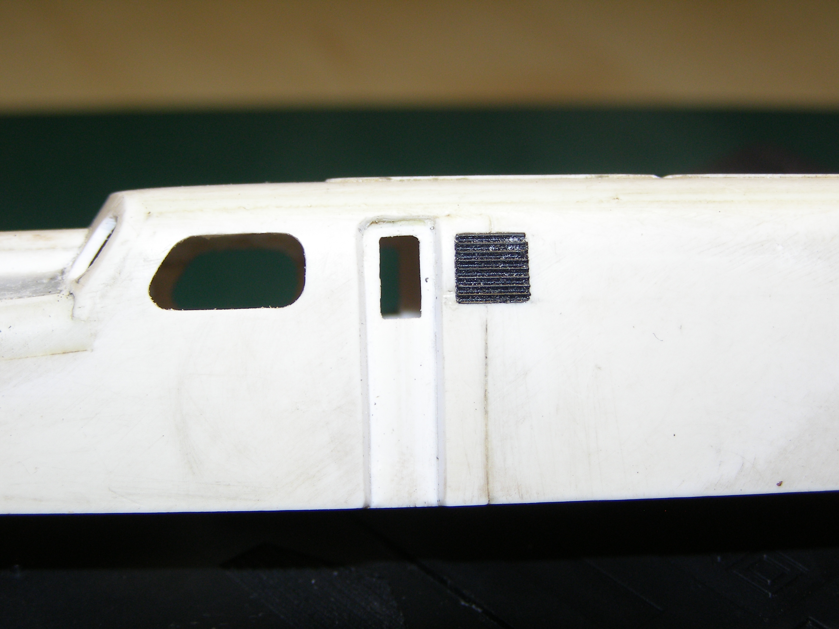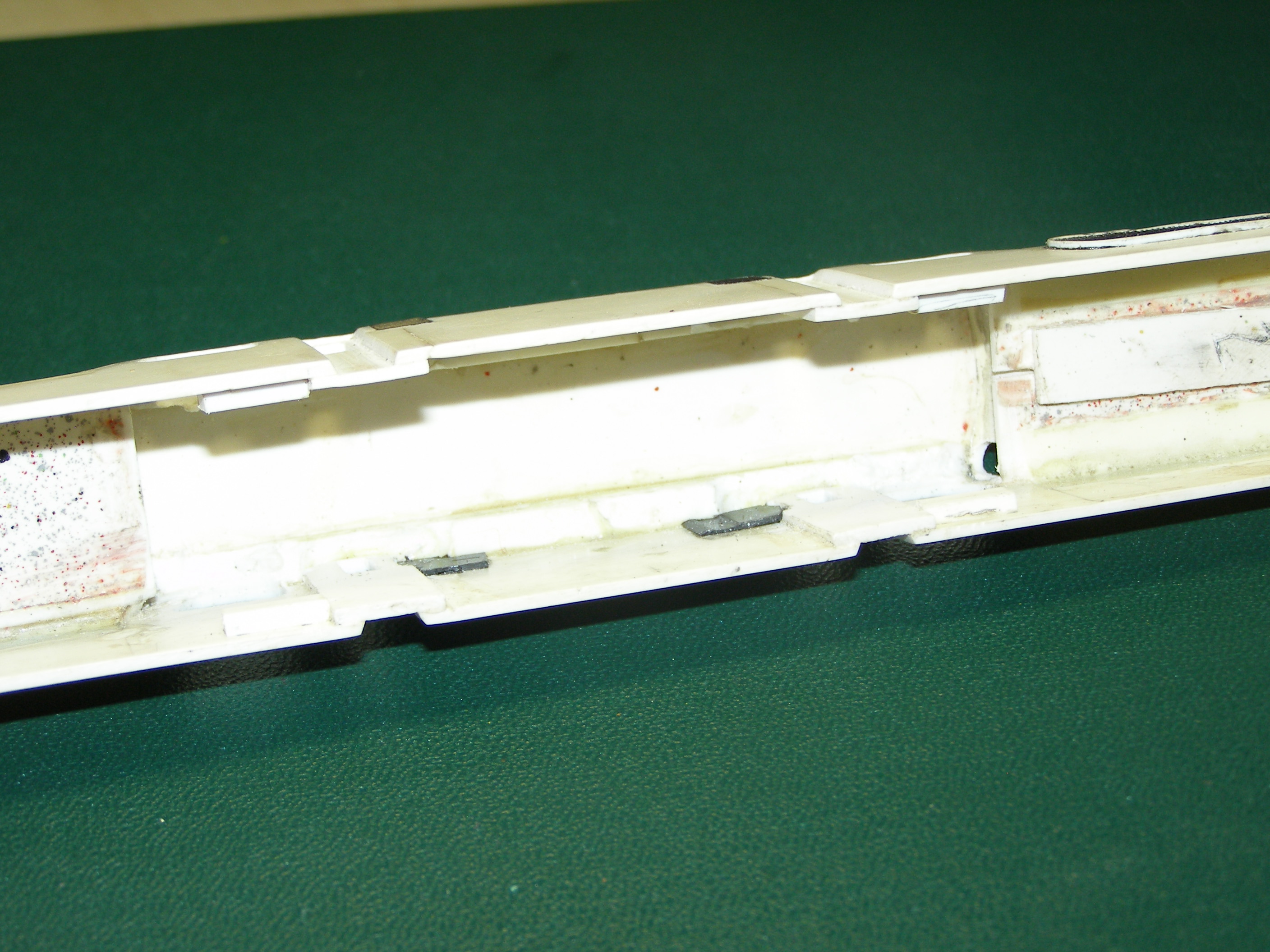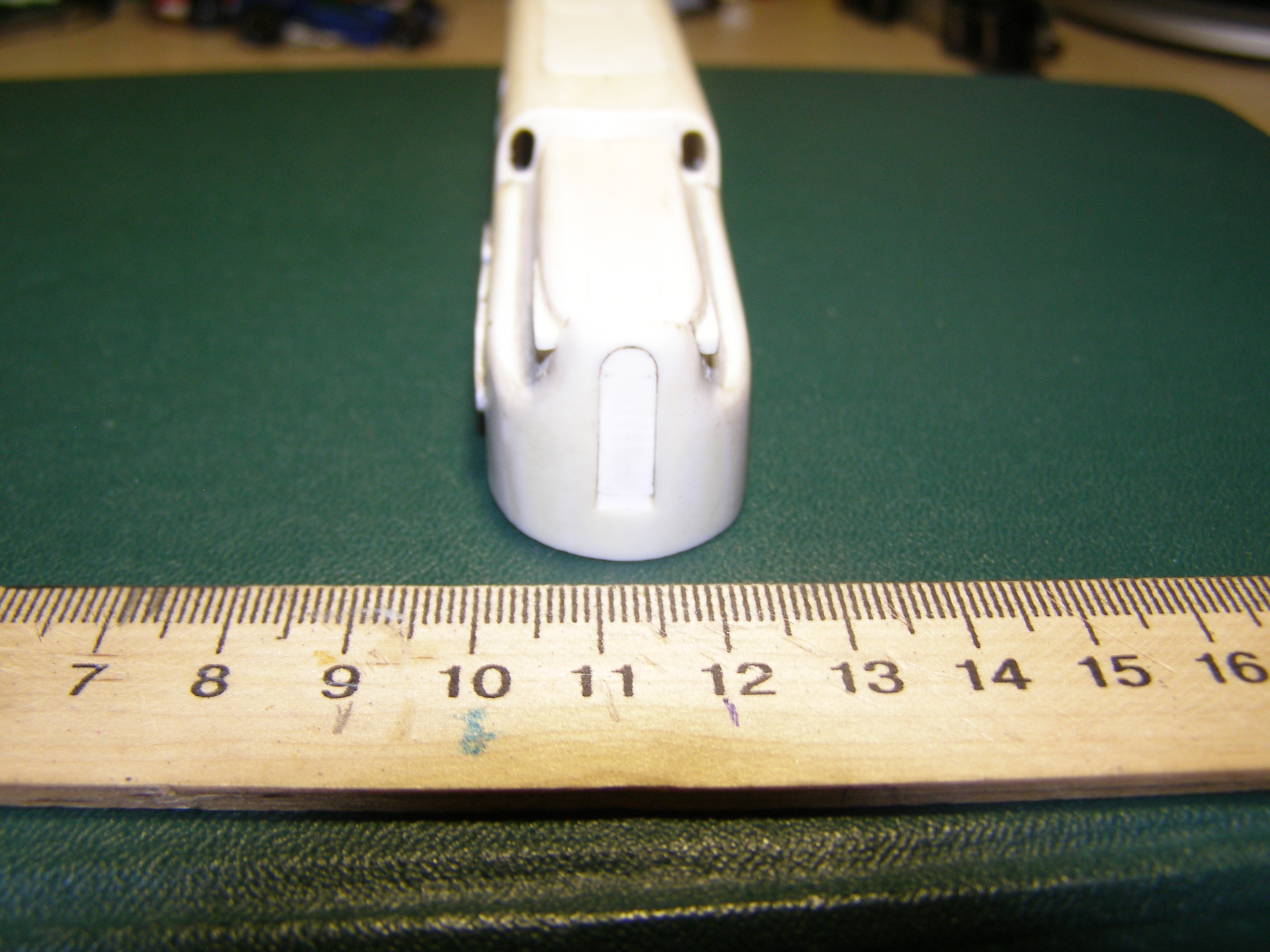 Корпус делал изполистирола. С ним особых затруднений не возникло. Корпус разбил на три части: основная - это бока и крыша и 2 части, назовем их капотами, где расположены пантографы. Вырезал соответствующие детали и склеил отдельно эти части. Детали клеил под прямым углом, в результате в профиль они выглядели в виде буквы П. Дополнительно в углы вклеил по всей длине шва полоску полистирола квадратного сечения для того, чтобы при стачивании углов, т.е. придания им округлой формы, детали держались. Потом вклеил лобовые части в основной корпус и приклеил к нему капоты. Торцевые части клеил из полистирола который был уже изогнут (внутренняя часть двери от холодильника - там есть такие изогнутости для полок). После всего обточил напильником и зашкурил. К сожалению сам процесс не снимал. Вот что получилось: