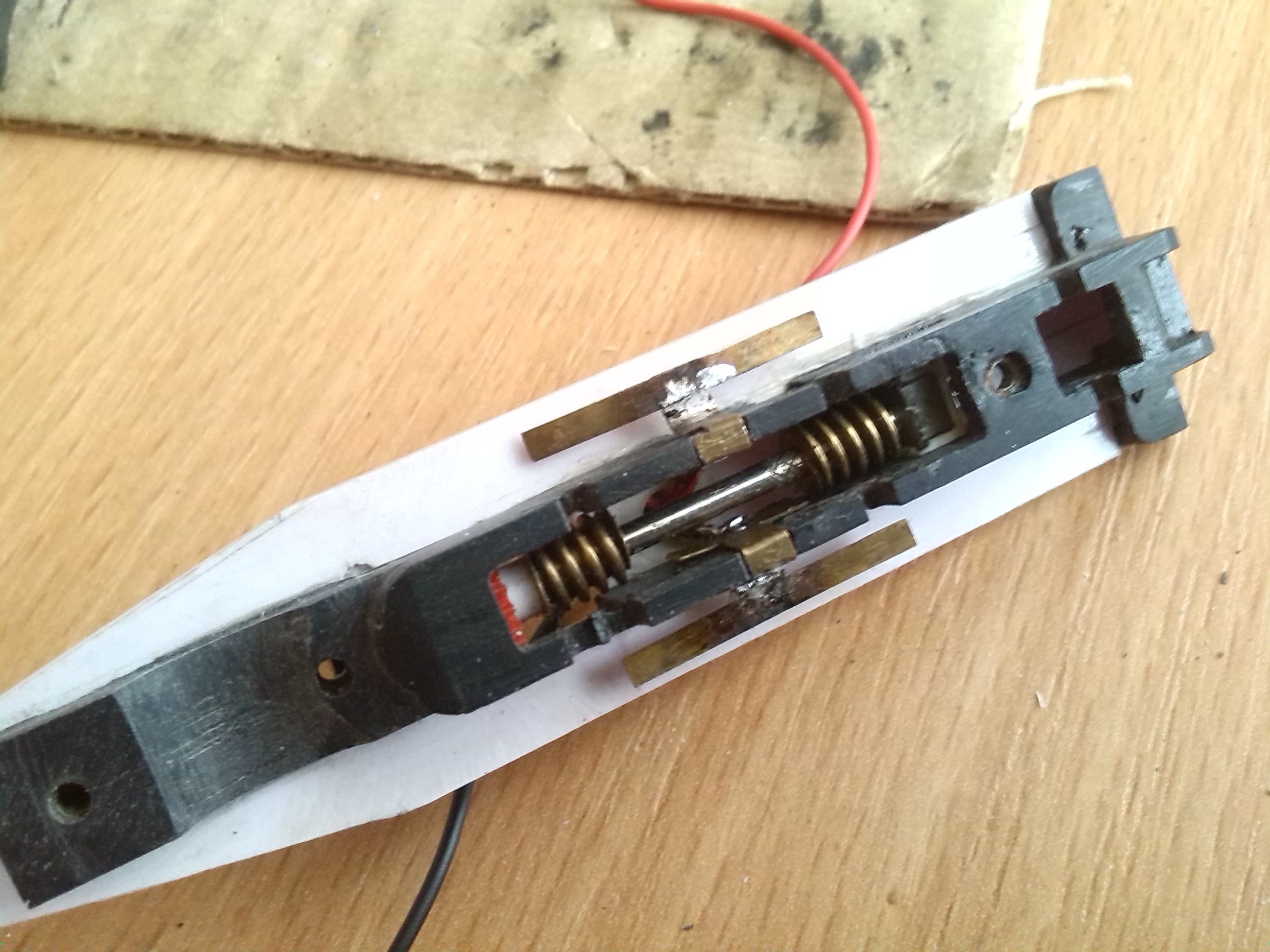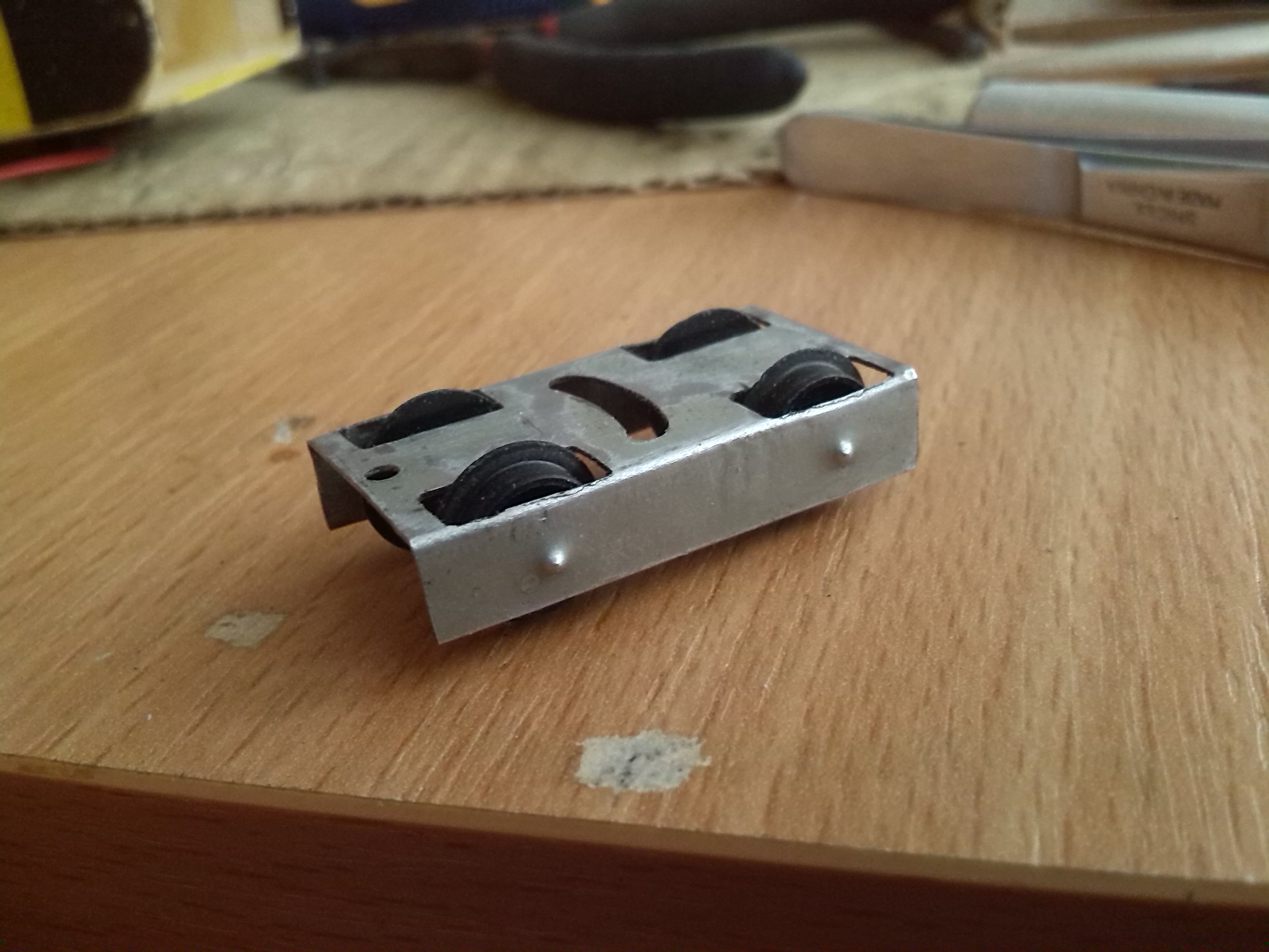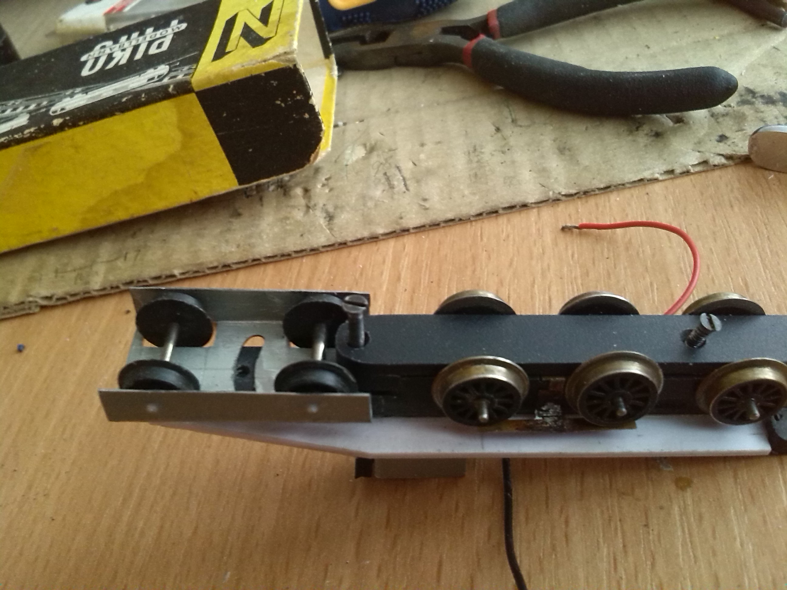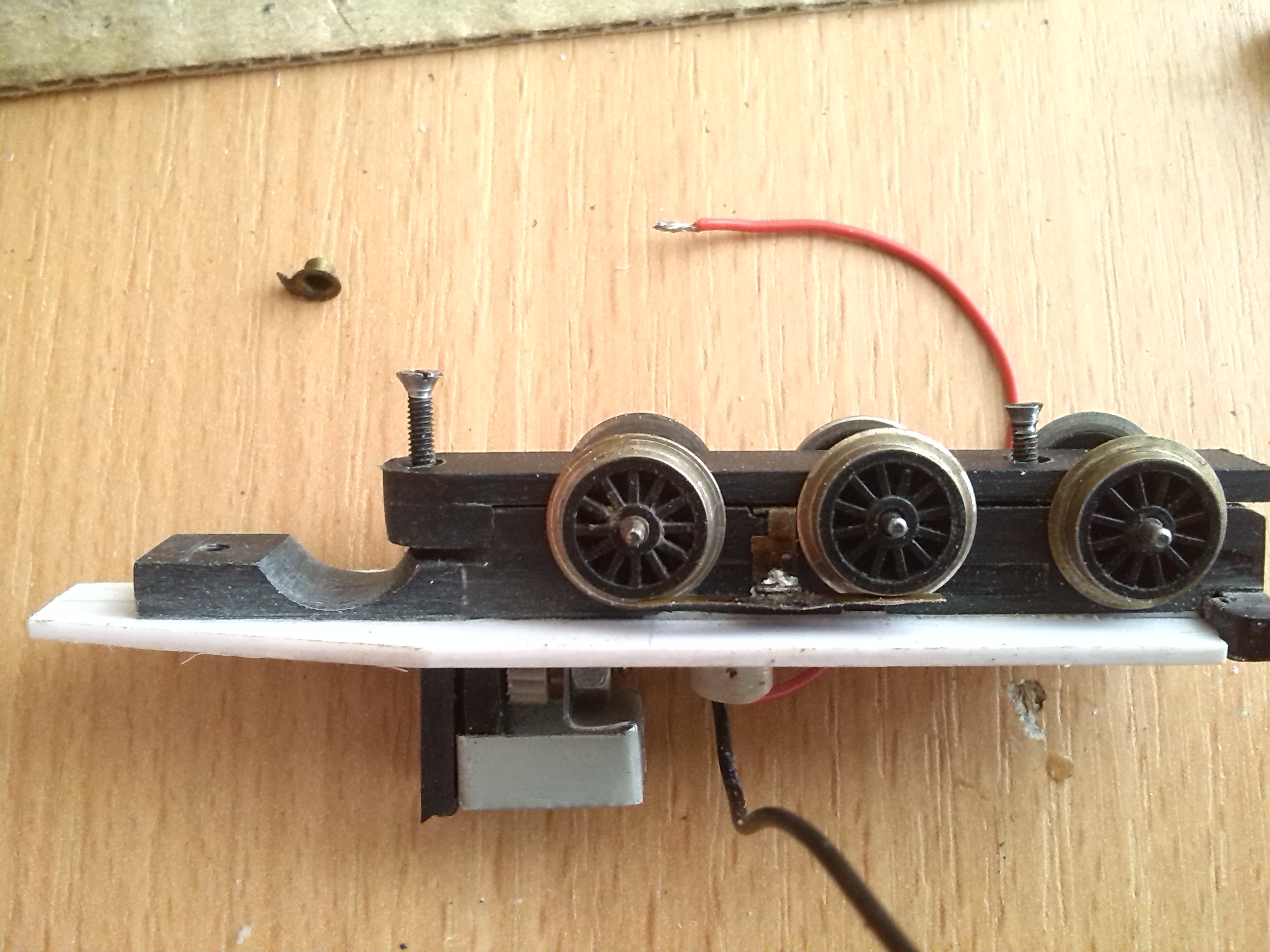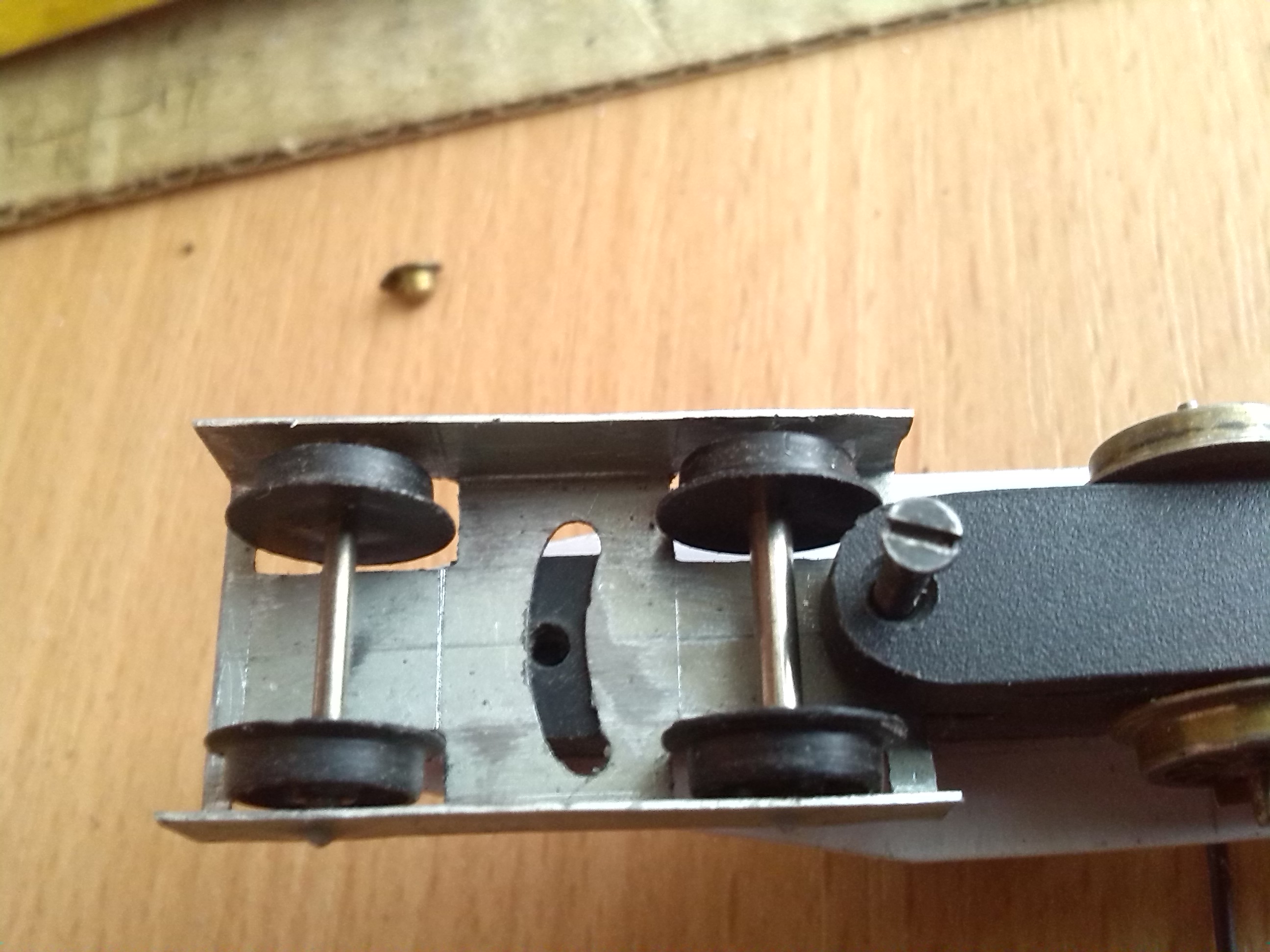 В тележке вырезал пазы для установки контактов и сделал выборку для колес передней двухосной тележки и отверстие под винт, который будет держать эту тележку.