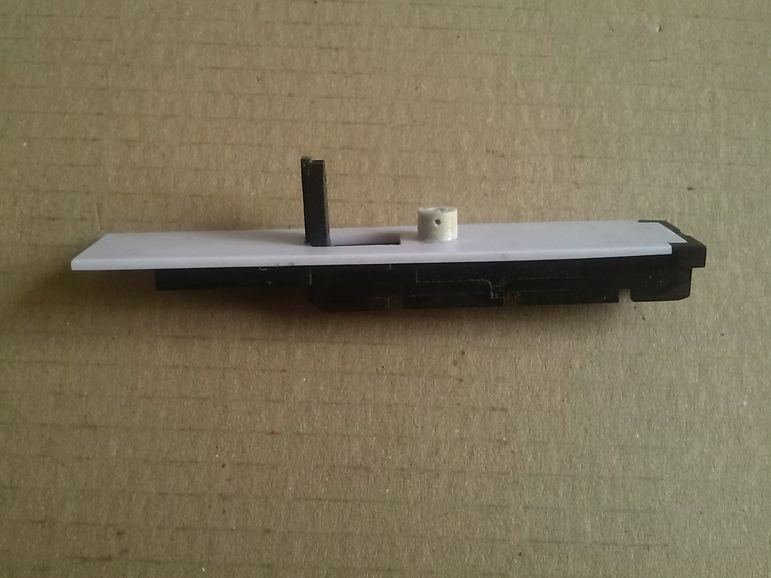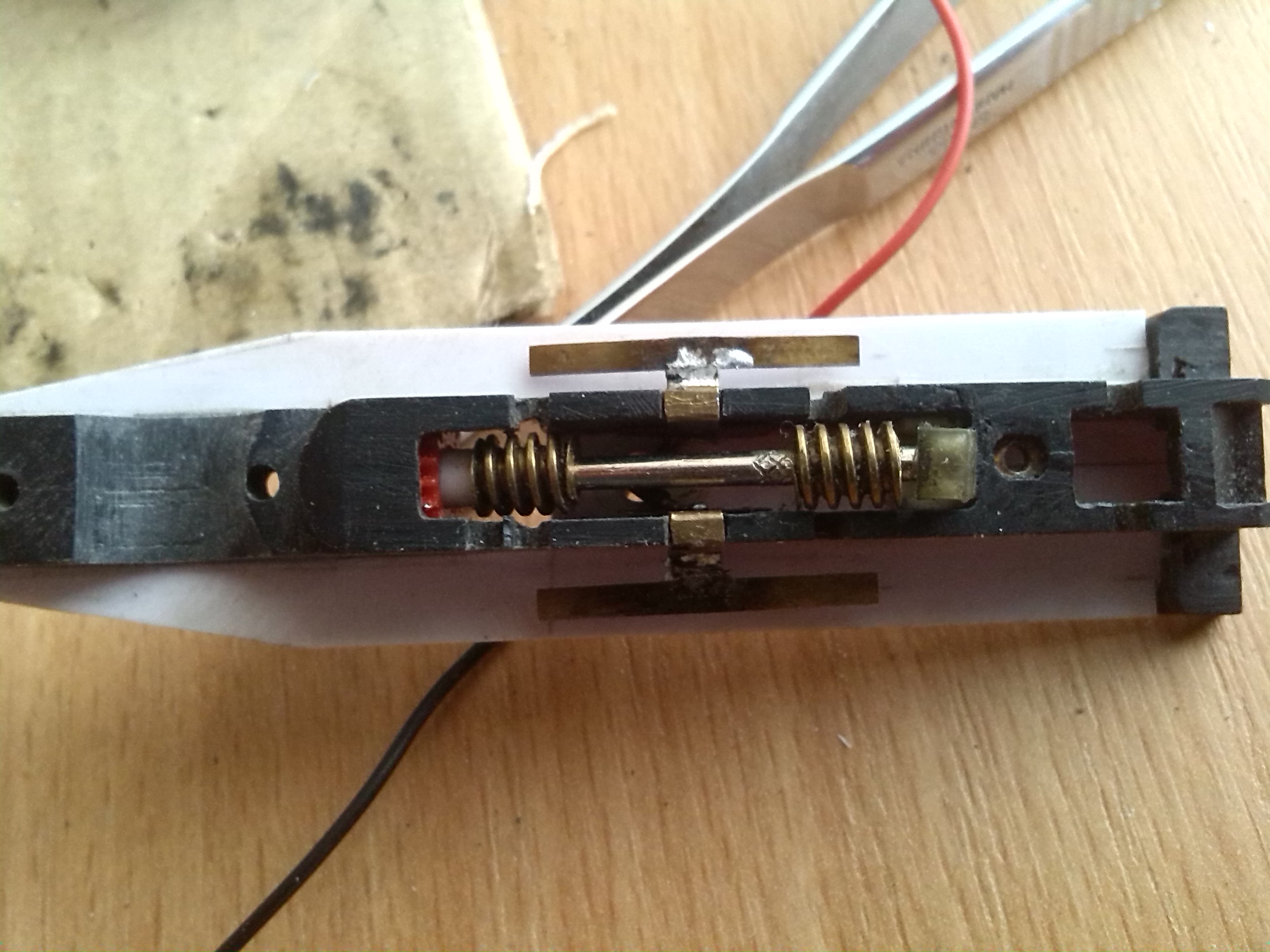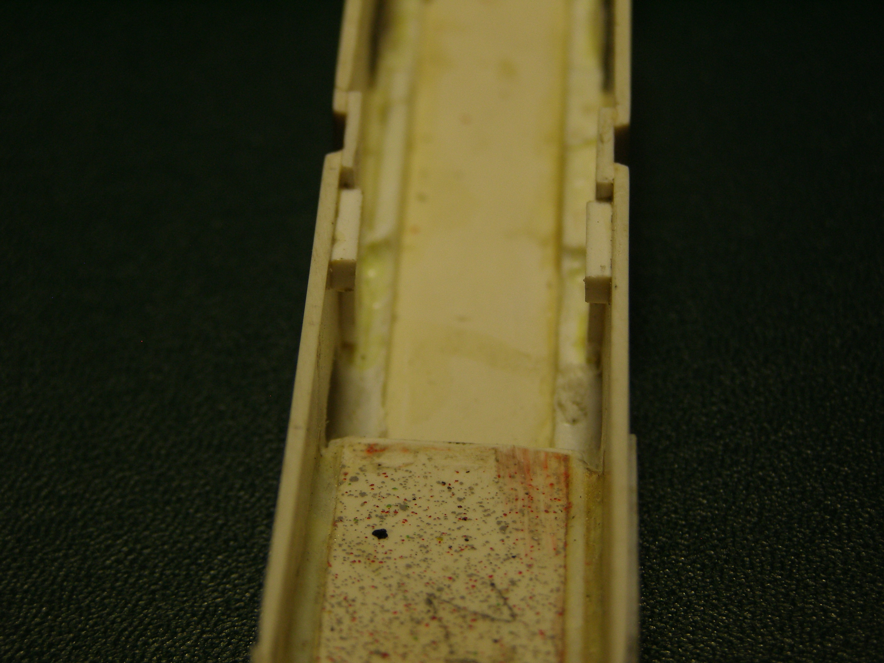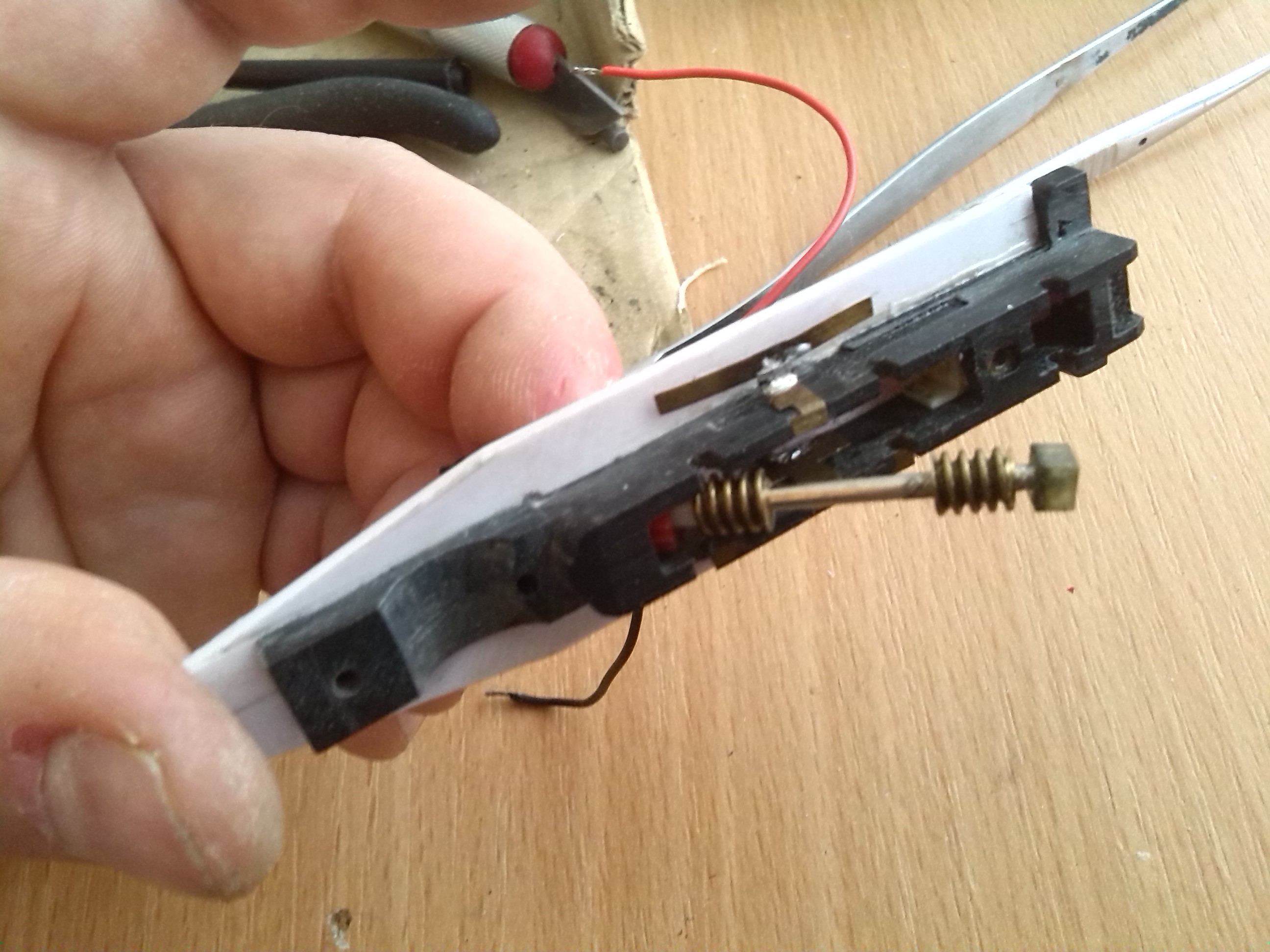 В тележке вырезал пазы для установки контактов и сделал выборку для колес передней двухосной тележки и отверстие под винт, который будет держать эту тележку.
