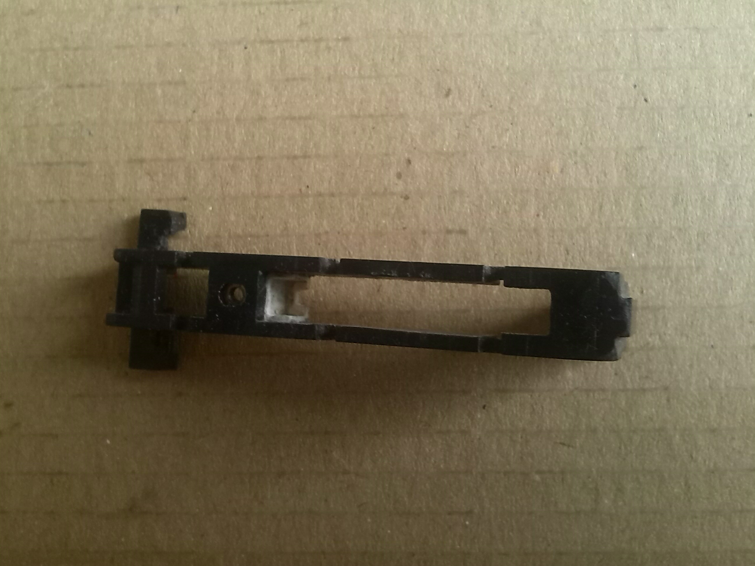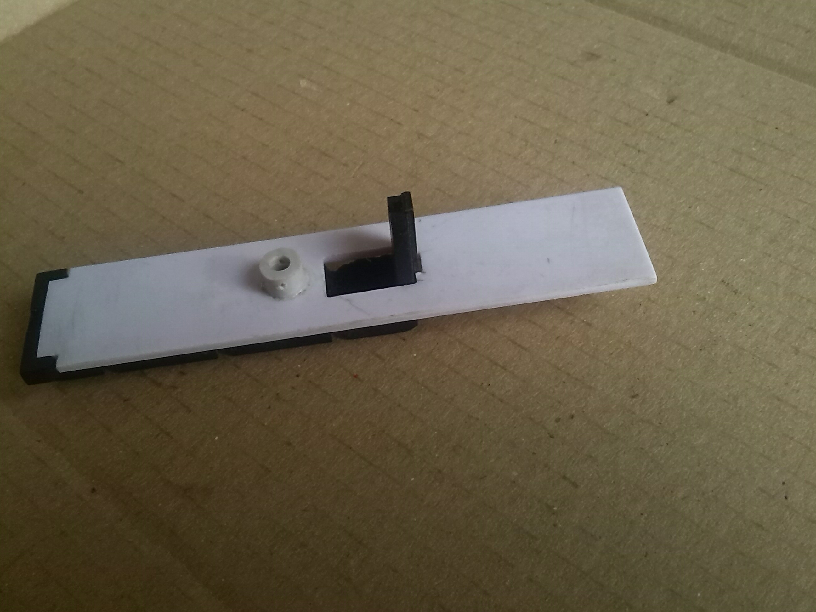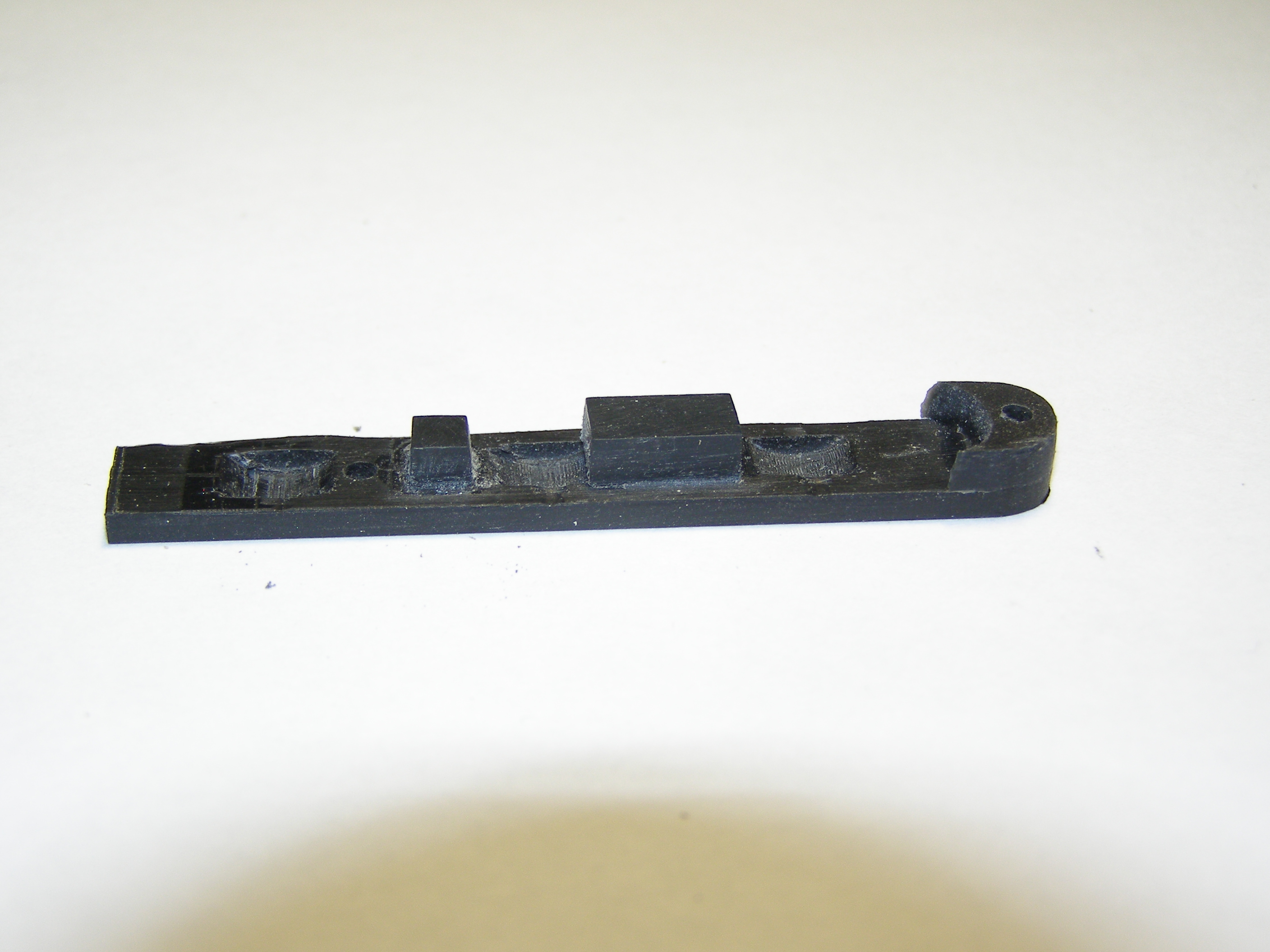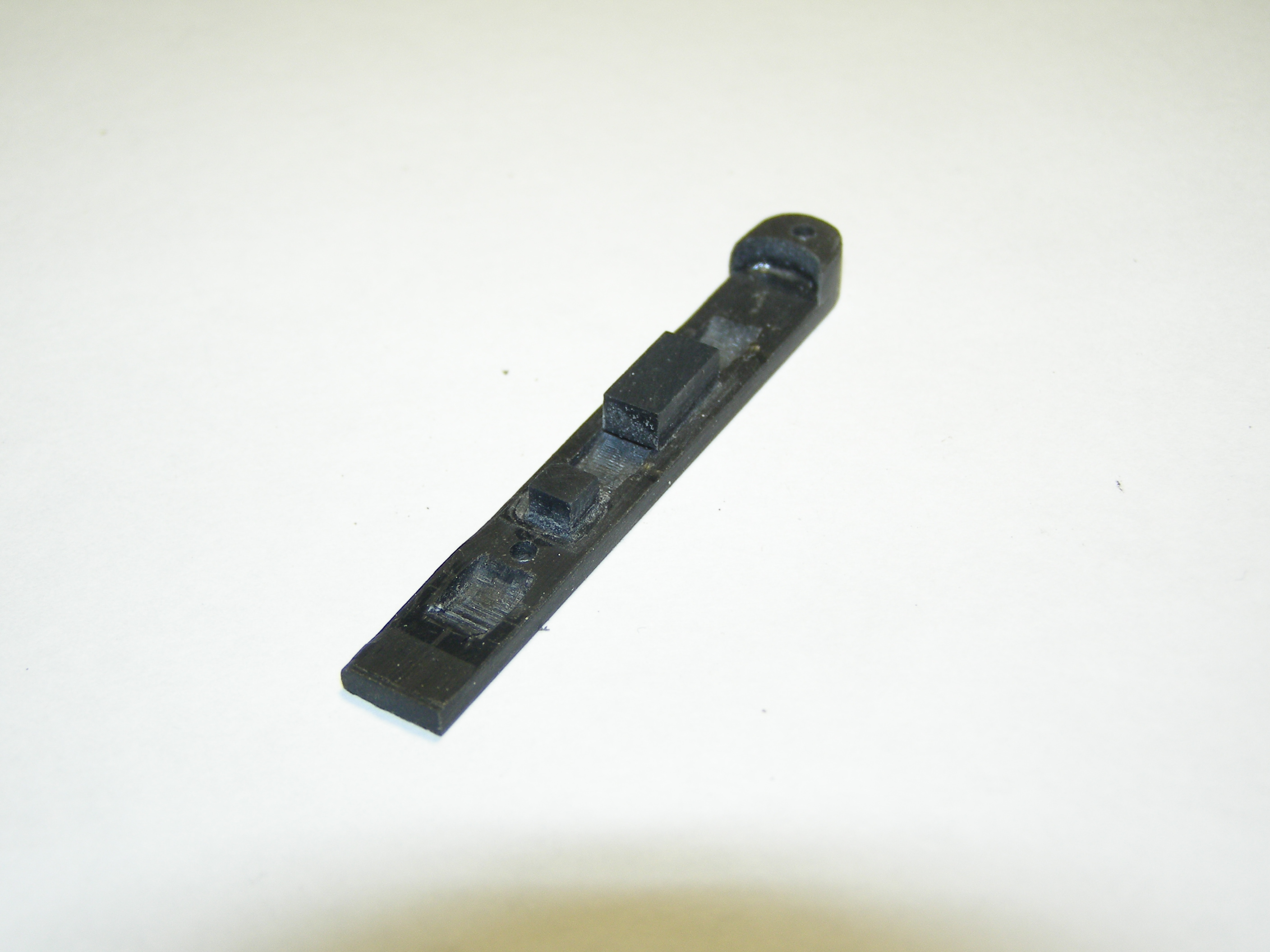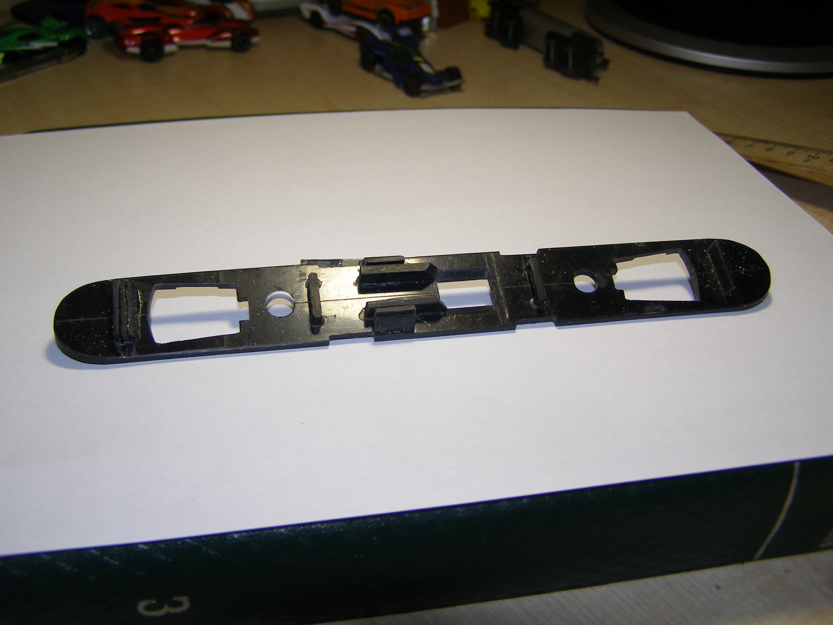 У рамы удалил все лишнее, получилось вот такое: Сделал две пластины с вырезом под гайку, куда будет заворачиваться винт, который скрепляет крышку и переднюю двухосную тележку. Приклеил ее к раме. Вклеил в раму гнездо для подшипника, так как решил делать два ведущих колеса и длина вала уменьшилась. Вырезал верхнюю пластину, вклеил ось Пластину приклеил к раме