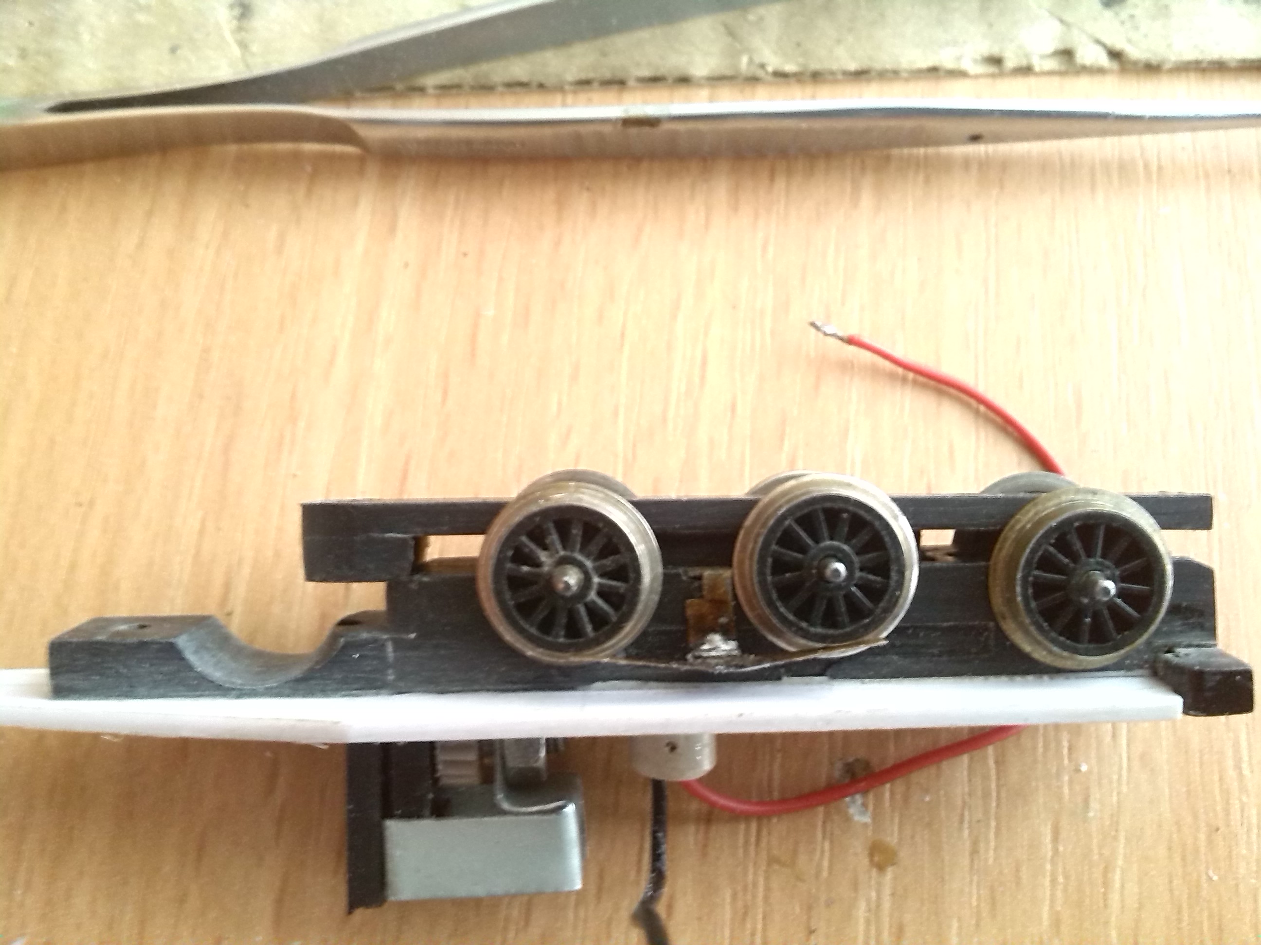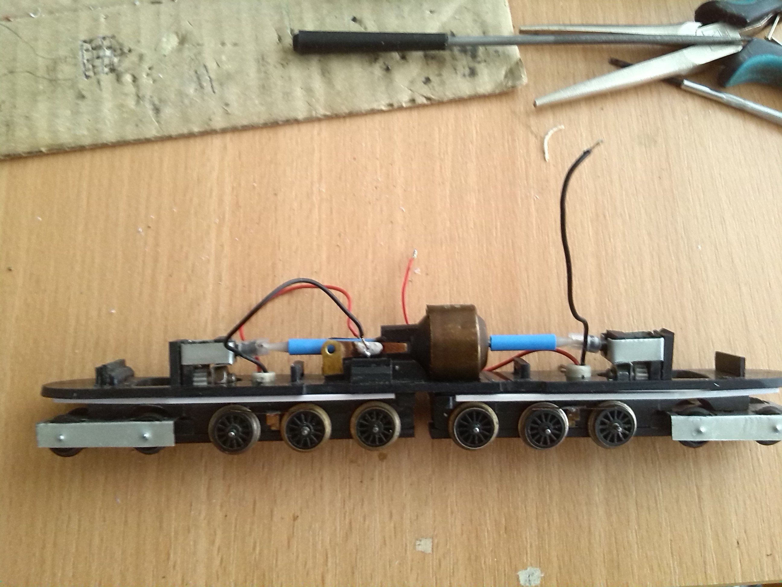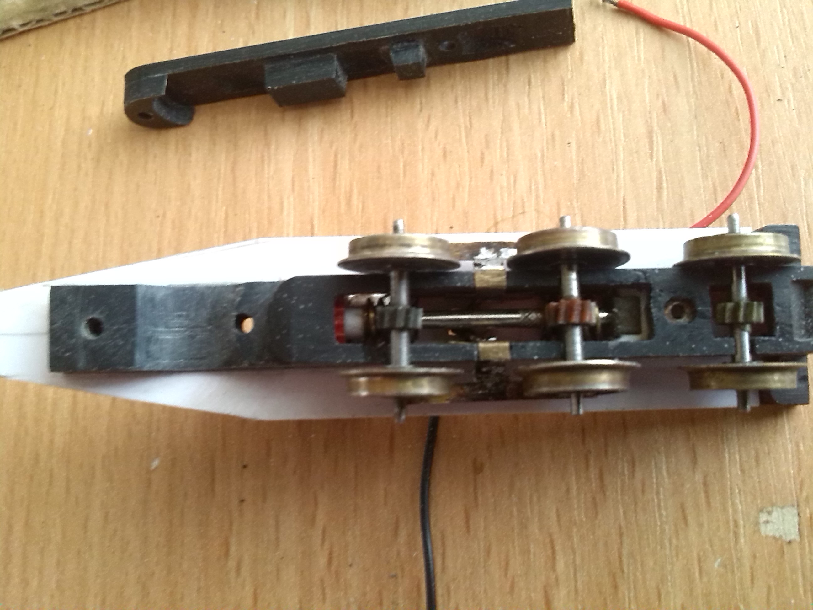 Планировал использовать два двигателя - по одному на каждую тележку. Двигатели такие как я использовал для локомотива Siku (тема http://oef.com.ua/viewtopic.php?f=46&t=732). Колесные пары взял от синего электровоза из стартового набора - они подошли по размеру да и по фактуре. Вообще должен заметить, что стартовые пиковские ТТ-ные локомотивы - электровоз и паровоз, вот эти хороший источник запчастей: двигателей, червяков, колесных пар, подшипников и т.д. Их осталось много после Союза и они не дорогие. Продают их в большинстве случаев убитыми, в качестве лома. Вот пришлось какое-то время их искать и покупать чтобы набрать 6 колесных пар да еще пару вагонов, колесные пары которых пошли на передние тележки. Сделал я раму, тележки с приводами и редукторами. Конструкция получилась такая нестандартная, особенно в плане сборки. Но что-то перемудрил с редукторами не было подходящих шестеренок чтобы влезли в габариты - линия вала двигателя - линия вала червячной передачи в тележке. Да и сами передачи на одной тележке немного клинило - наверное вал на котором насажены червяки был немного кривой. Моторы тоже оказались слабоватыми для такого локомотива. В результате намучился с этим всем и забросил. Стал ждать вдохновения и технологического прорыва. Завтра, т.е уже сегодня продолжу.