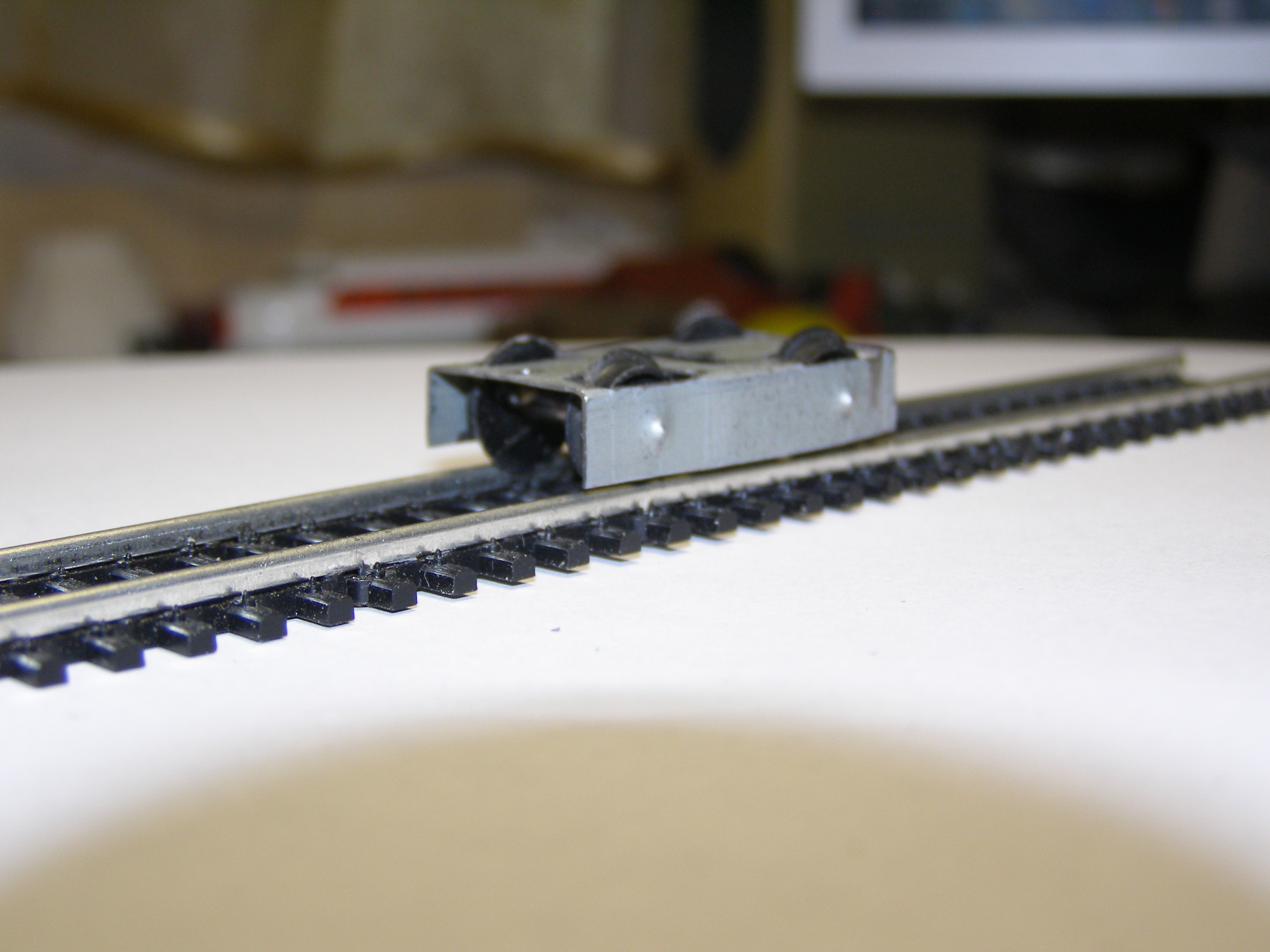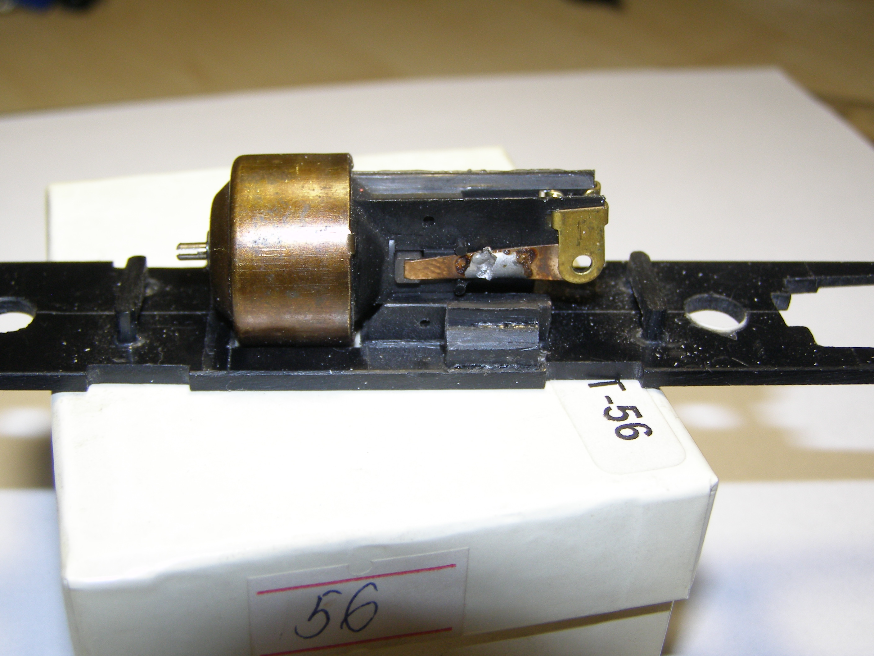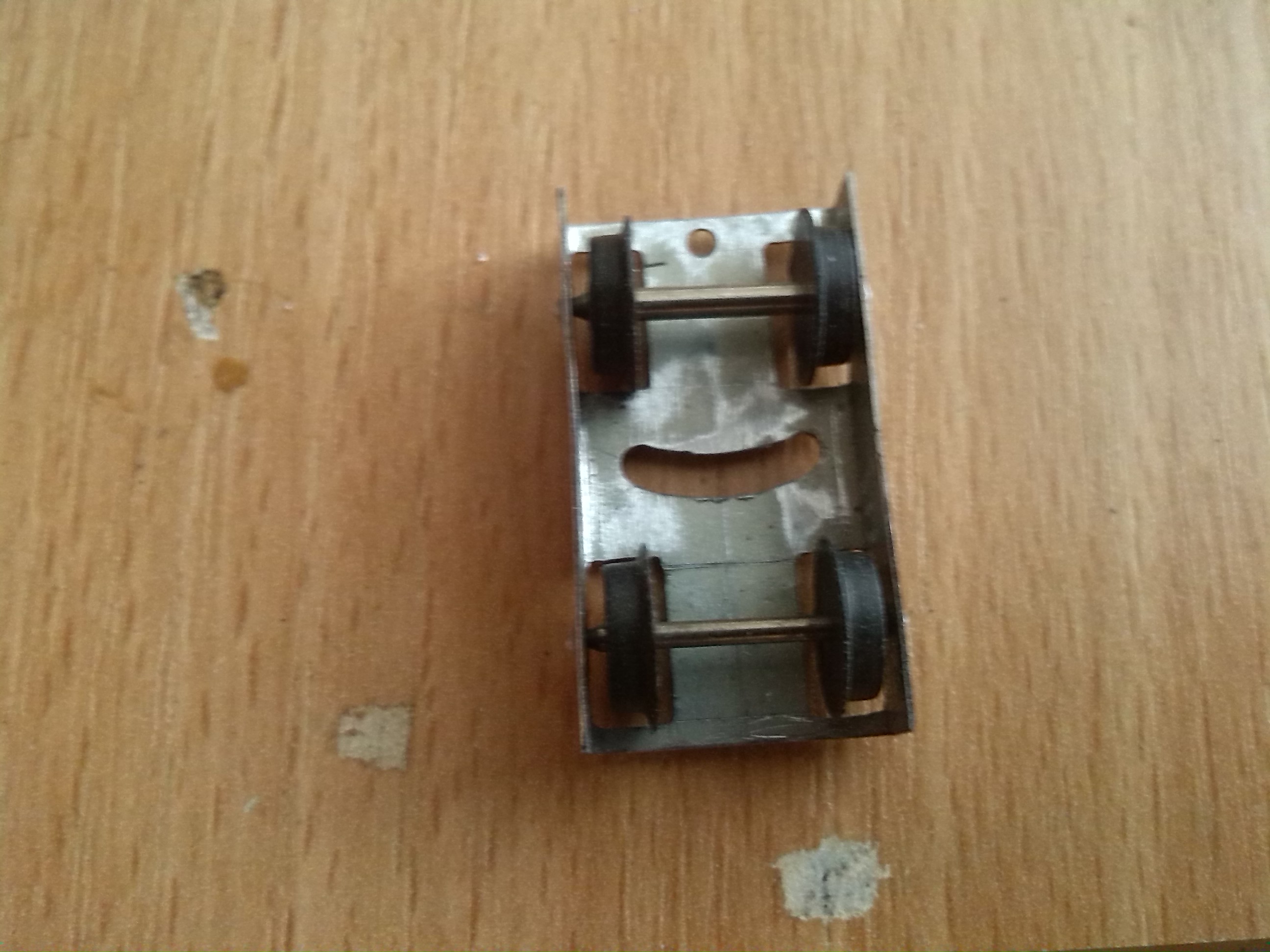 Планировал использовать два двигателя - по одному на каждую тележку. Двигатели такие как я использовал для локомотива Siku (тема http://oef.com.ua/viewtopic.php?f=46&t=732). Колесные пары взял от синего электровоза из стартового набора - они подошли по размеру да и по фактуре. Вообще должен заметить, что стартовые пиковские ТТ-ные локомотивы - электровоз и паровоз, вот эти хороший источник запчастей: двигателей, червяков, колесных пар, подшипников и т.д. Их осталось много после Союза и они не дорогие. Продают их в большинстве случаев убитыми, в качестве лома. Вот пришлось какое-то время их искать и покупать чтобы набрать 6 колесных пар да еще пару вагонов, колесные пары которых пошли на передние тележки. Сделал я раму, тележки с приводами и редукторами. Конструкция получилась такая нестандартная, особенно в плане сборки. Но что-то перемудрил с редукторами не было подходящих шестеренок чтобы влезли в габариты - линия вала двигателя - линия вала червячной передачи в тележке. Да и сами передачи на одной тележке немного клинило - наверное вал на котором насажены червяки был немного кривой. Моторы тоже оказались слабоватыми для такого локомотива. В результате намучился с этим всем и забросил. Стал ждать вдохновения и технологического прорыва. Завтра, т.е уже сегодня продолжу.
