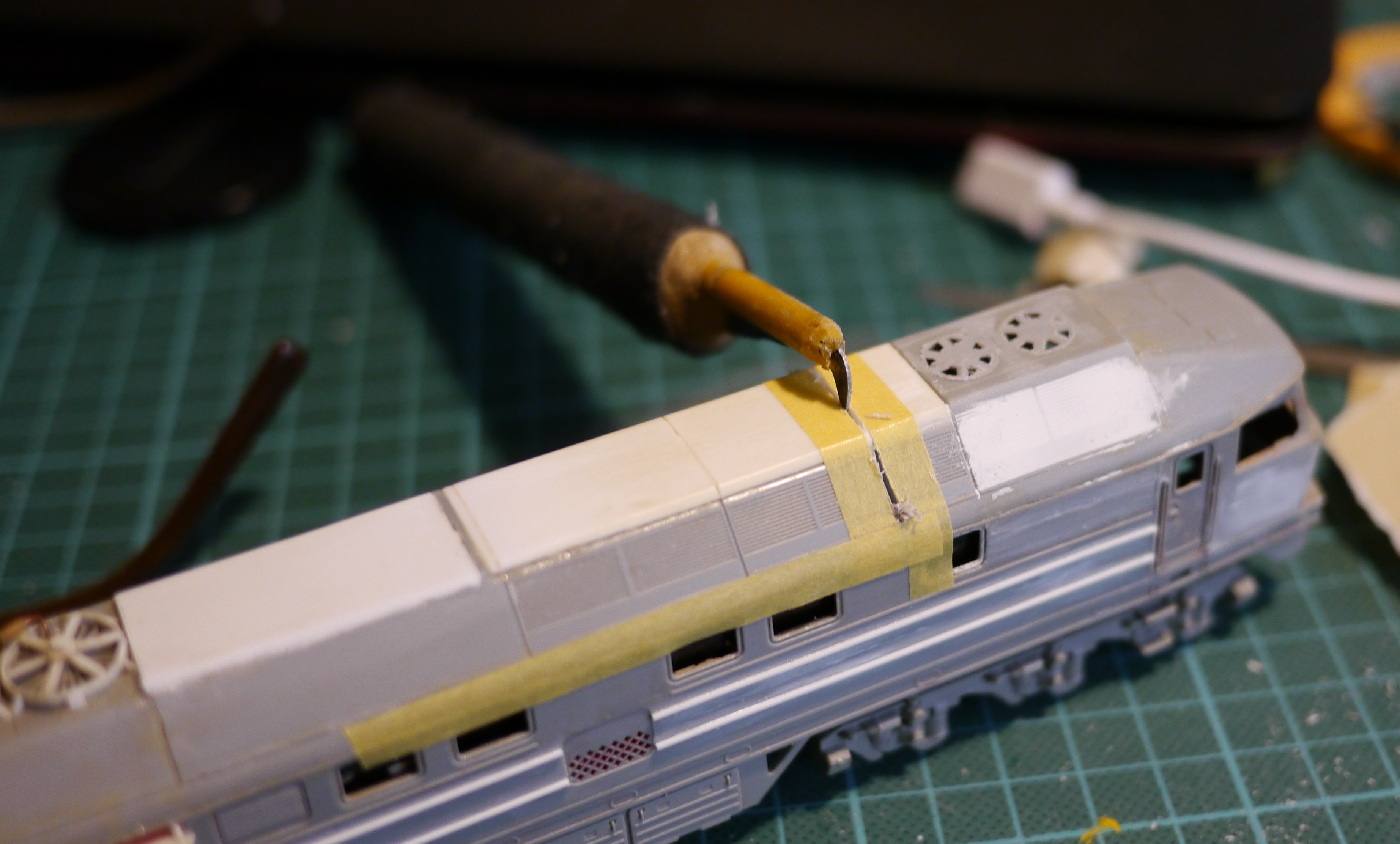 На фото видно, что вентиляторы реостатного тормоза сточил, а решетки по бокам от них - зашпаклевал. Затем установил заранее приготовленные элементы.