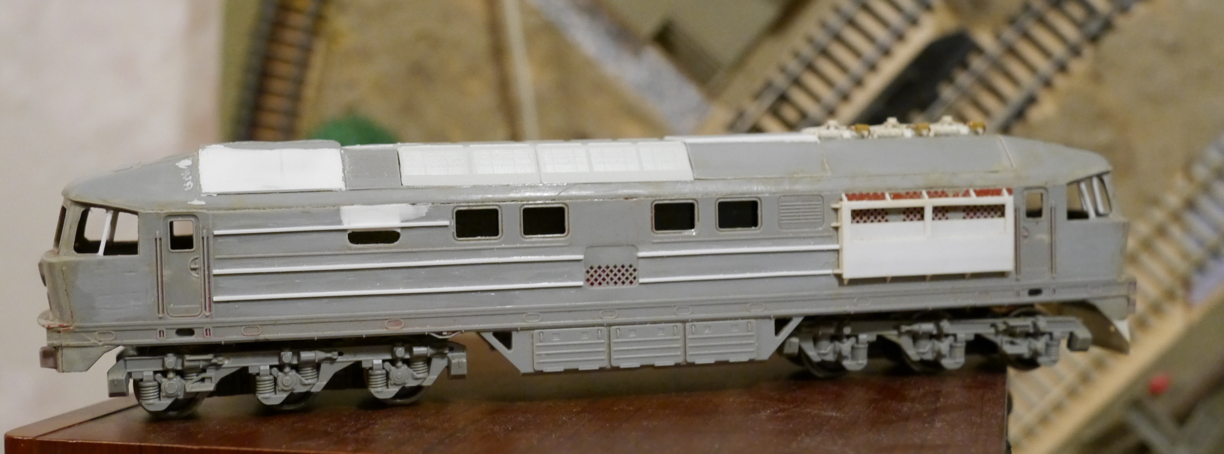 Пока что вожусь с крышей. Внимательное рассмотрение фотографий показало, что расположение решеток на скатах крыши не такое, как на 130-х. Также нет реостатного тормоза и его вентиляторов. Отсутствует глушитель. Честно говоря, даже приуныл слегка... думал оставить как есть. Но выручил Stinky, у которого были детали крыши из аналогичного набора Revell. Решился на перепил.