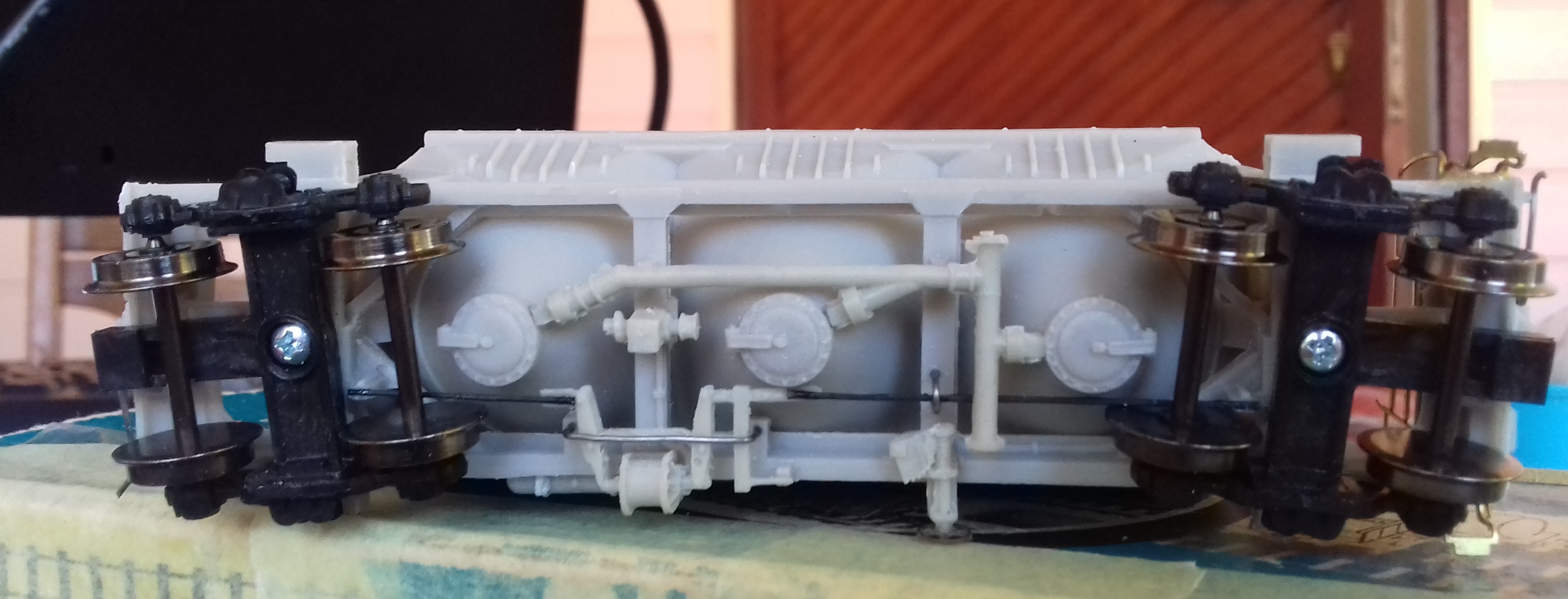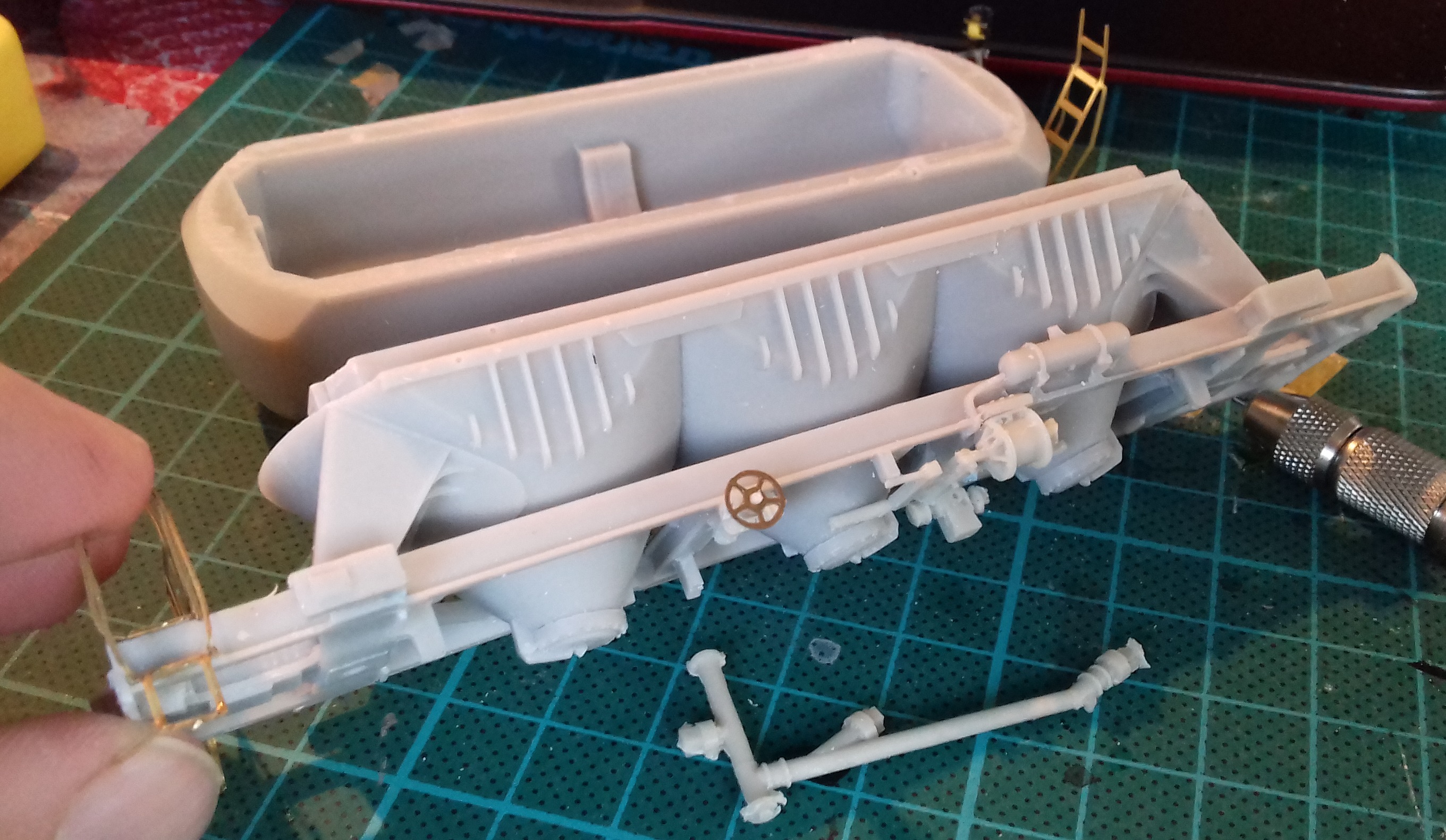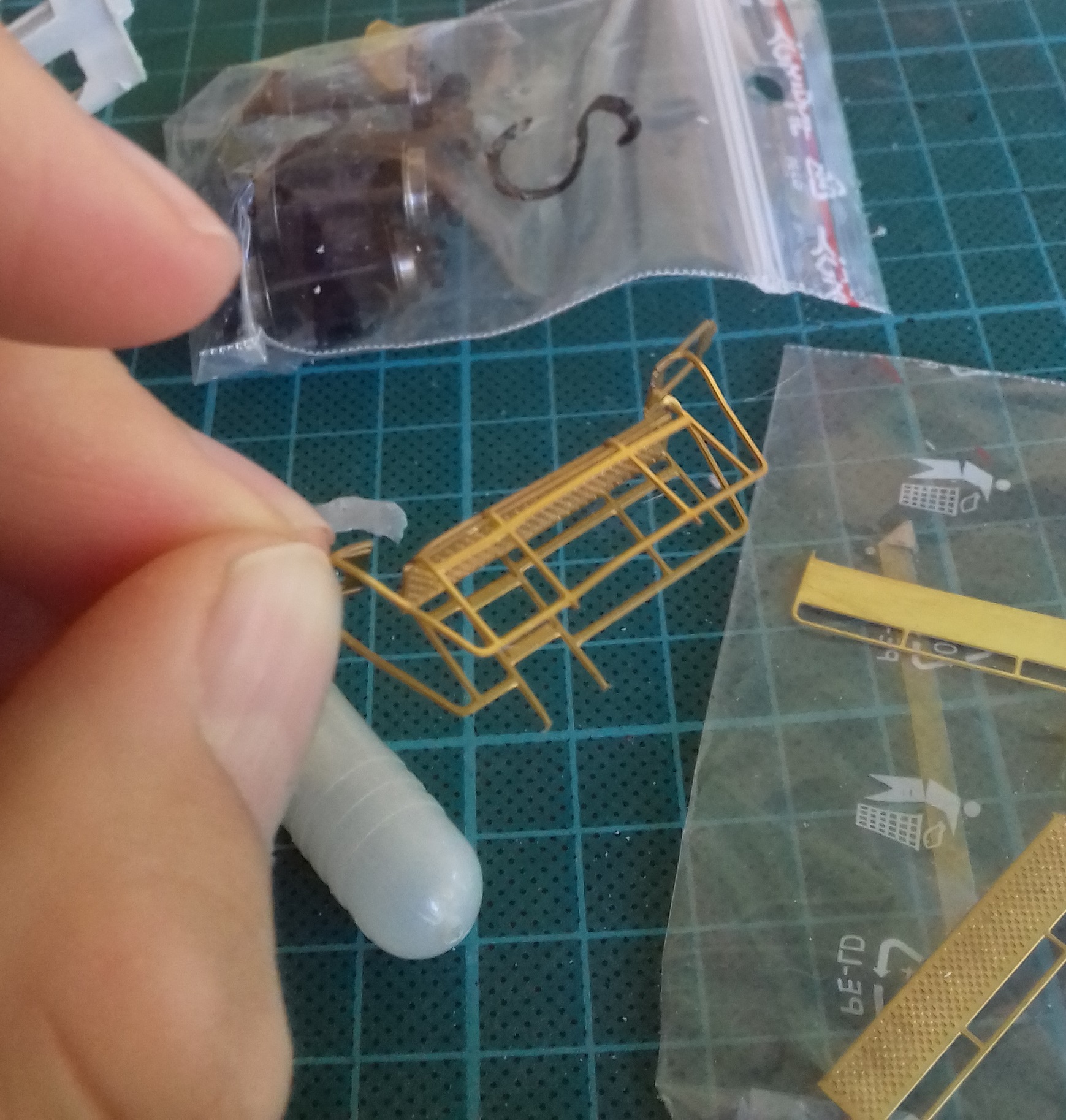 Обилие травла сначала испугало. Памятуя попытки работать с тем, что вкладывает в киты Камушкин и Бражник, ожидал длительного интима. Однако ничего подобного: материал толще и не ломается с первой попытки его гнуть. Оказалось, травлёные детали хорошая штука, если они не говно. Пришлось повозится, очищая от облоя трубопроводы. Качество литья не ахти, но с этим тоже как-то справился. Также понадобилось изготовить воздухопровод сброса давления (именно его не хватало). Взял толстую проволоку и кусок пластика. Вышло грубовато, но увы - выготовить столь мелкие элементы пока не под силу.