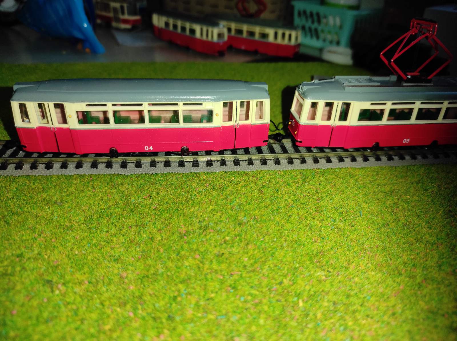 собрал пару трамваев на заказ,первый обычный вариант с голубой полосой,второй был расклеян и собран заново,в каждом вагоне кабина управления, полосу сделал серебристую-на подобии Евпаторийской готы с двумя кабинами в разных вагонах