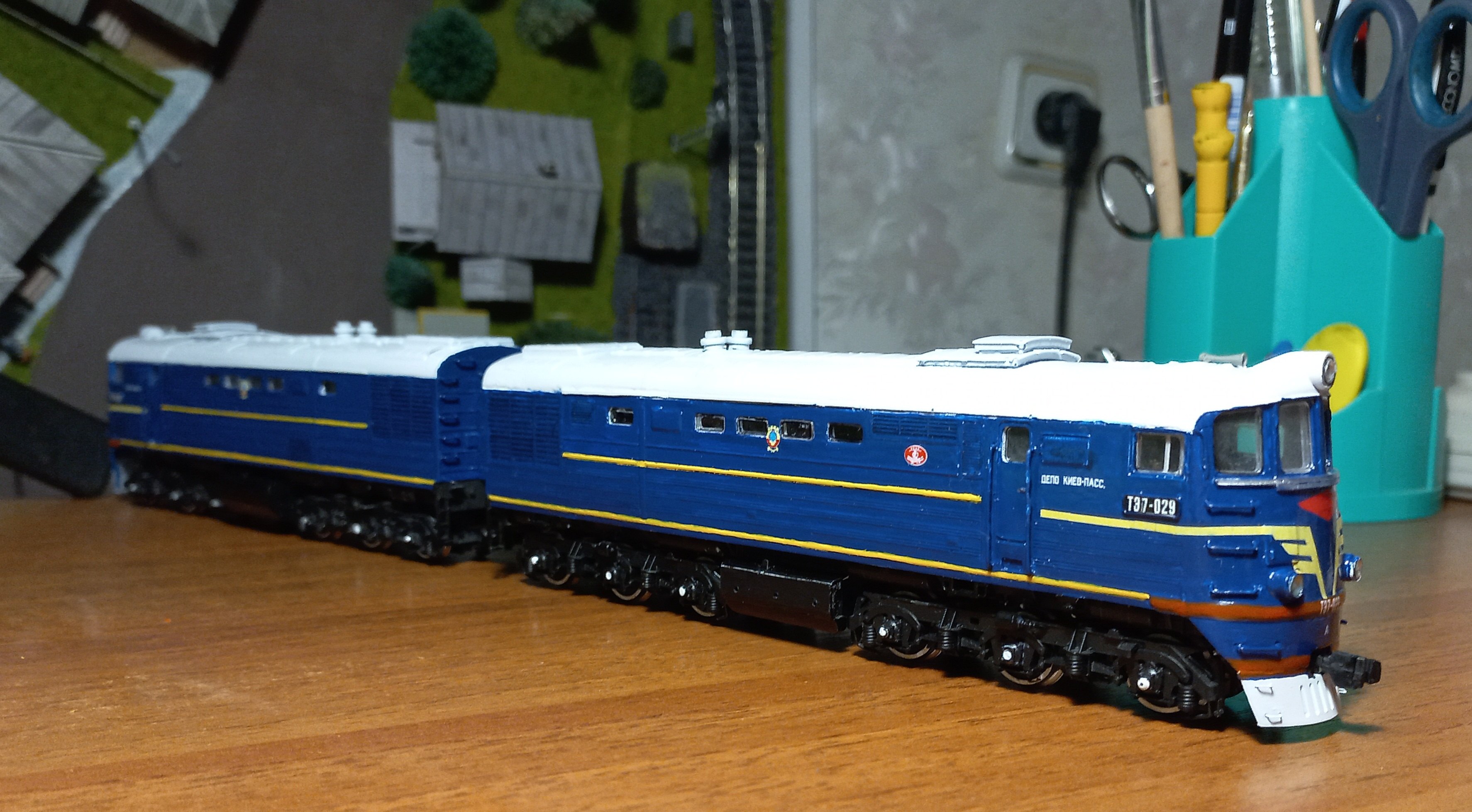 Повернемося до багатосраждального лока. Перефарбувати для різноманітності вирішив у ТЕ7. Пасажирську версію трійки, яка була колись у київському депо. Візульно такий самий тепловоз, крім фарбування та молдінга під лобовими. Залишки фарби (так, вона все ще не покинула нас) відтирав, як раніше, серветками у спирті. Але не довго старався, бо якщо вже смола потекла, а фарба ні - то будемо вважати її грунтом. Тільки піддув resin primer AK, щоб більше не лізли оті глянцеві залисини. Далі все як завждти - "тамієвські" фарби під пензлик, декалі, лак. Що вийшло, можете побачити на фото. Капцями по бажанню можна кидати, але не сильно, бо то був майже жмур.