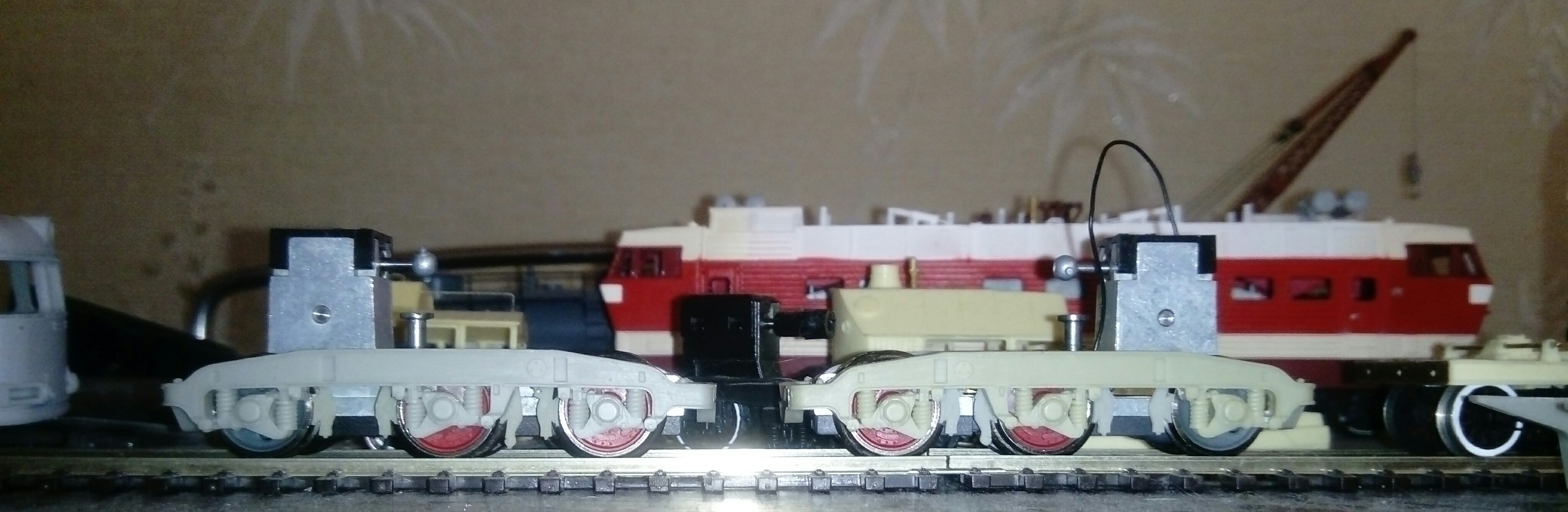 Вот вырисовывается тележка ТЭП70. Пока вся имитация висит на колодках, которые обнимают колеса. Крепление у Е103 имитации к тележке простое, буду делать такое же, выставив уровень осей к центру букс.