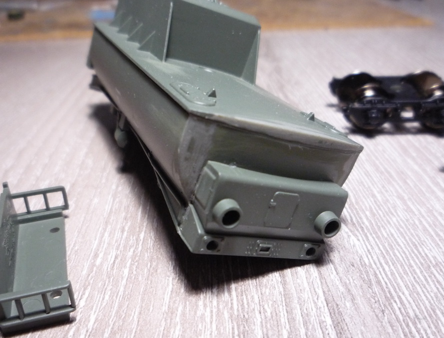 Подходит к концу работа над вагоном с грузами. Раздеребанил тендер. Отлит он, кстати, не из полистирола, а из АБС. Срезал лестницы, трубу, зачищаю облой, стыки прессформ ну и т.д..