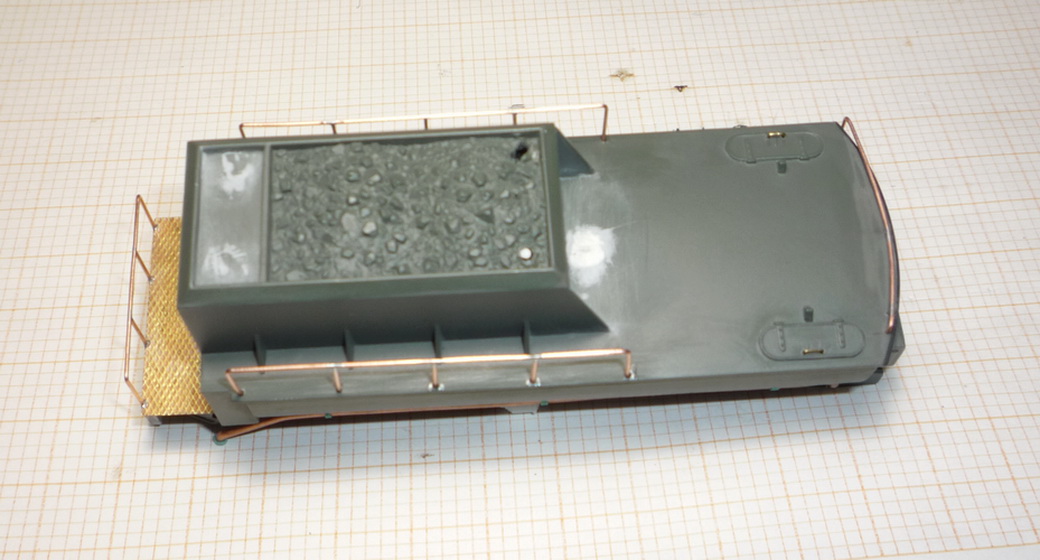 С тендера снял все приклеенные детали, с левой стороны срезал трубу, снизу - всю проводку, лестницы спереди и сзади, трубу сзади справа.