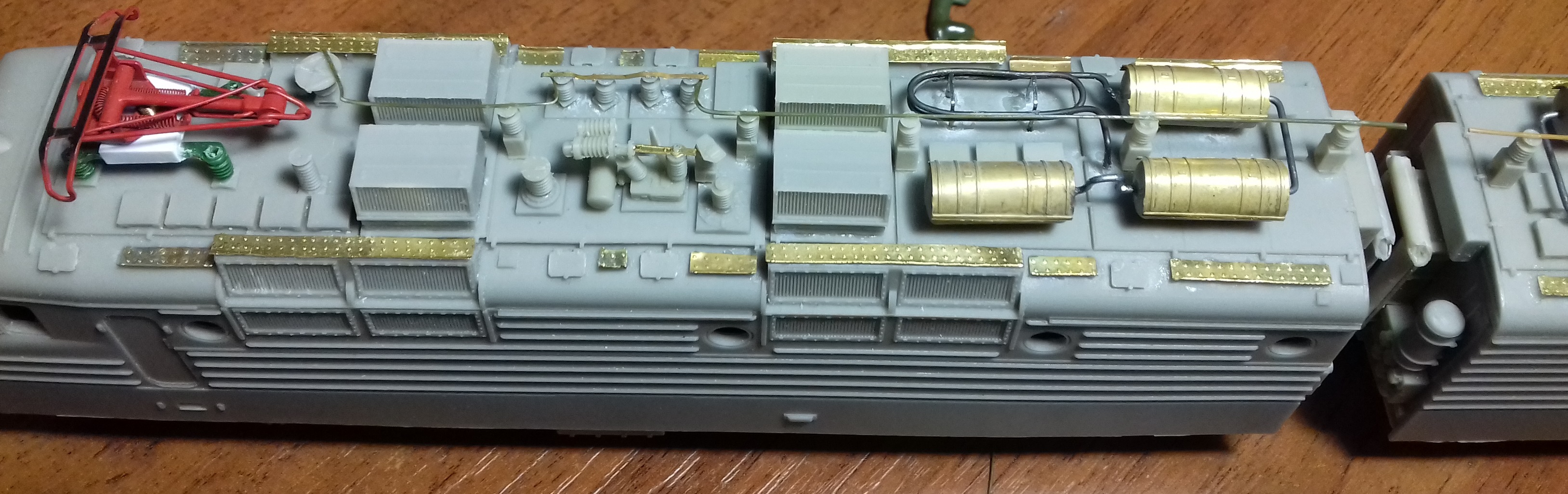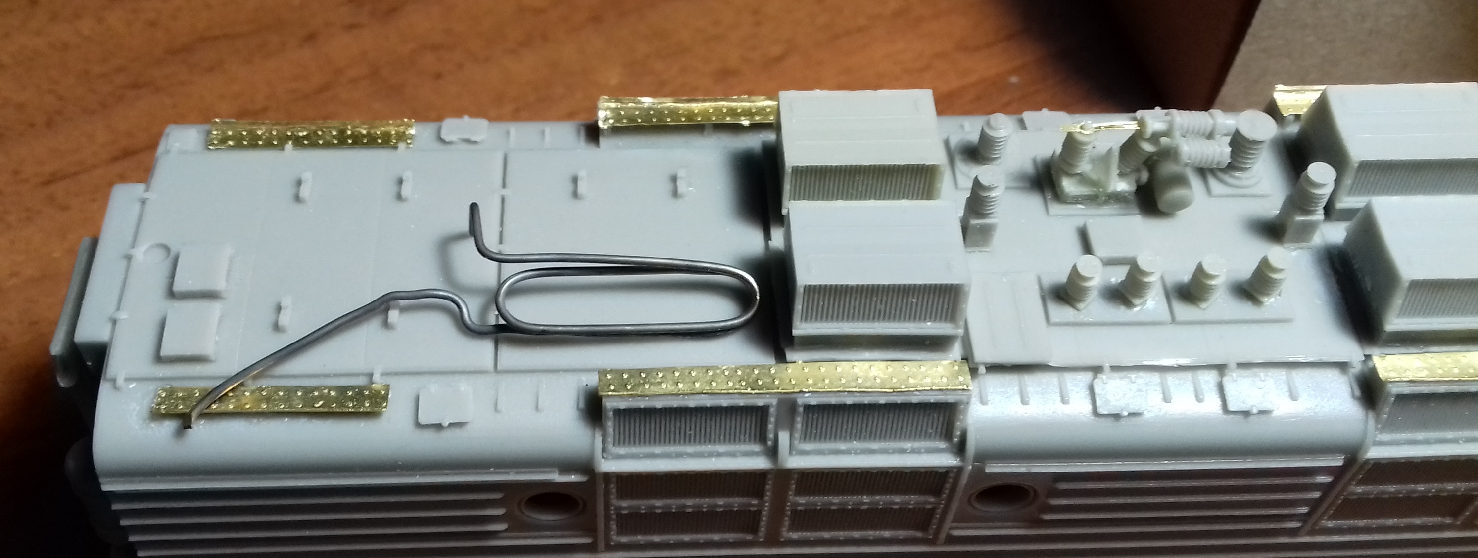 Довольно много возни было с крышей. Думал, из чего сделать токоведущие шины: проволока или тянутый литник. Остановился на последнем, так как он лучше держит краску. Не хочется все время подмазывать облезающую проволоку. Конечно, с ним тоже есть нюансы - места сгибов "слабеют", потому нужно гнуть аккуратно. Но в случае чего замена несложная. Да и если зацепишь, скорее всего порвешь литник. А не сорвешь половину изоляторов вместе с проволокой.