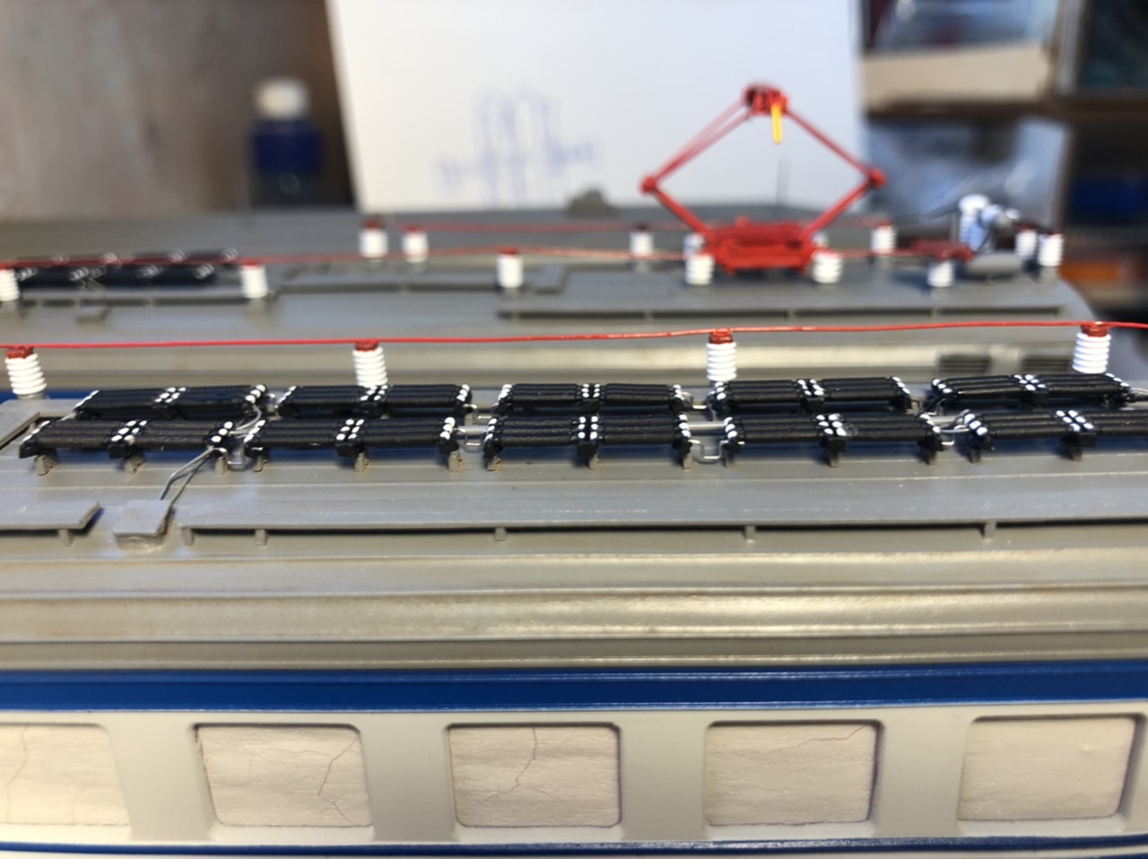 Ранее в группе вк описывал некоторые доработки, которые касались крыши, повторюсь еще раз. После того как приклеил изоляторы и сопротивления, решил имитировать еще токовидущие шины и перемычки между сопротивлениями.. более дополненной и детализированной получилась крыша.