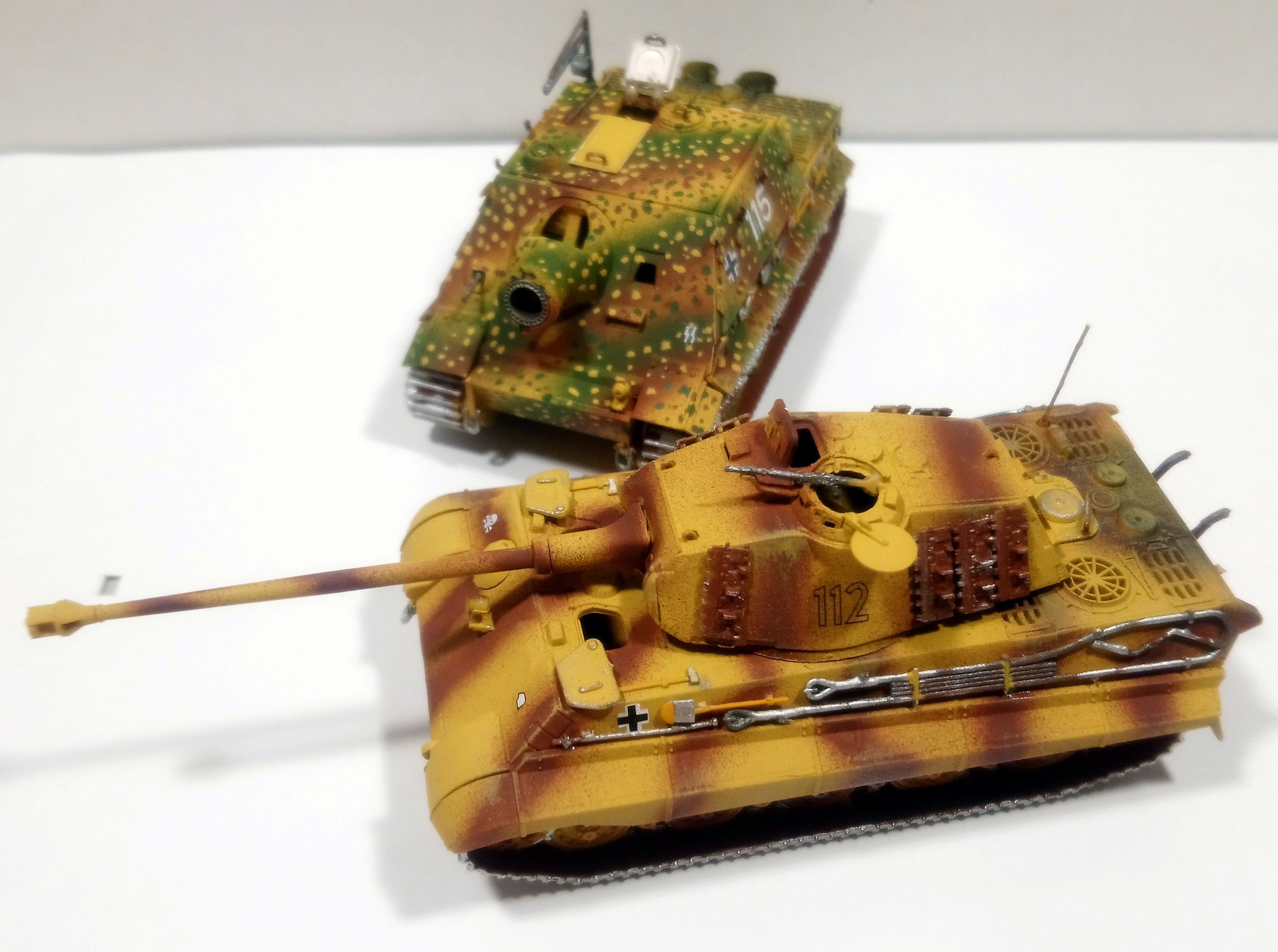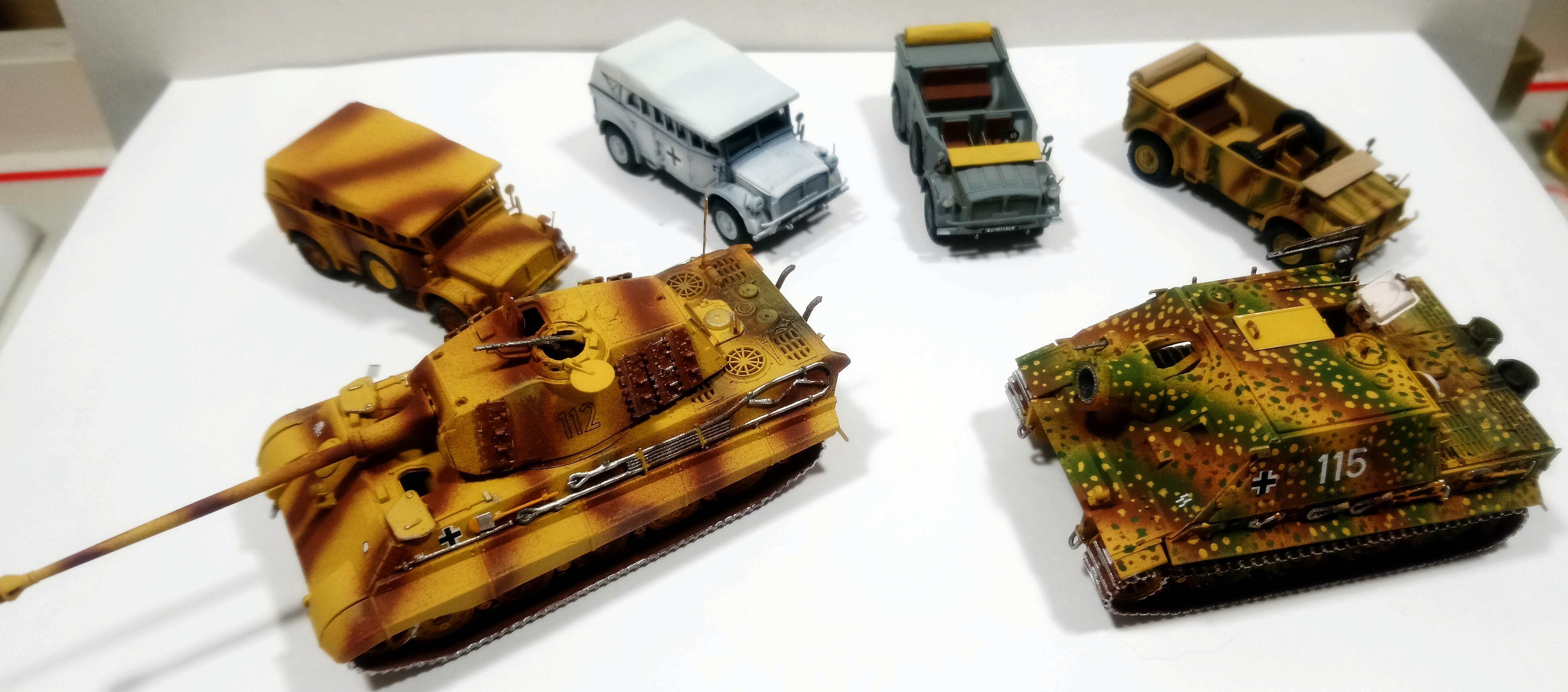люки подвижные.Моторный отсек у королевского открывается и внутри есть мотор. Полный комплект Херповских "Хорхэ".Все разные конструктивно и родом войск.(Люфтваффе,Вермахт,СС и Полицаи). Также покрашен слегка интерьер и состарено днище.