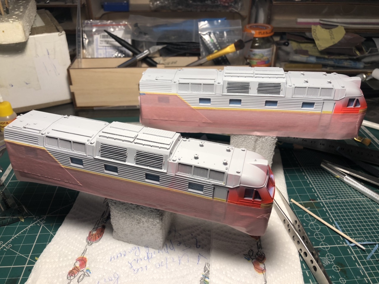 Припаял к светодиодам провода, на буферные фонари сделал шинки из металлических пластинок от фототравления, как у Сергея. В прожектор подошел отражатель от фар авто от фирмы Elf. Вырезал маски птичек на морды электровоза.. искупал оставшуюся мелочевку и кузова в фэйри и загрунтовал. Кузова пошли небольшой шагренью.., грунт использовал мотип, предварительно слив его с балона, грунтовал аэрографом, но что то пошло не так... пришлось подшкурить и завтра загрунтую их повторно из баллона