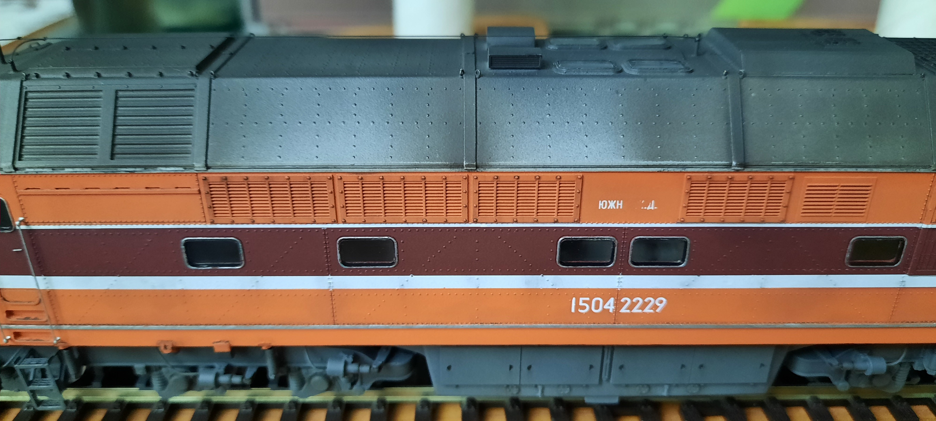 Цветовая модуляция - постепенное высветление более светлыми тонами существующего цвета. Например, задули зелёным цветом модель, а потом в несколько этапов лёгкими напылениями высветляем модель. Делается для неоднородности цвета на модели (в основном высветление идёт к верху), т.к. огромный локомотив не смотрится абсолютно в одном цветовом тоне из-за падающего на него света и теней. Приём непростой, нужно не переборщить, лишь слегка подчеркнув неоднородность цвета.