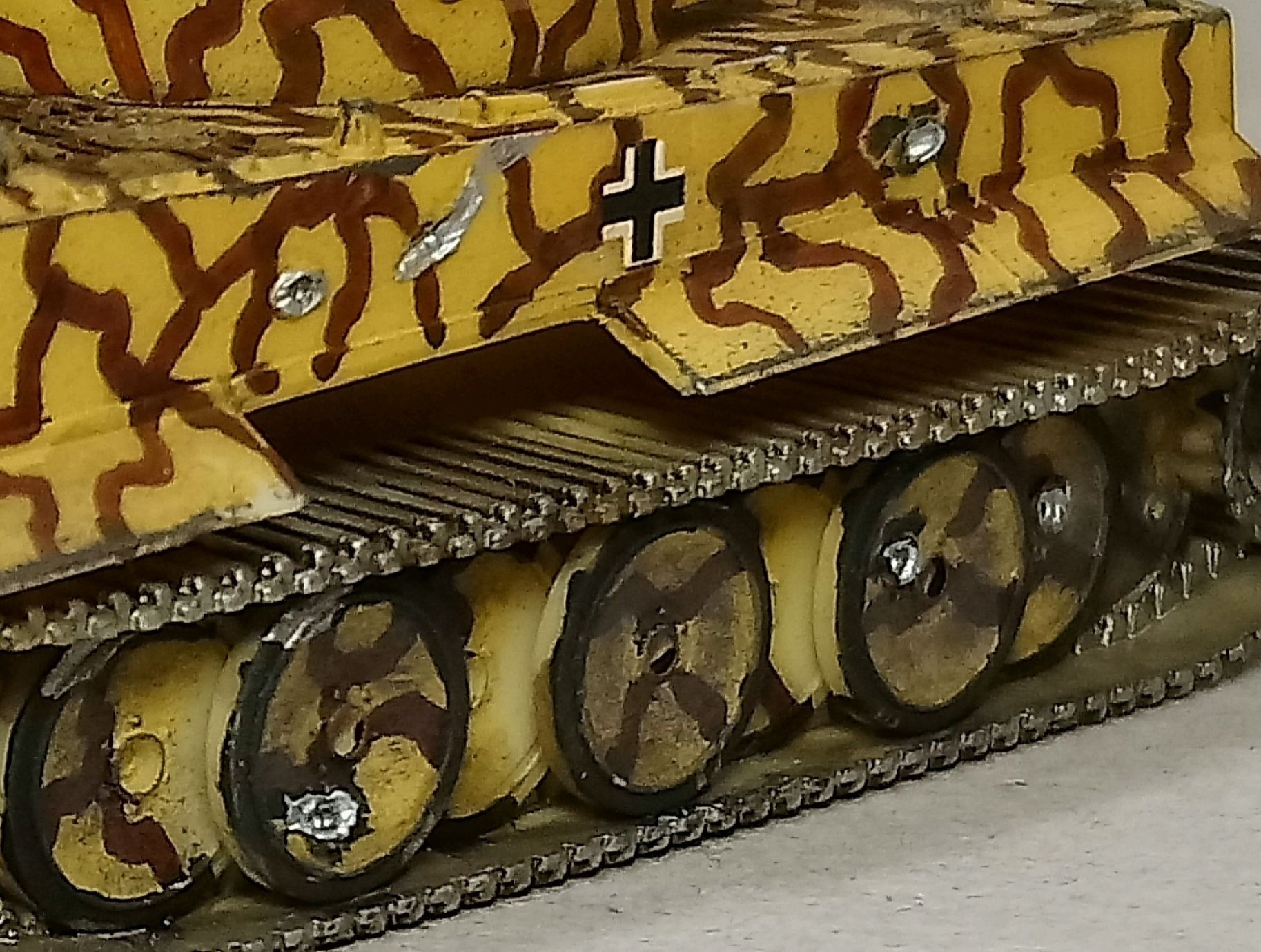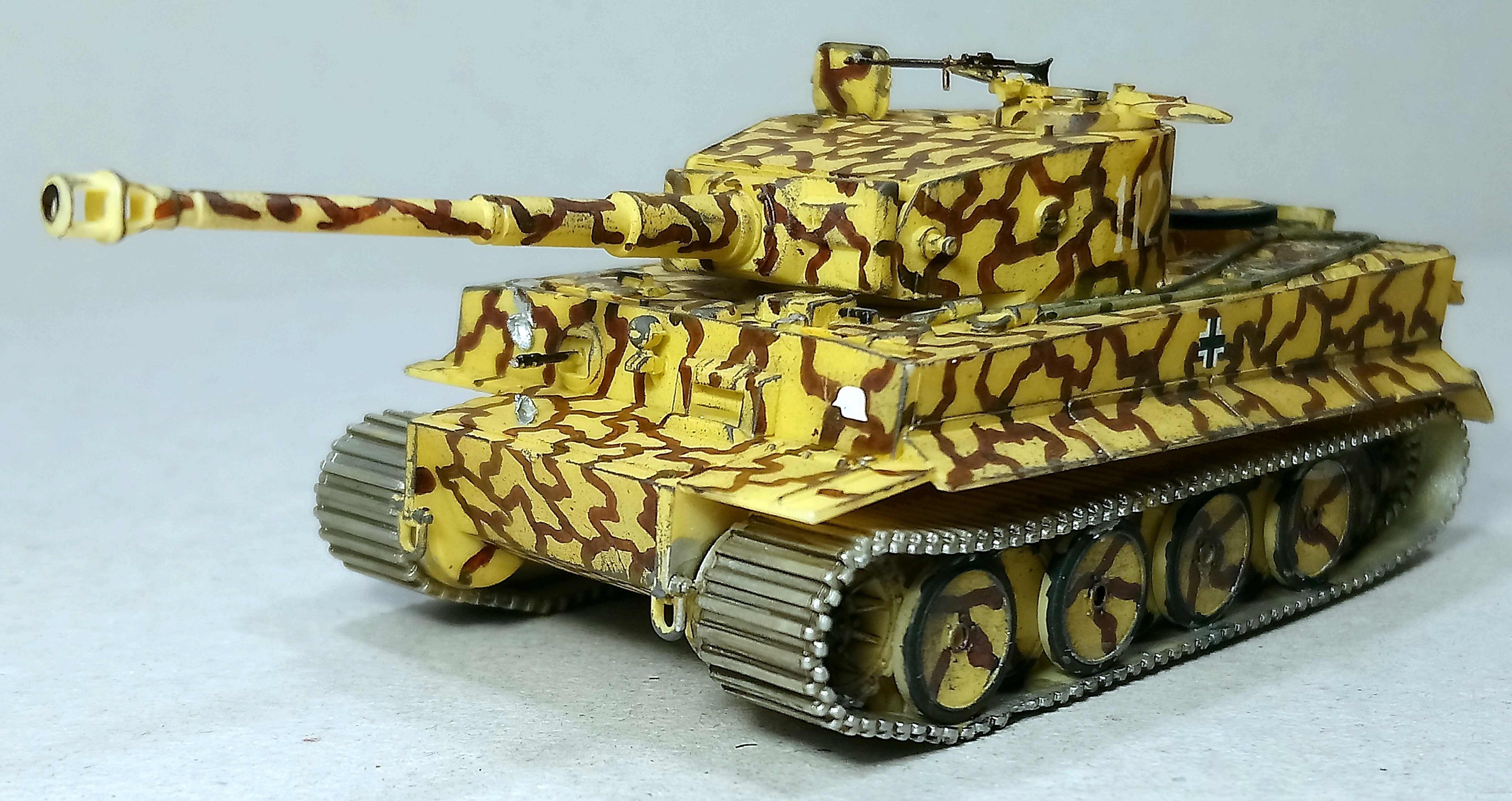 Ранний тигр с боевыми повреждениями и потерями обвеса.Отсутствует ящик на башне,один каток
