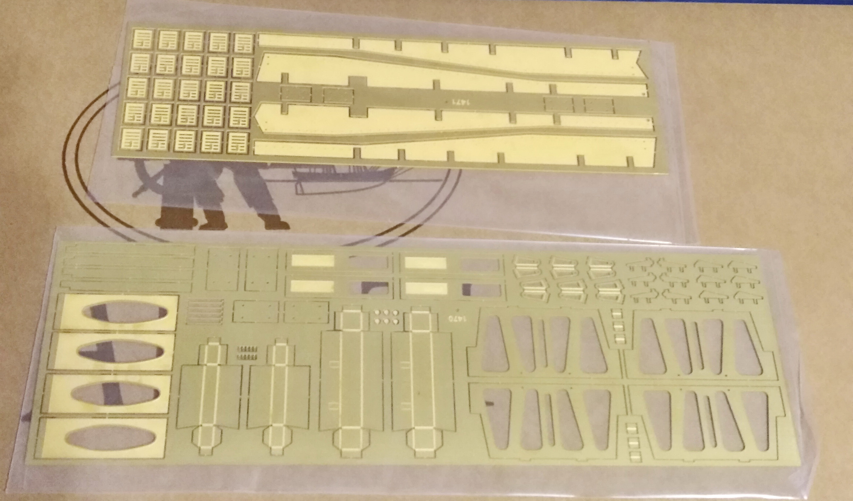 Коротко о содержимом коробки - детали из фанеры и шпона лазерной порезки, 19 плат фототравления различного размера и толщины, пакетики с литыми (из белого металла и бронзы) и точеными (латунными и стальными) деталями, латунные профили (уголки, рельсы, швеллеры), стекла (пленка, порезанная плоттером под размер оконных проемов),бумажные листы с декором на стенки купе и пол вагона, картонный с потолочными панелями, полистирольные основы диванов и стульев (также оклеиваемые бумажным декором), лист с декалями. Два листа чертежей вагона формата А0, четыре листа со схемами расположения деталей на платах фототравления и шпоновых листах (тоже А0).